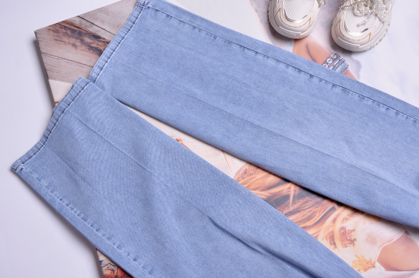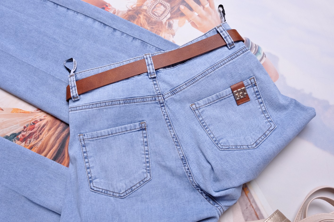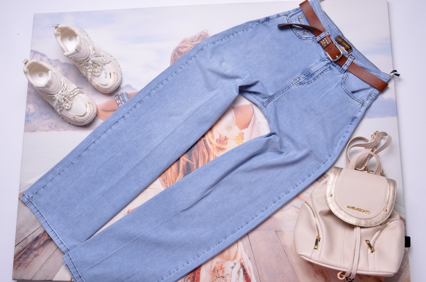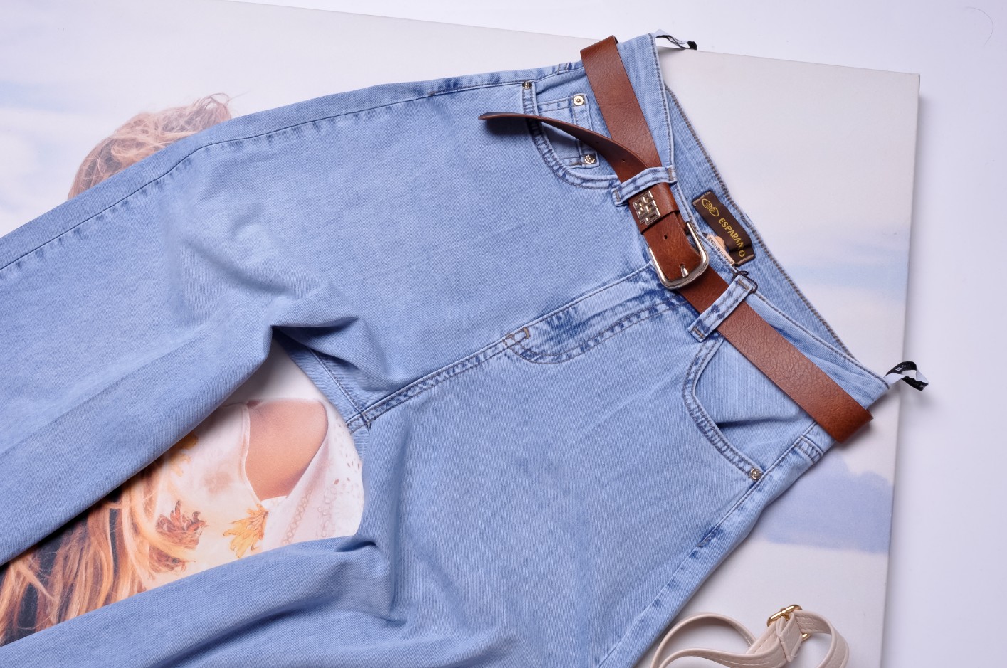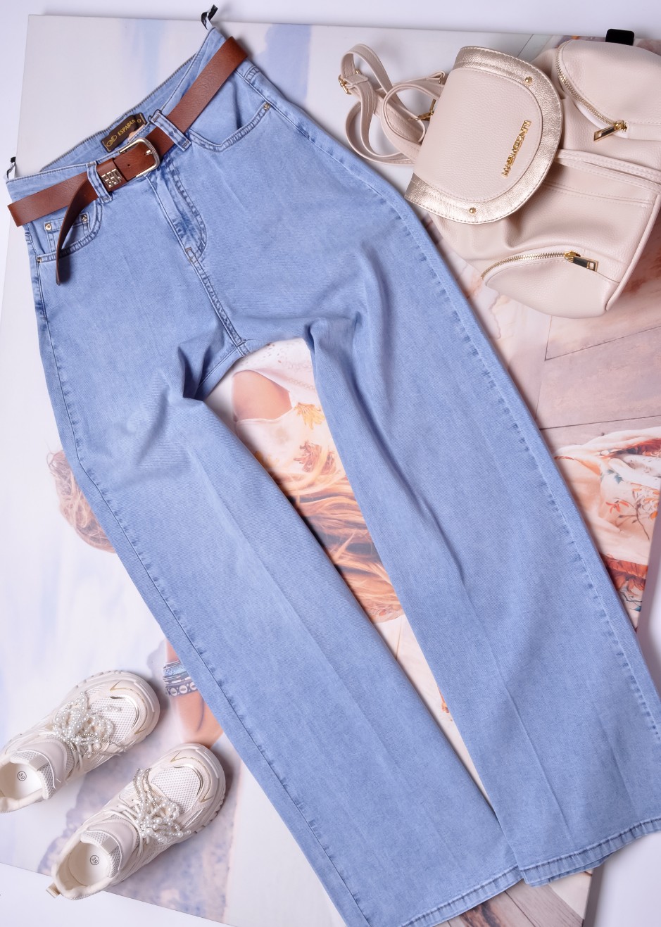 Jeden z najmodniejszych modeli spodni jeansowych w tym sezonie w jasnym odcieniu. Nogawki szeroki, proste. Wysoki stan, z przodu i z tyłu kieszenie. Do zestawu brązowy pasek.