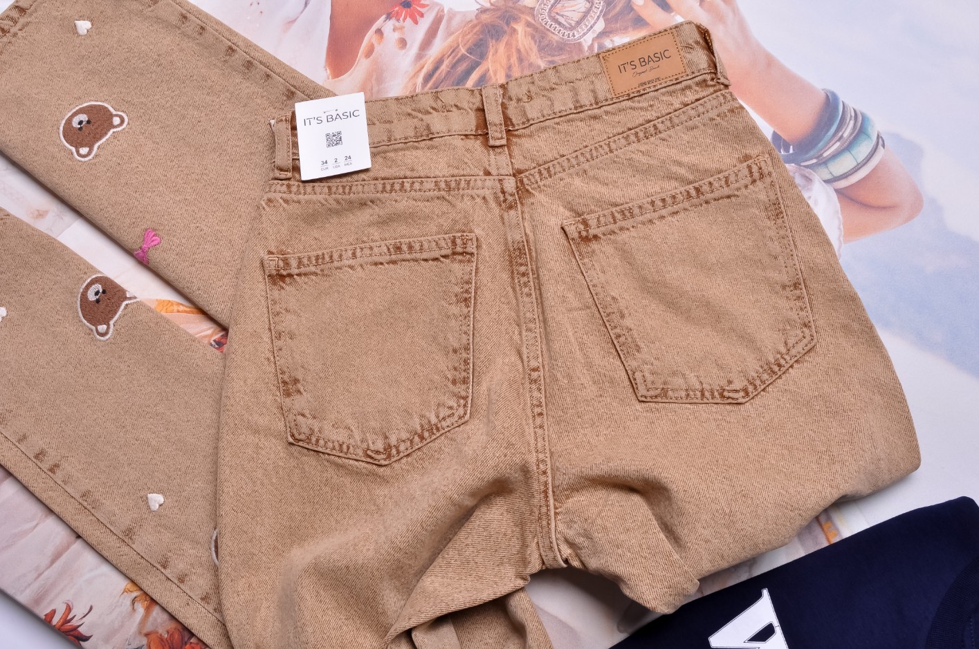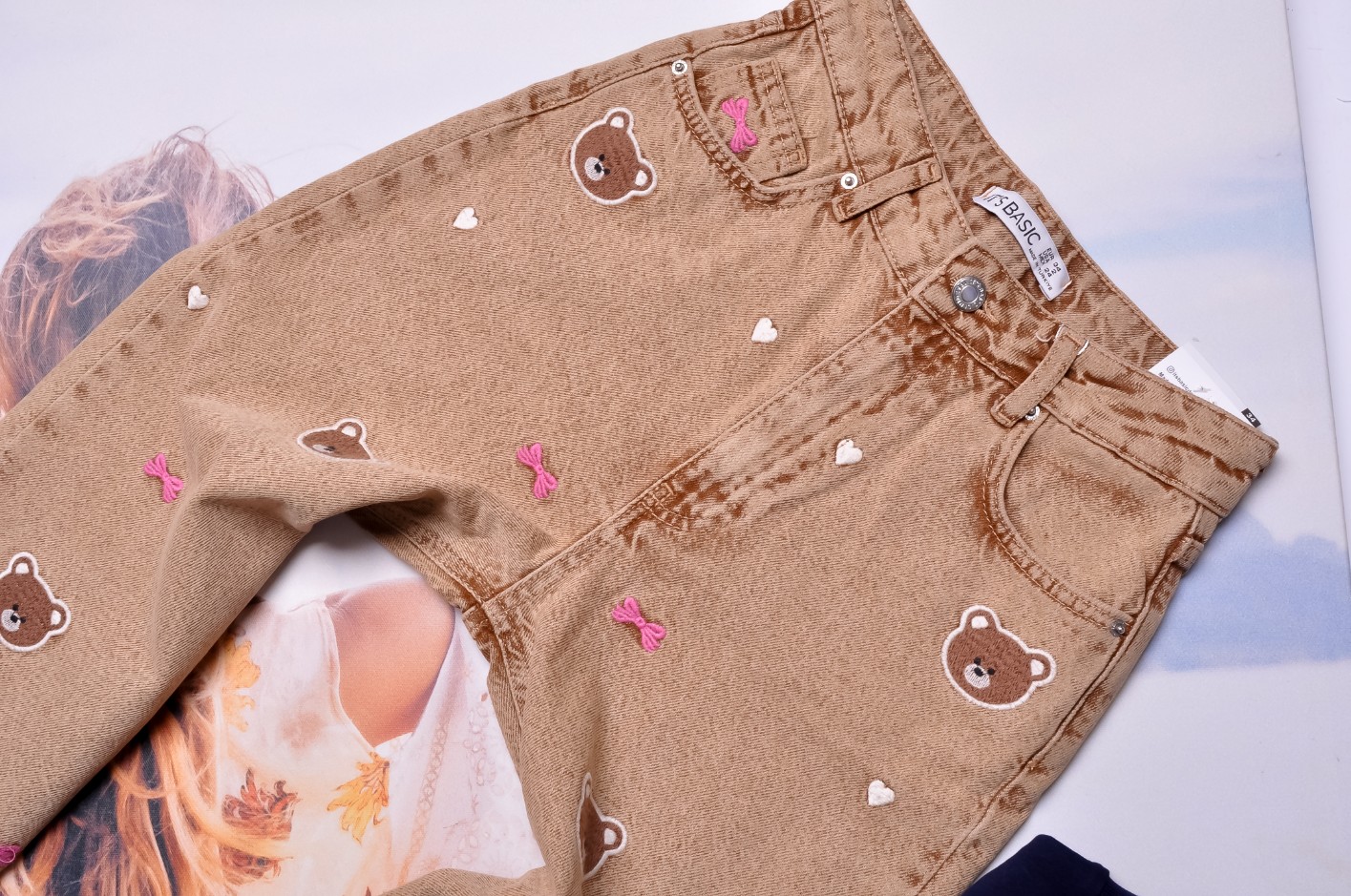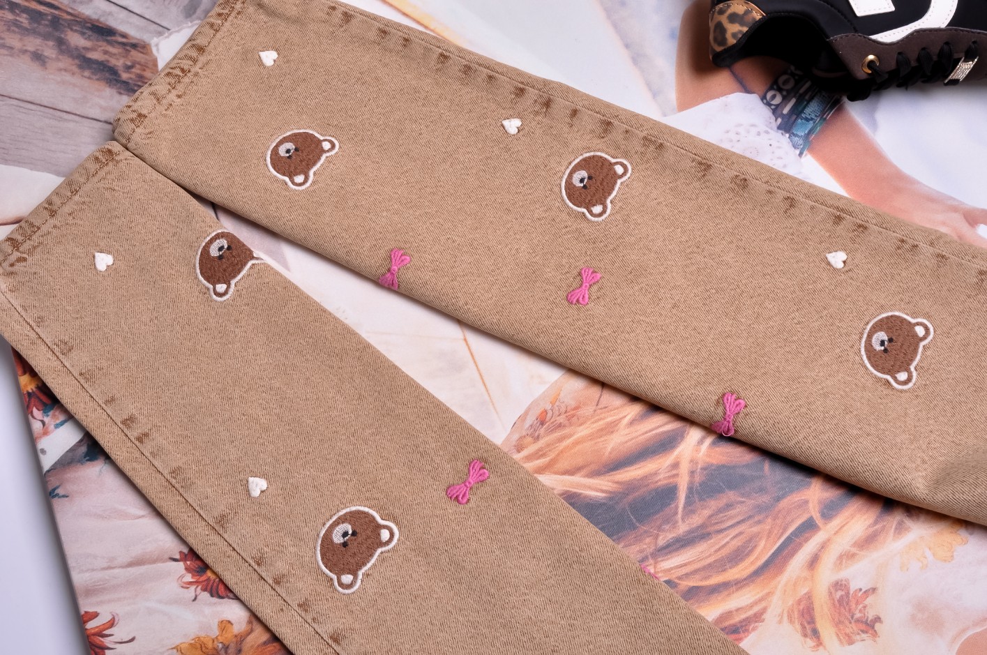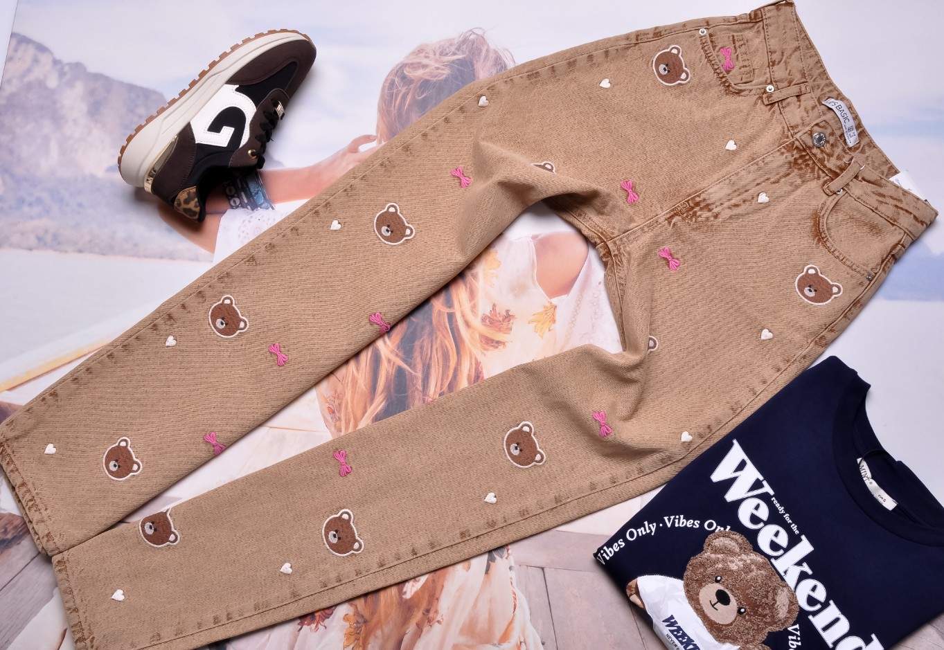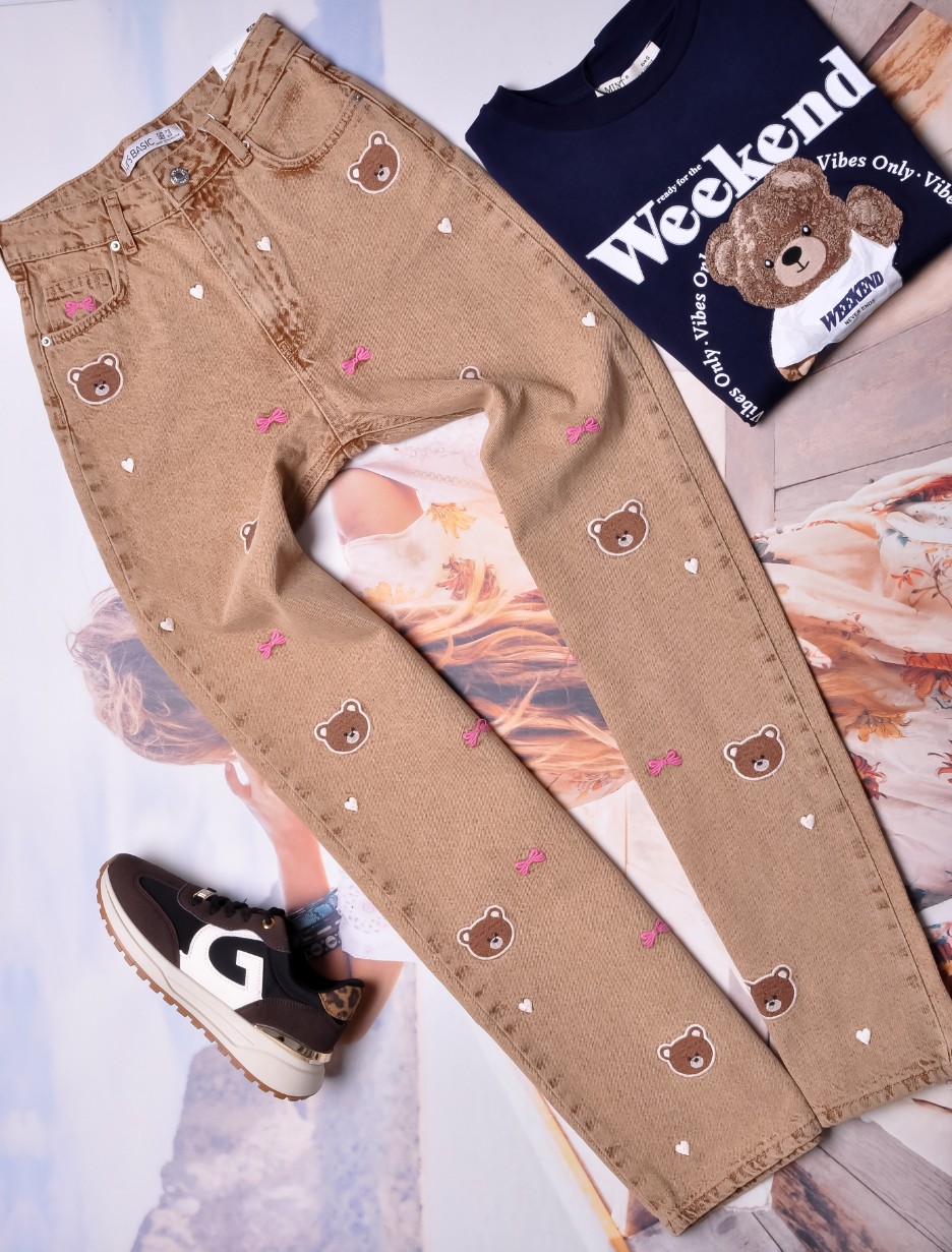 Brązowe spodnie z wysokim stanem - fason "WIDE LEG". Z przodu zdobione wyszywanymi misiami, serduszkami i kokardkami, z tyłu gładkie. Kieszenie z przodu i z tyłu.