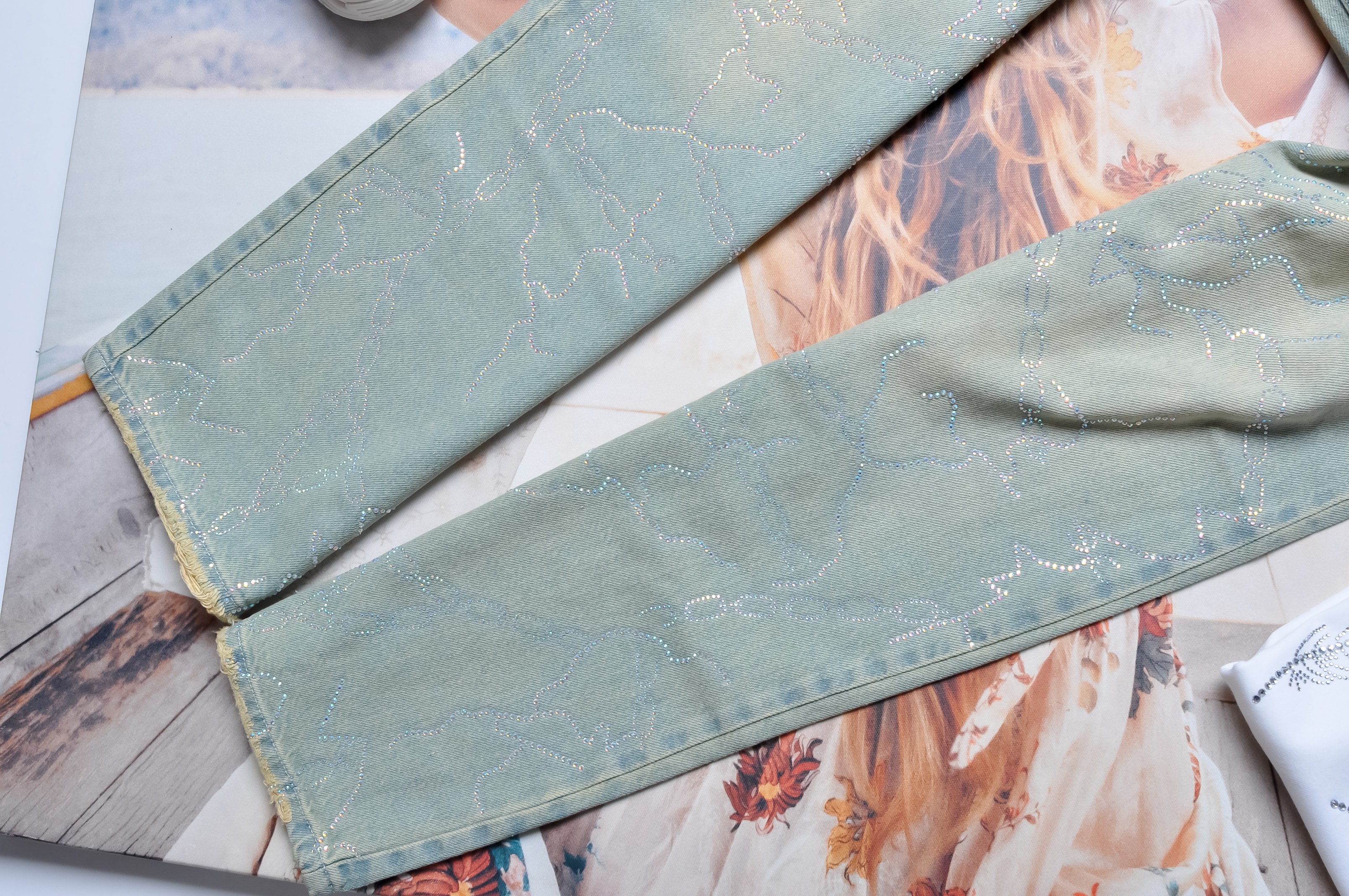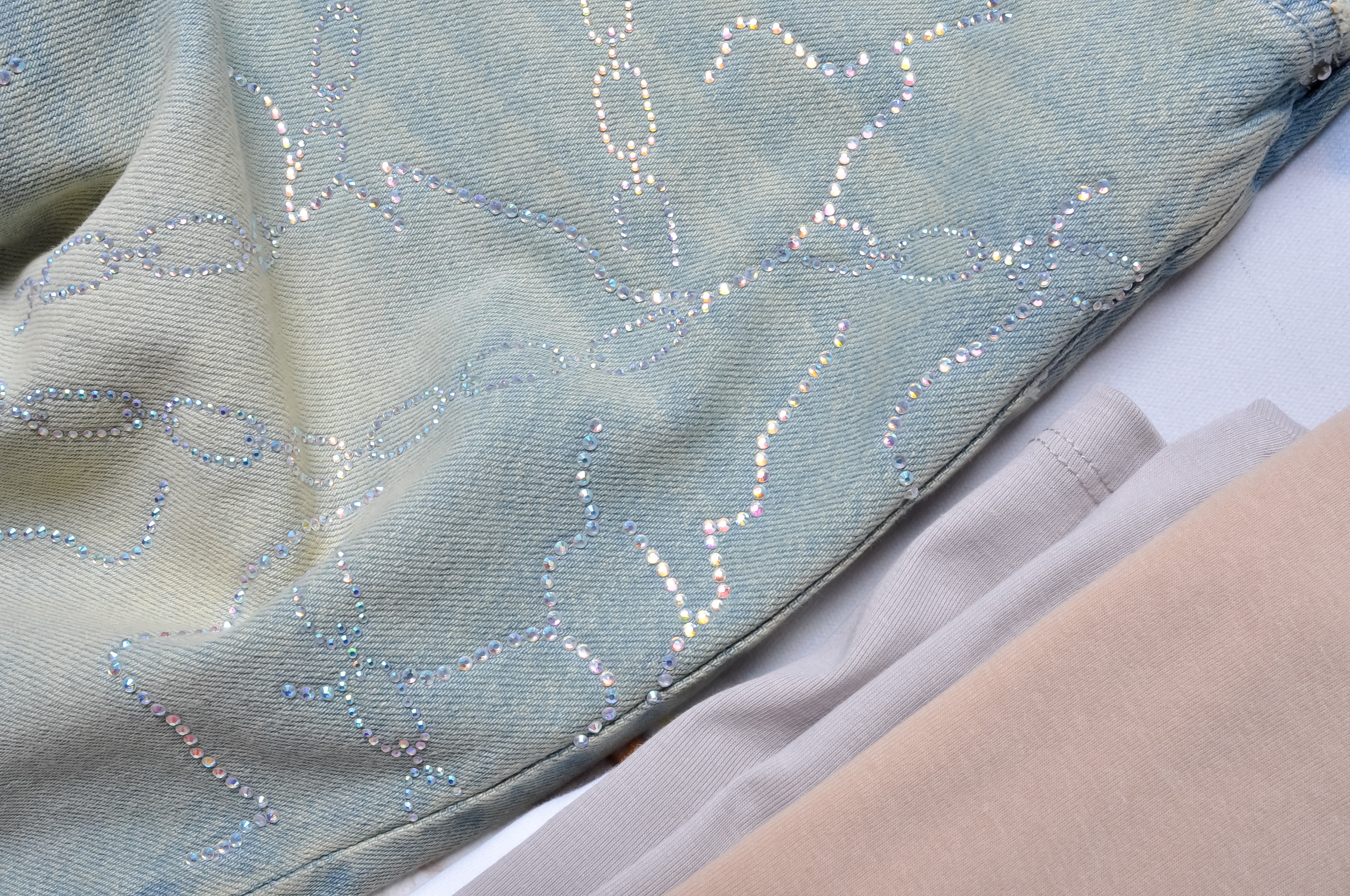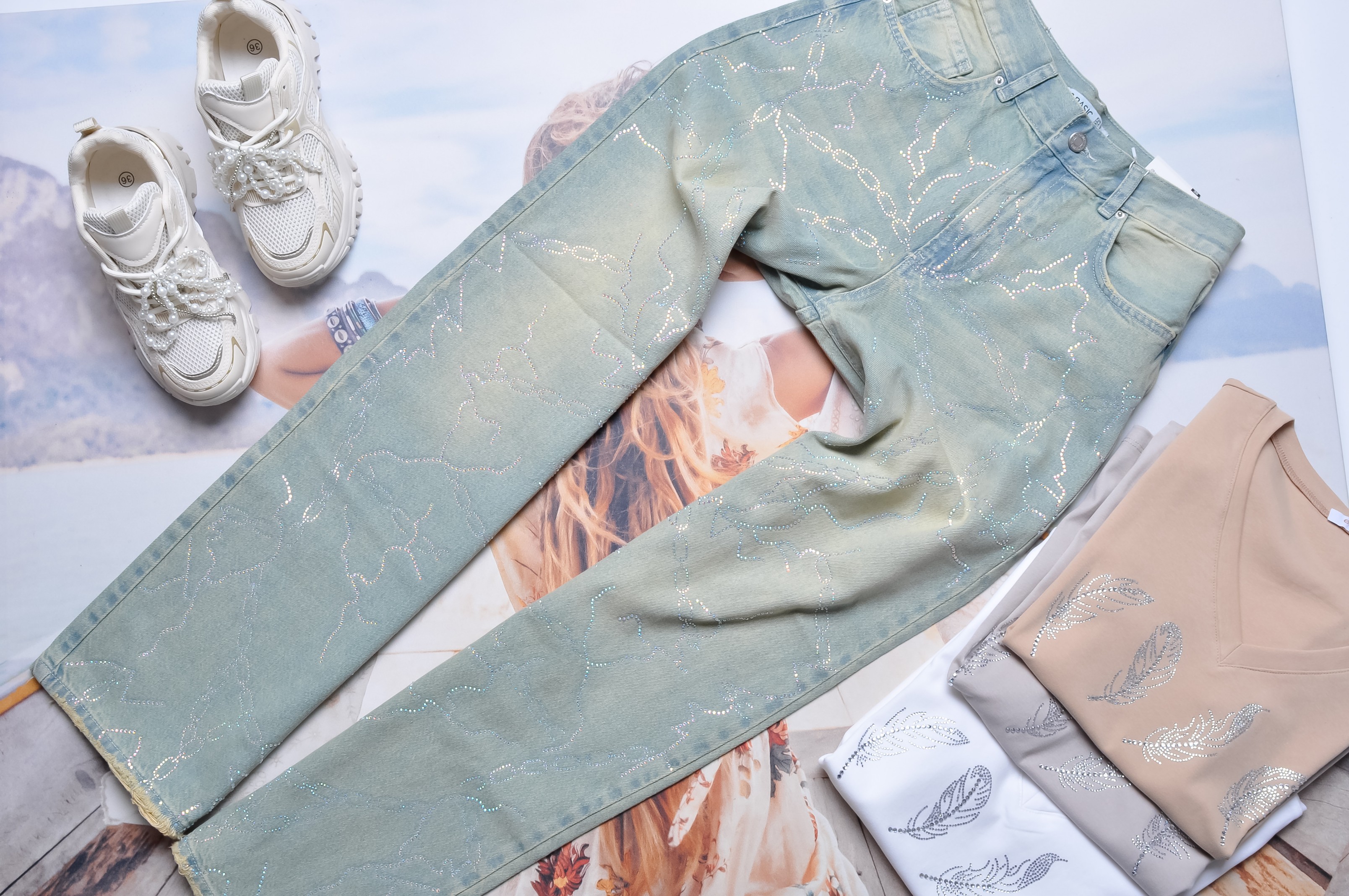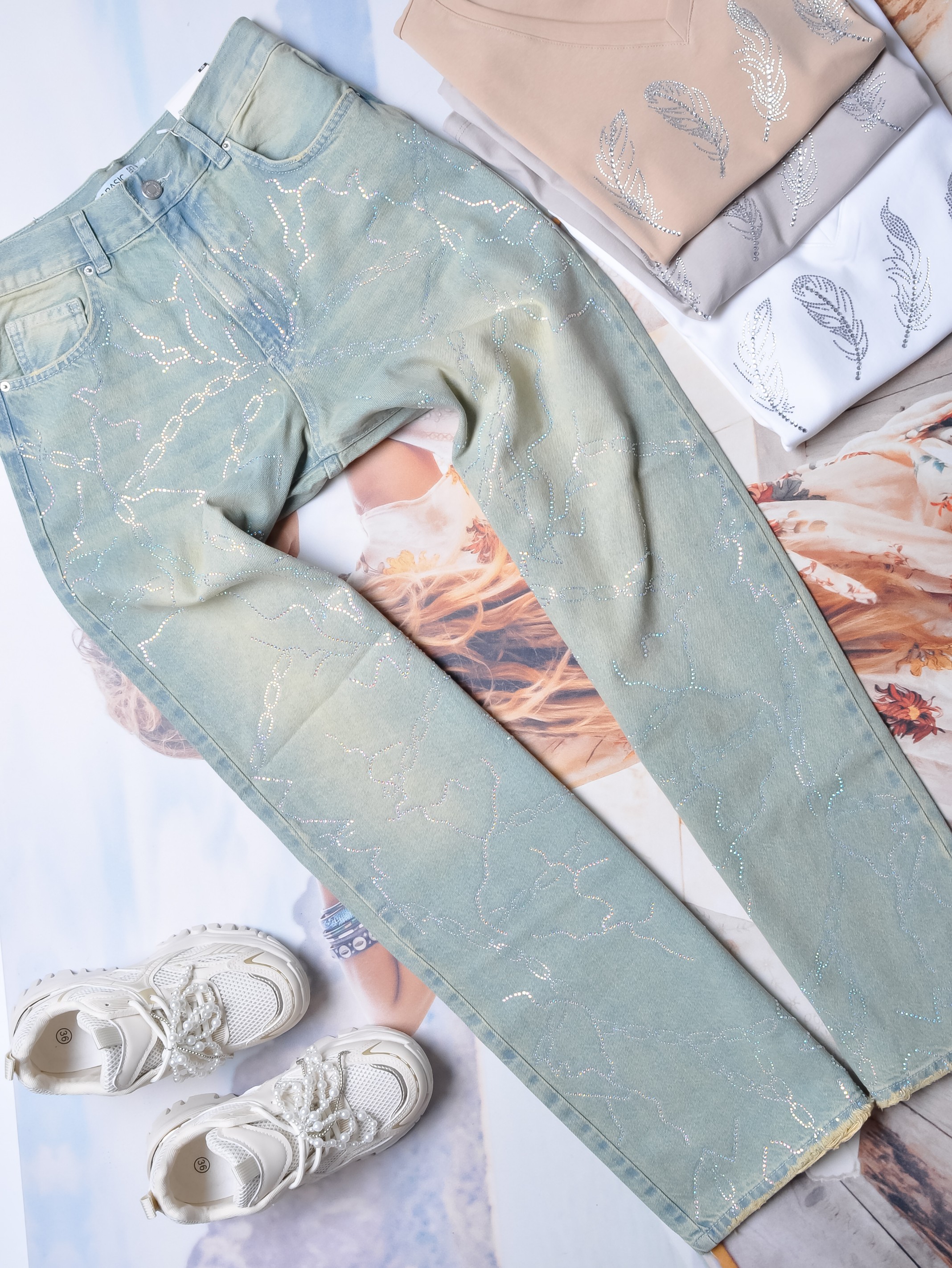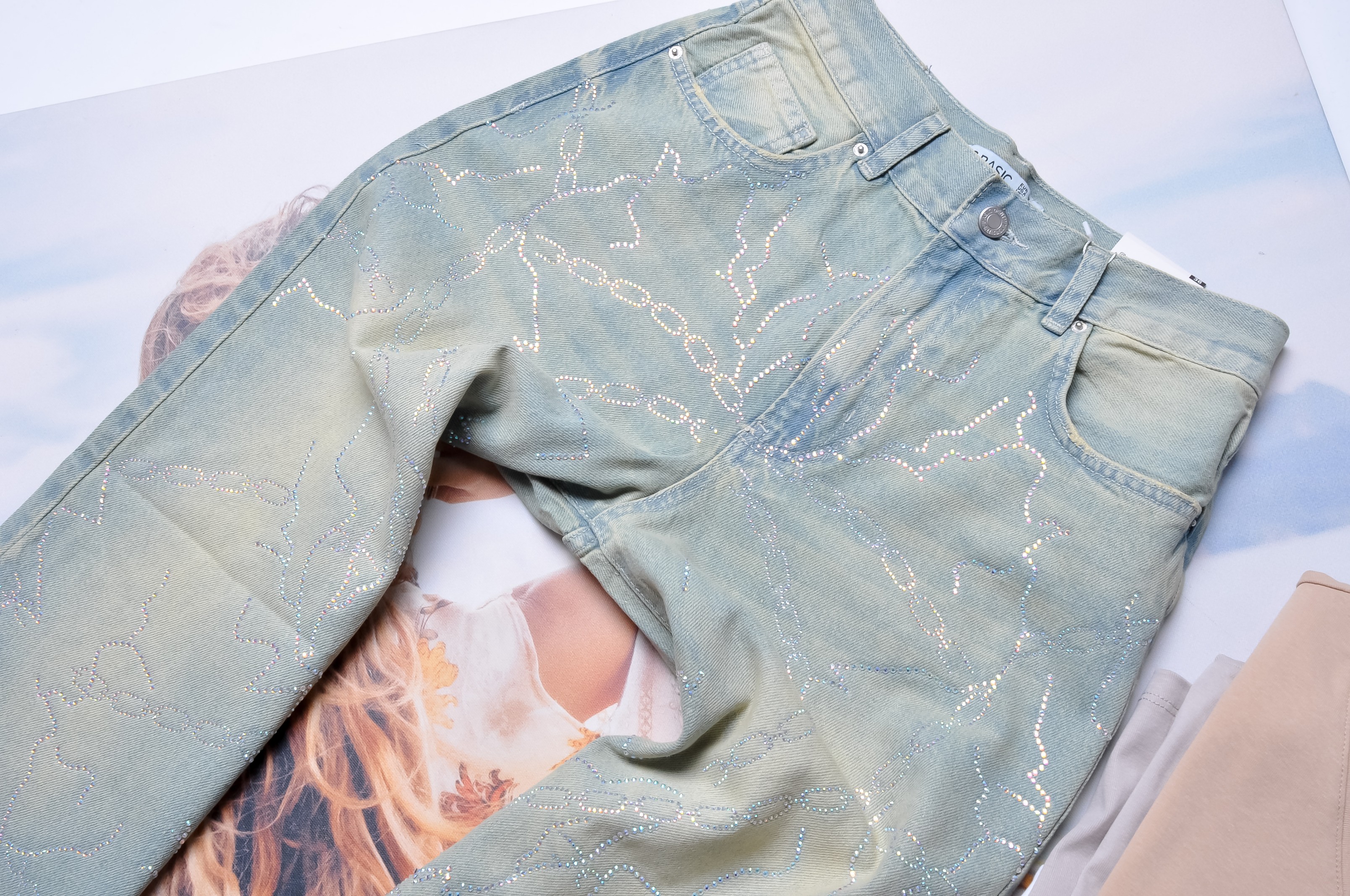 Jasne jeansy z wysokim stanem - dzwony. Z przodu i z tyłu dwie kieszenie. Z przodu posypane cyrkoniami- ułożone w kształcie łańcuchów. Dołem lekko poszarpane.