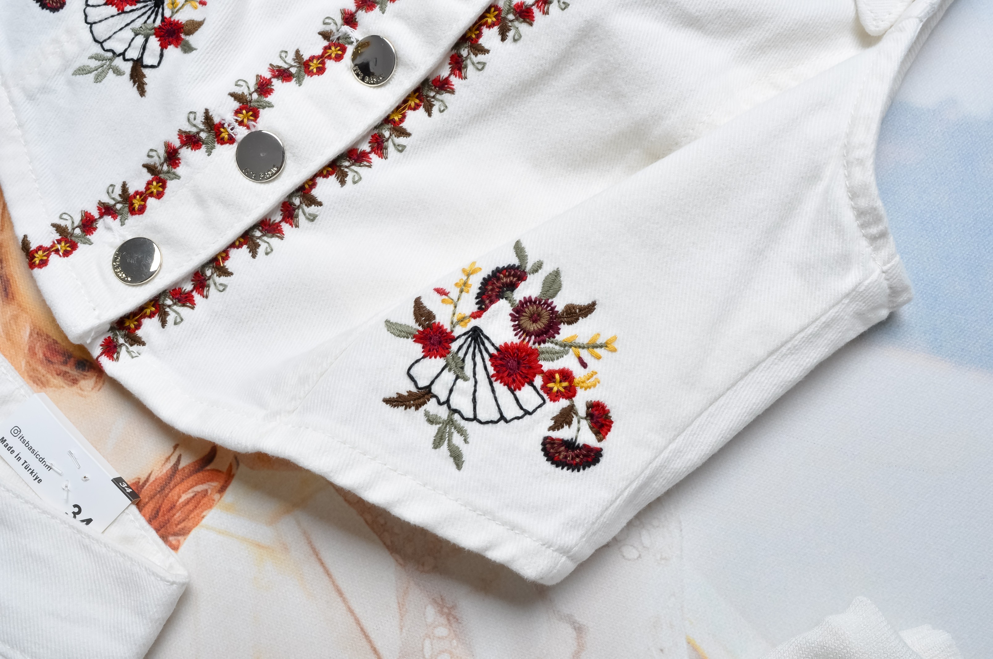 Piękna kamizelka o przylegającym kroju Zapinana na guziki. Z tyłu krótsza. Bogato zdobiona haftowanymi kwiatami.