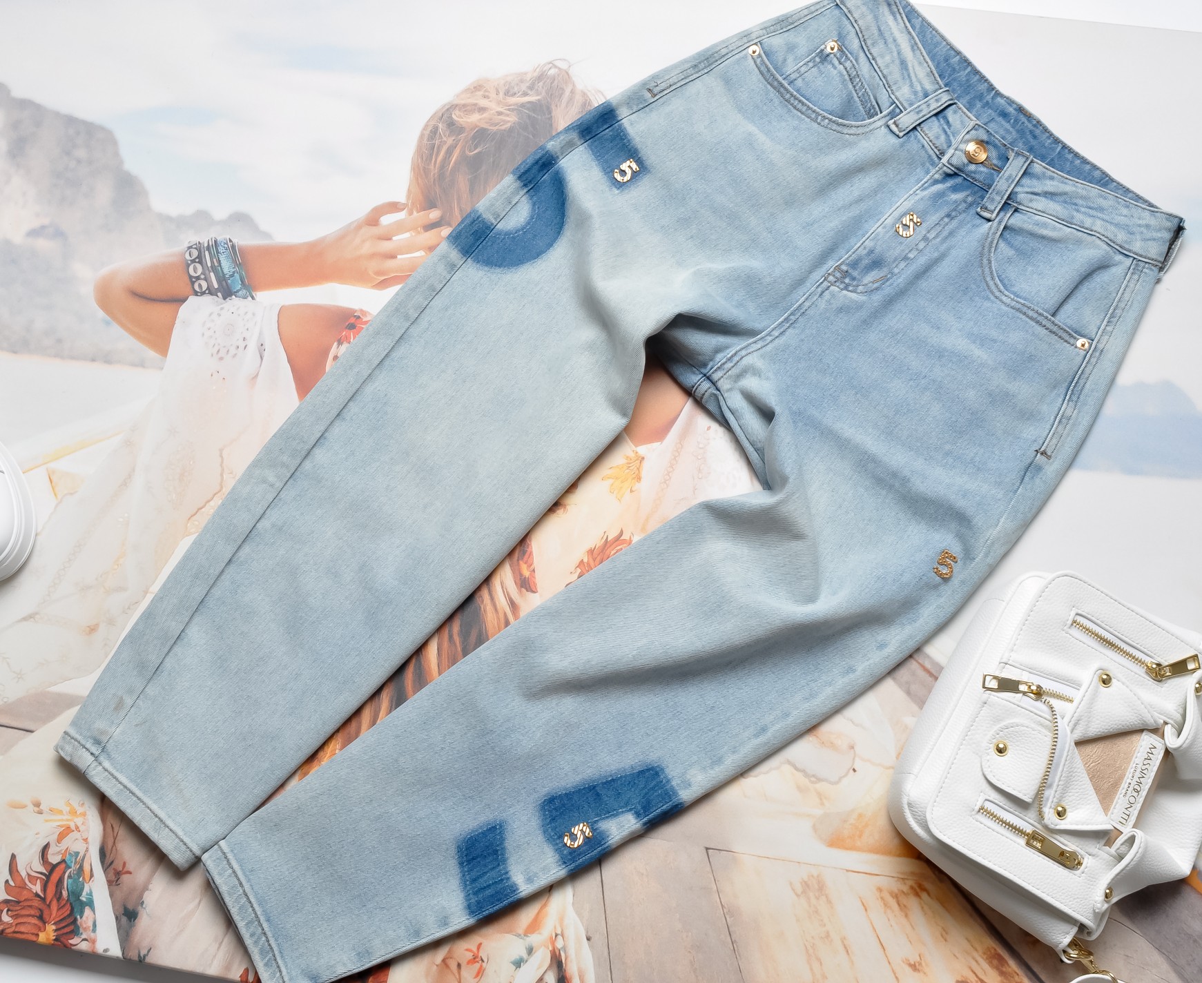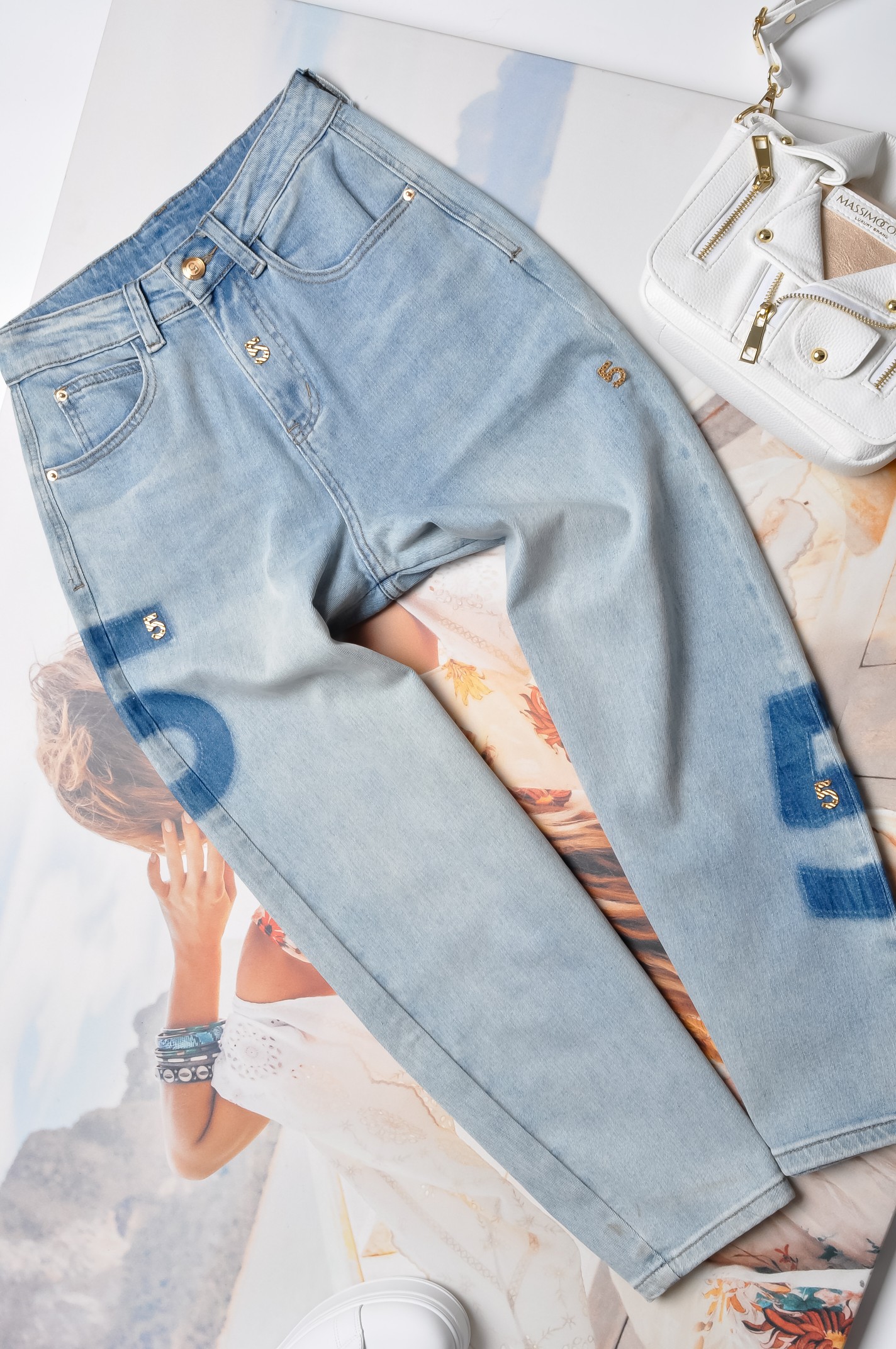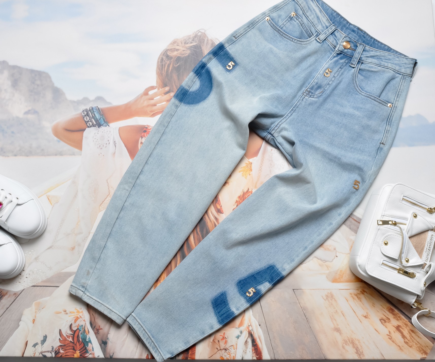 Jeansy w klasycznym, jasnym kolorze. Zdobione po bokach cyfrą 5. Zapinane na zamek oraz guziczek. Z przodu i z tyłu dwie kieszenie.