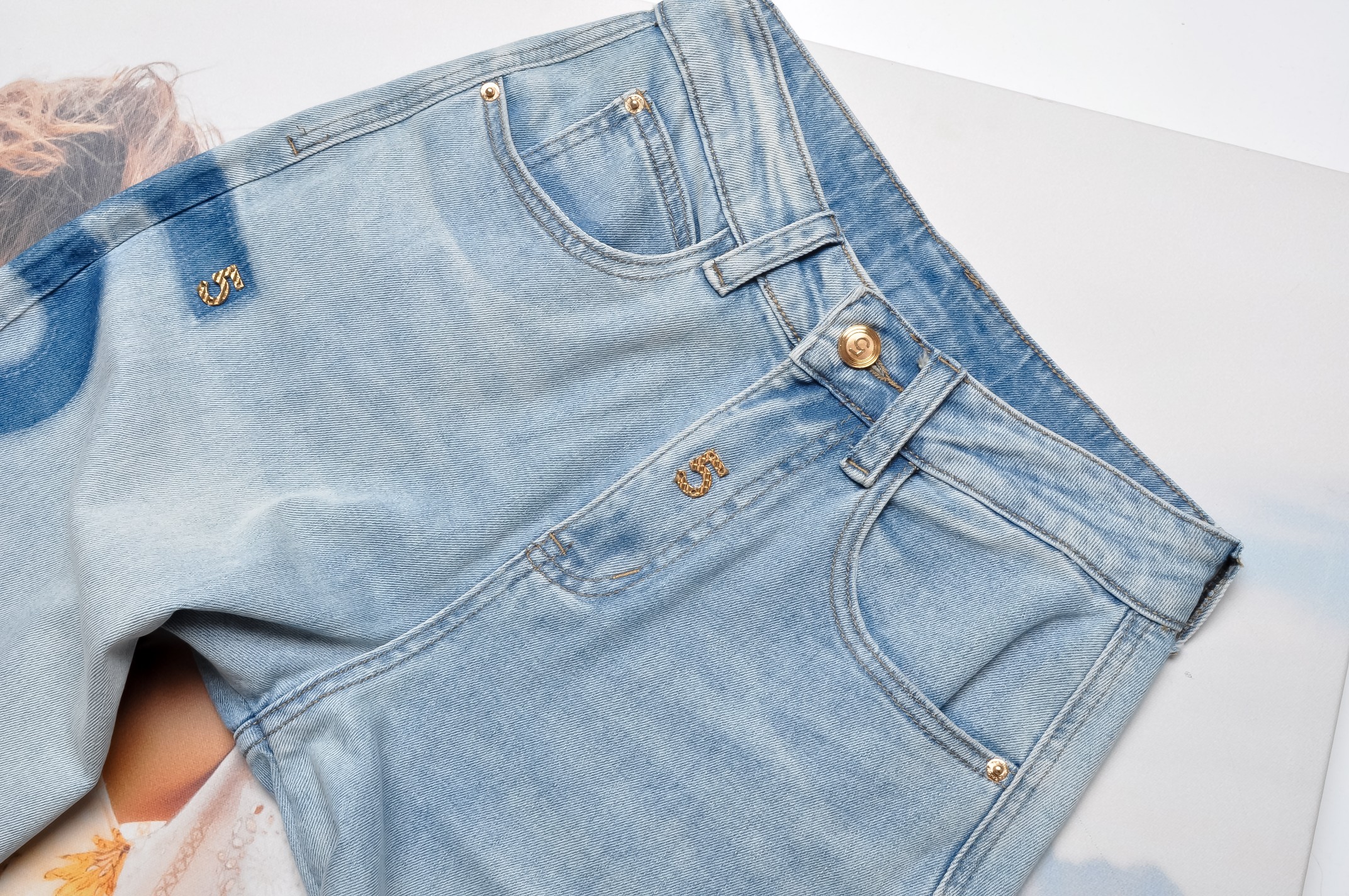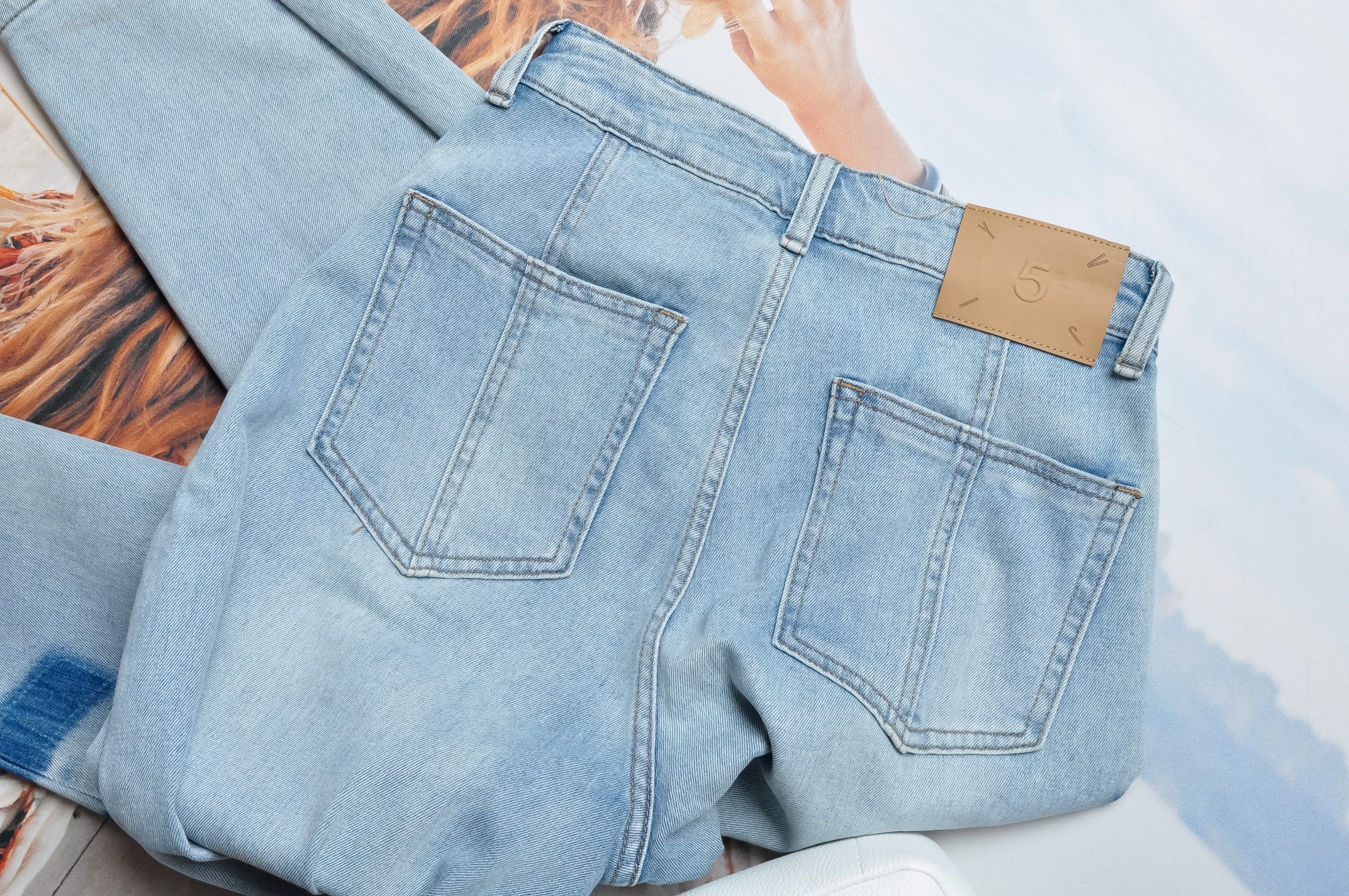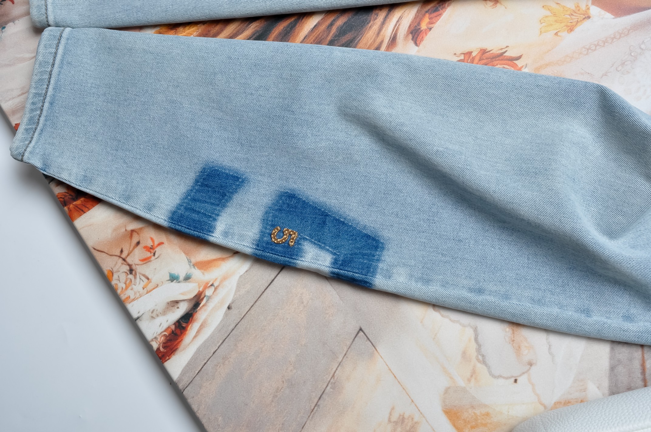 Jeansy w klasycznym, jasnym kolorze. Zdobione po bokach cyfrą 5. Zapinane na zamek oraz guziczek. Z przodu i z tyłu dwie kieszenie.