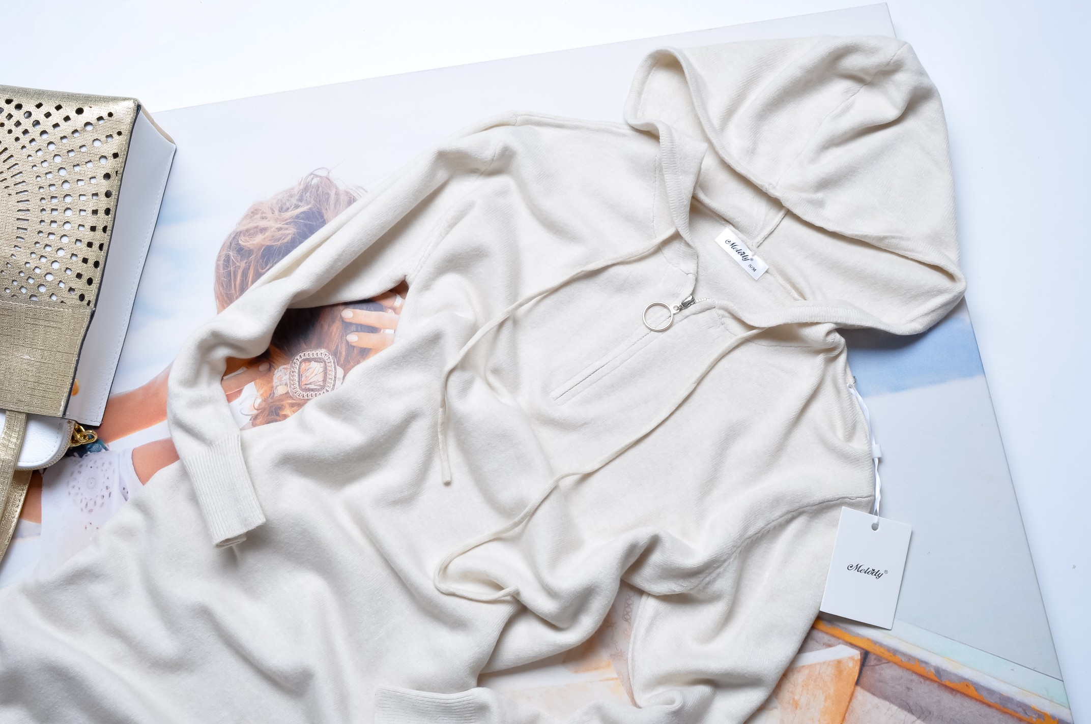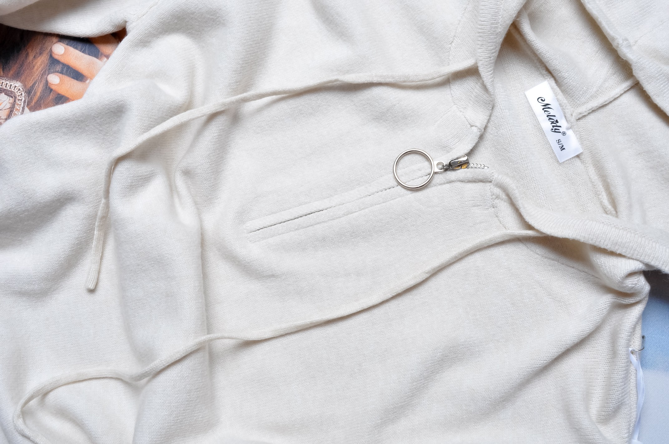 Śliczna sukienkaa w kremowym kolorze. Wkładana przez głowę. Dekolt zapinany na zameczek. Rękawy długie. Fason oversize, nieprzylegający. Wykończona kapturem z tyłu.