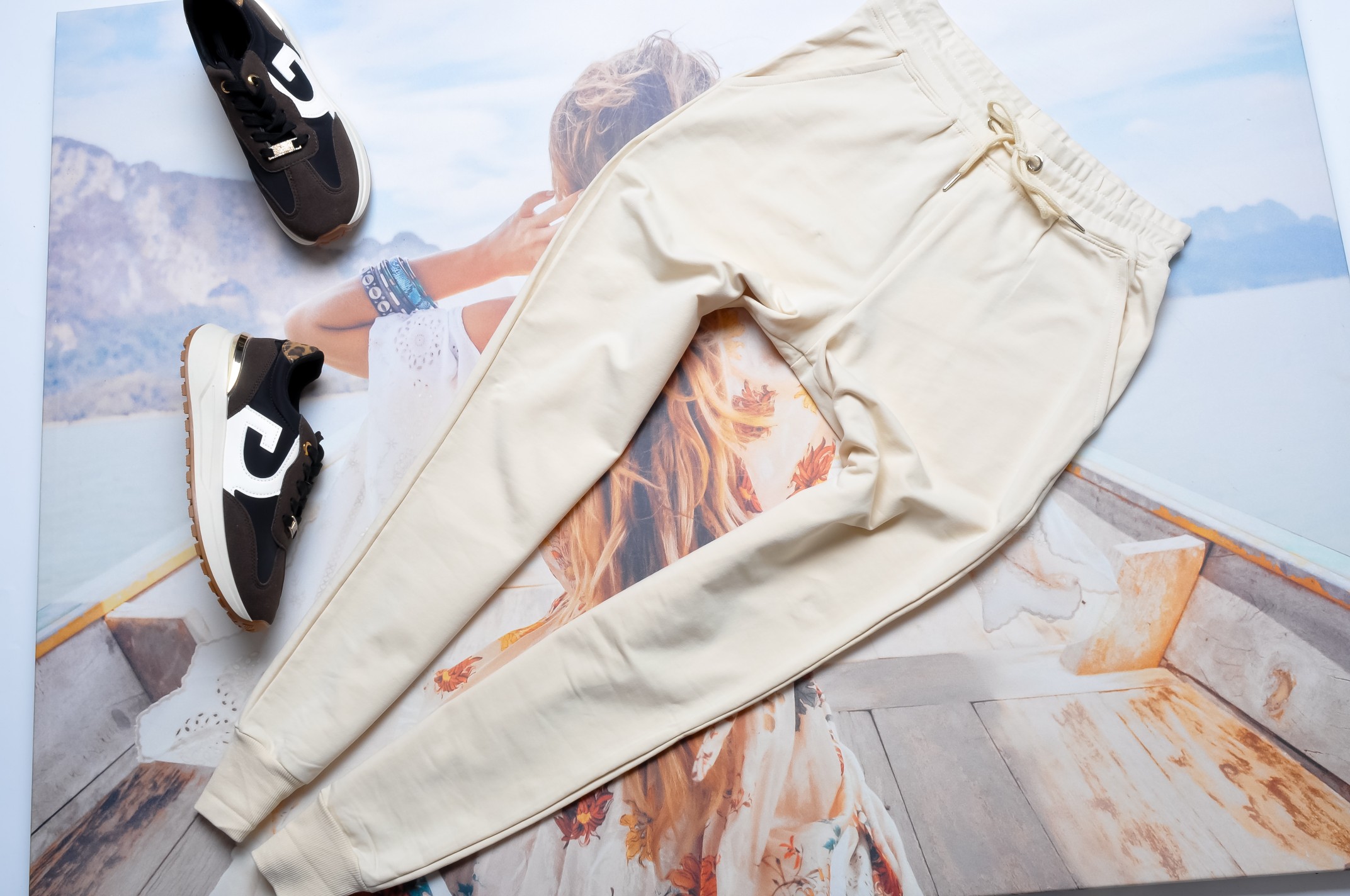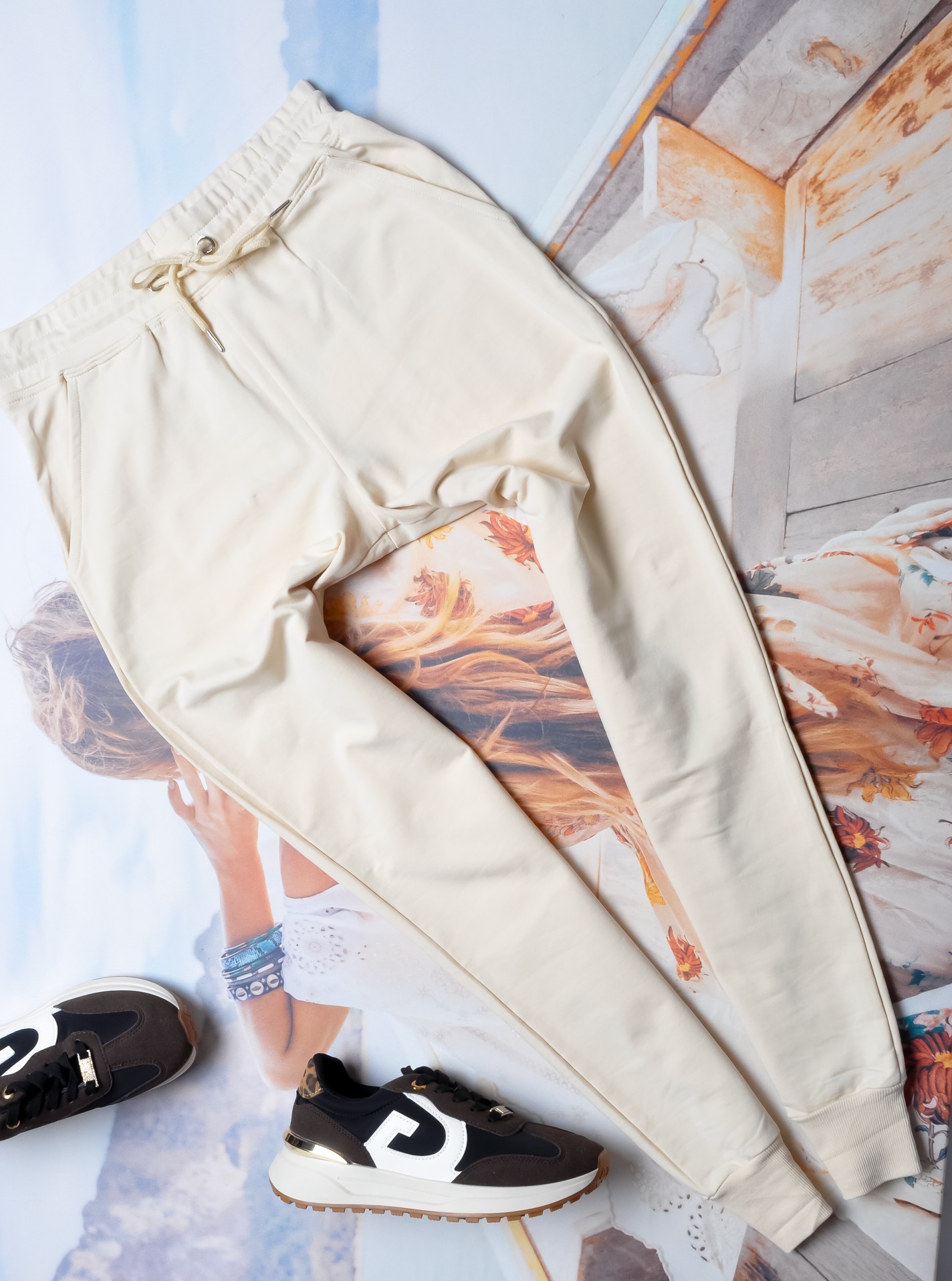 Spodnie w kremowym kolorze. W pasie szeroka gumka i sznurek dla lepszego dopasowania. Dołem ściągacze. Po bokach kieszenie.