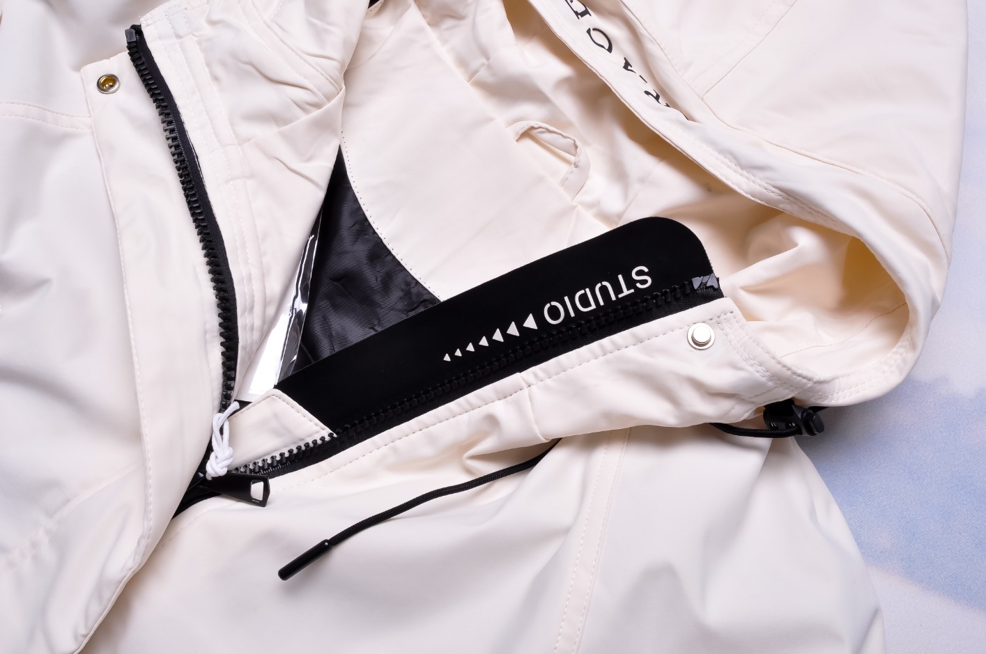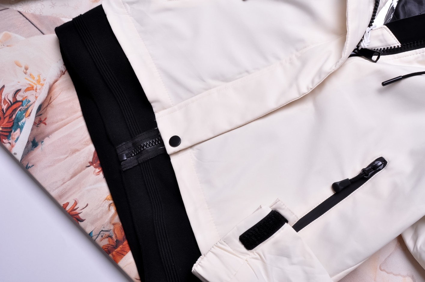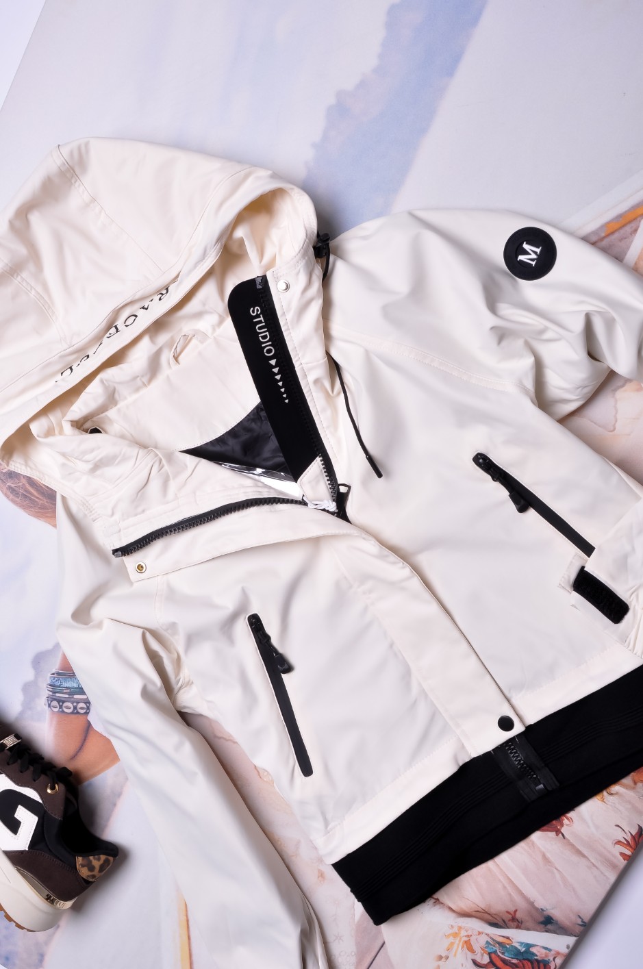 Kurtka w kremowo - czarnym kolorze. Z przodu dwie pojemne kieszenie zapinane na zamek. Materiał od środka wyszywany podszewką, w środku jedna dodatkowa kieszeń. Na dole kurtki są szerokie ściągacze. Rękawy ściągane na rzep. Kaptur nie jest odpinany. Obniżona linia ramion.