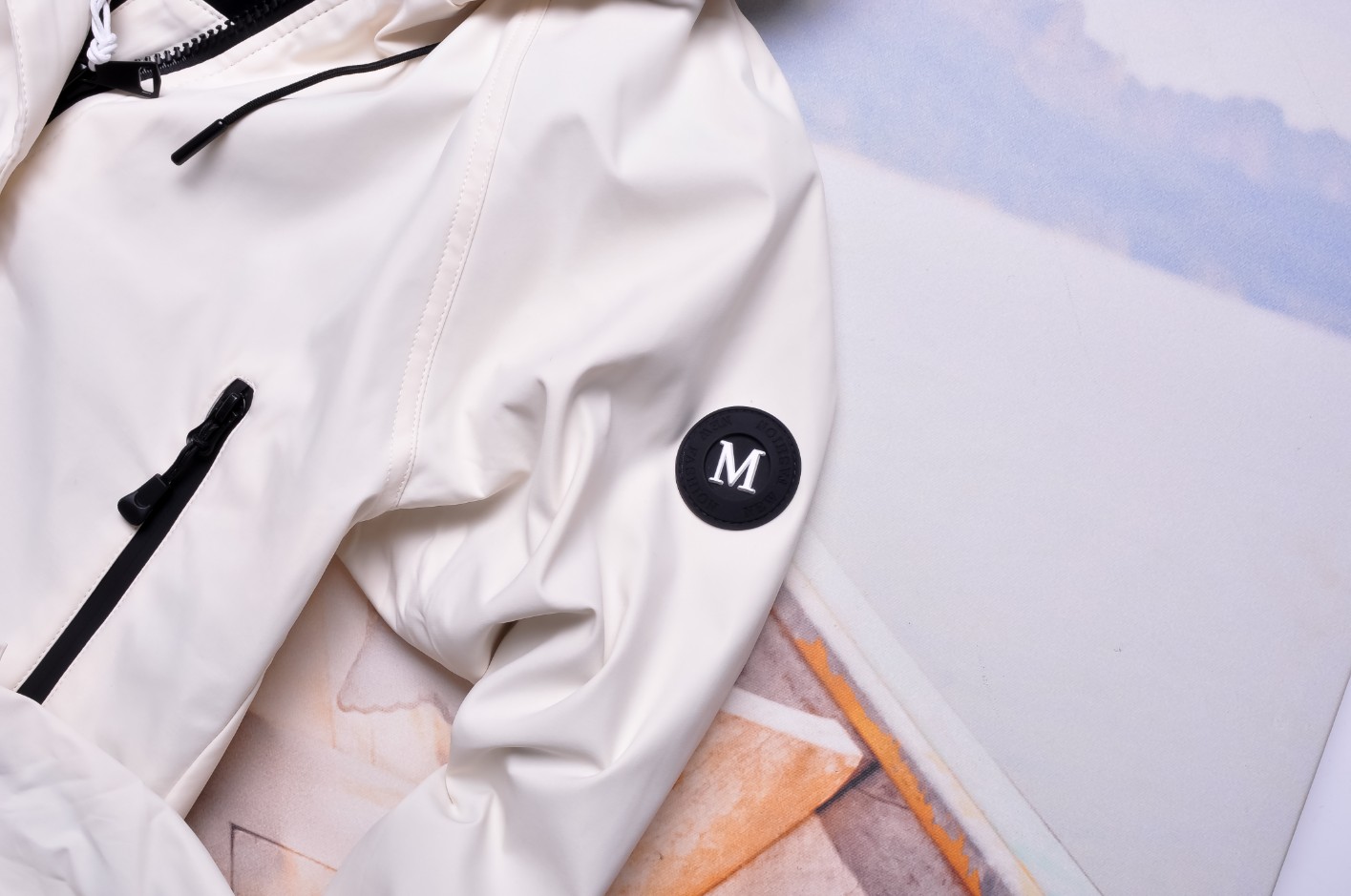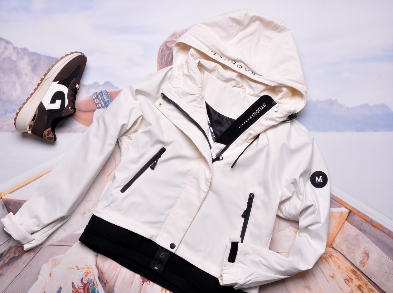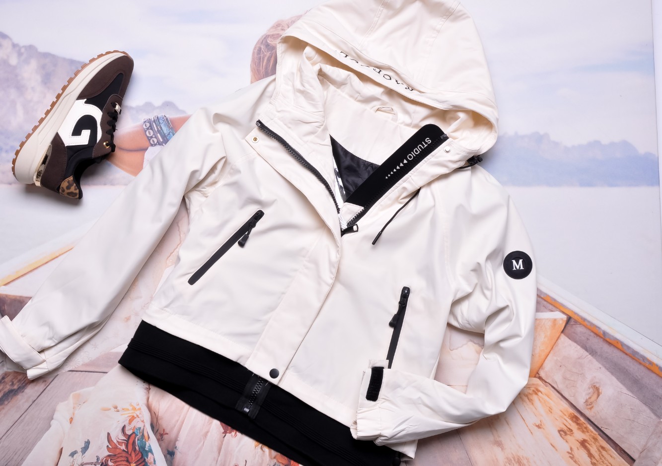 Kurtka w kremowo - czarnym kolorze. Z przodu dwie pojemne kieszenie zapinane na zamek. Materiał od środka wyszywany podszewką, w środku jedna dodatkowa kieszeń. Na dole kurtki są szerokie ściągacze. Rękawy ściągane na rzep. Kaptur nie jest odpinany. Obniżona linia ramion.