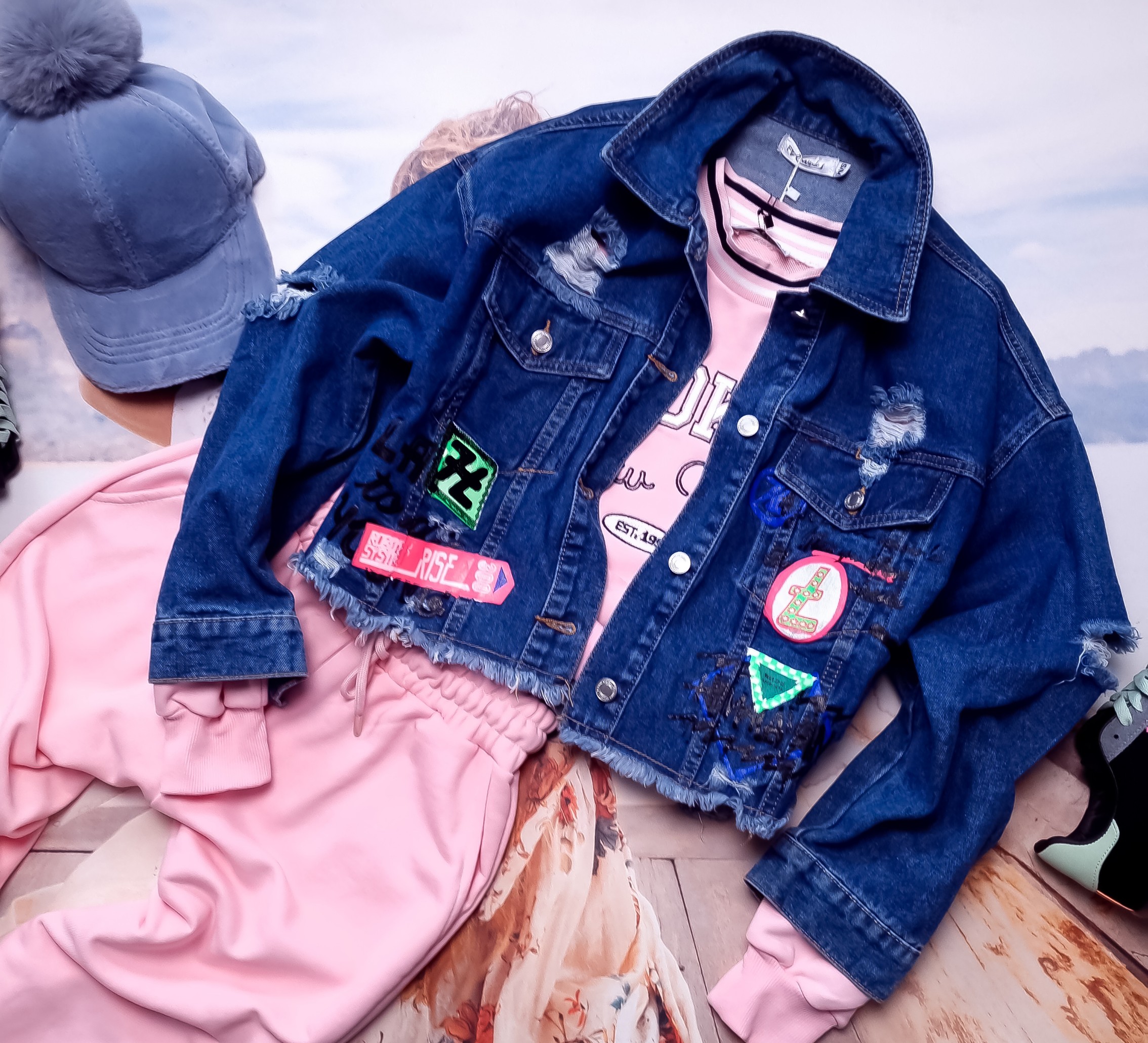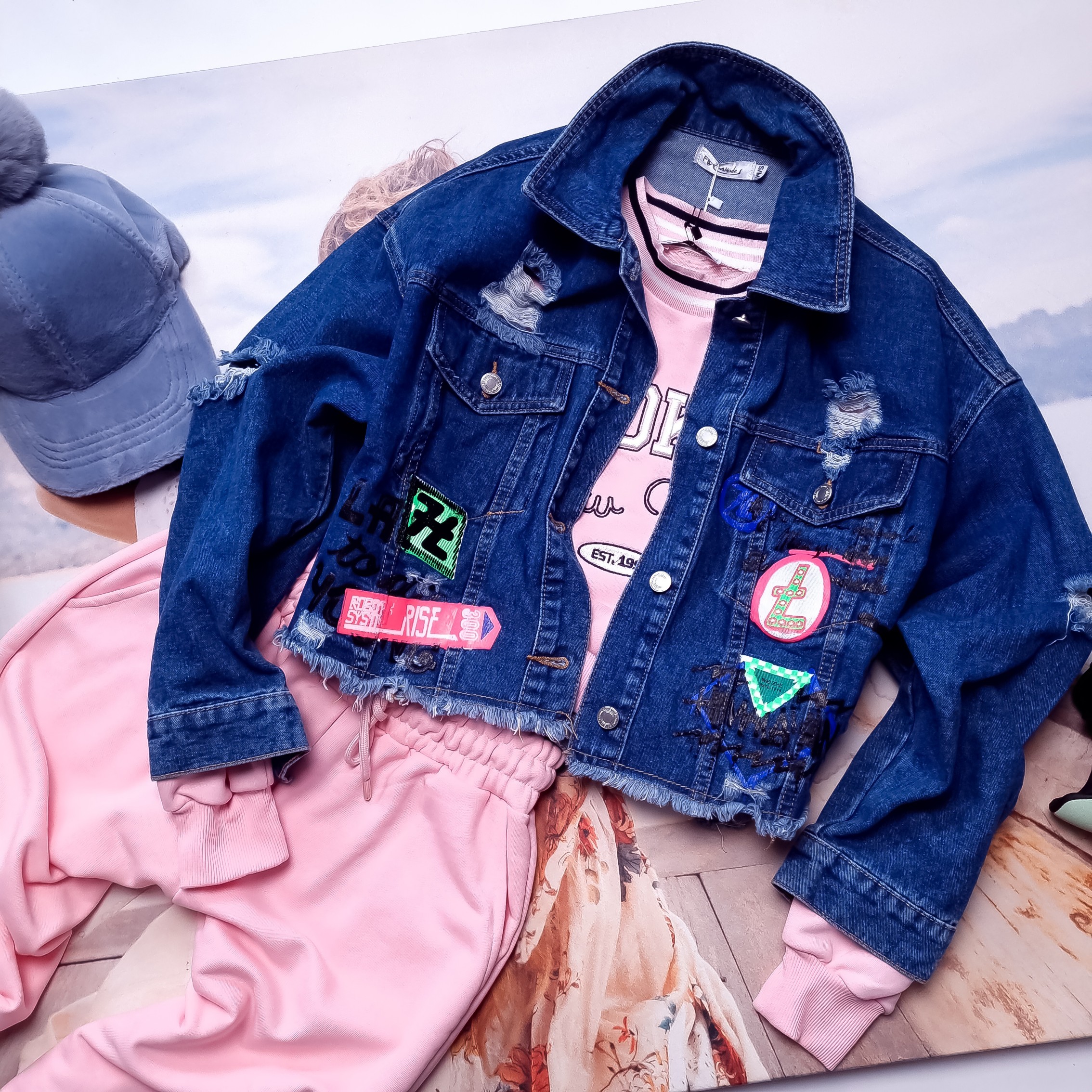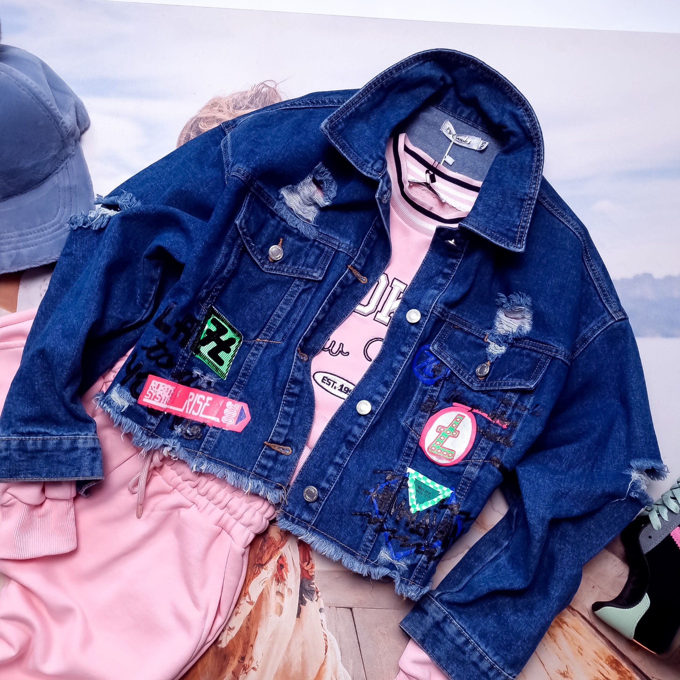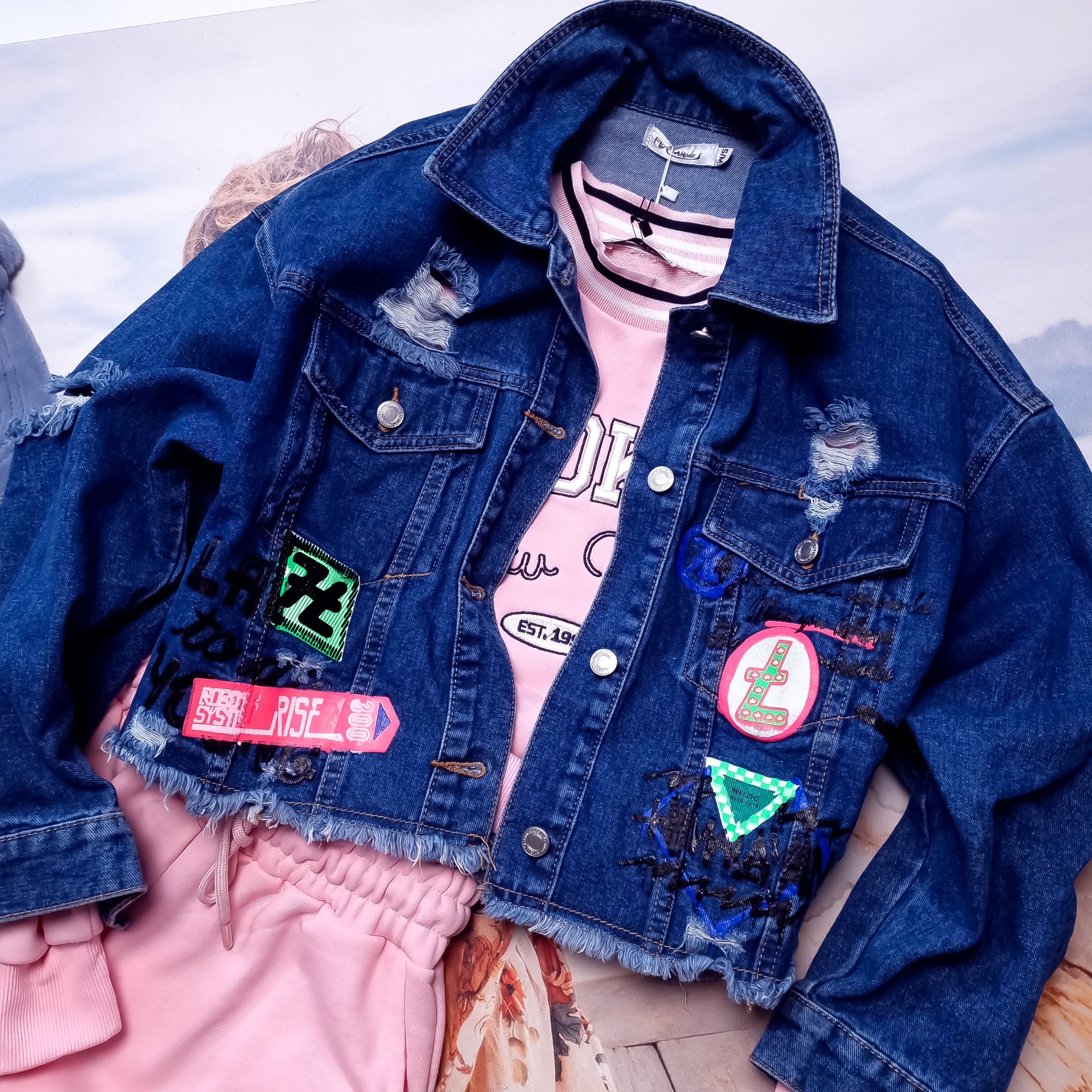 Lekka, jeansowa kurteczka zapinana na guziki, o fasonie swobodnym, w kolorze granatowym. Zdobiona kolorowymi naszywkami. Z przodu dwie kieszenie. Wysoka jakość.