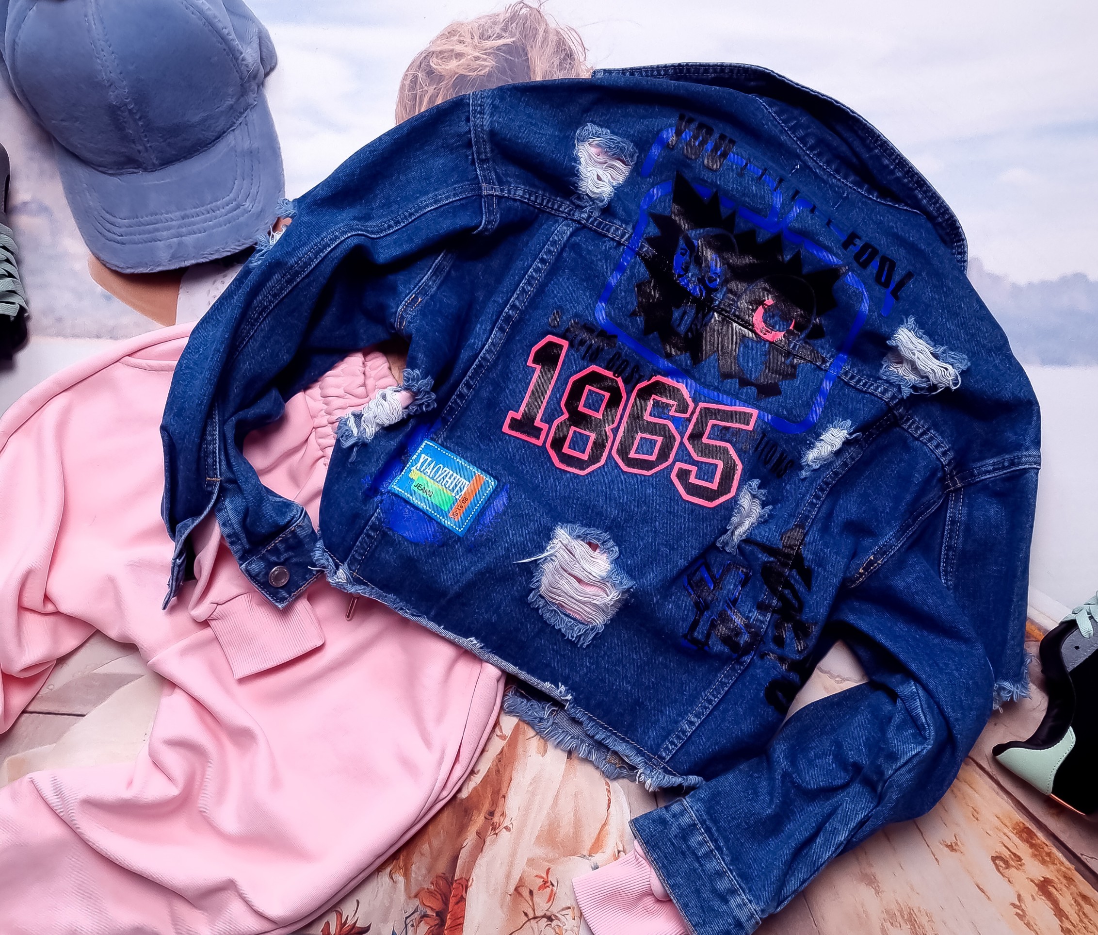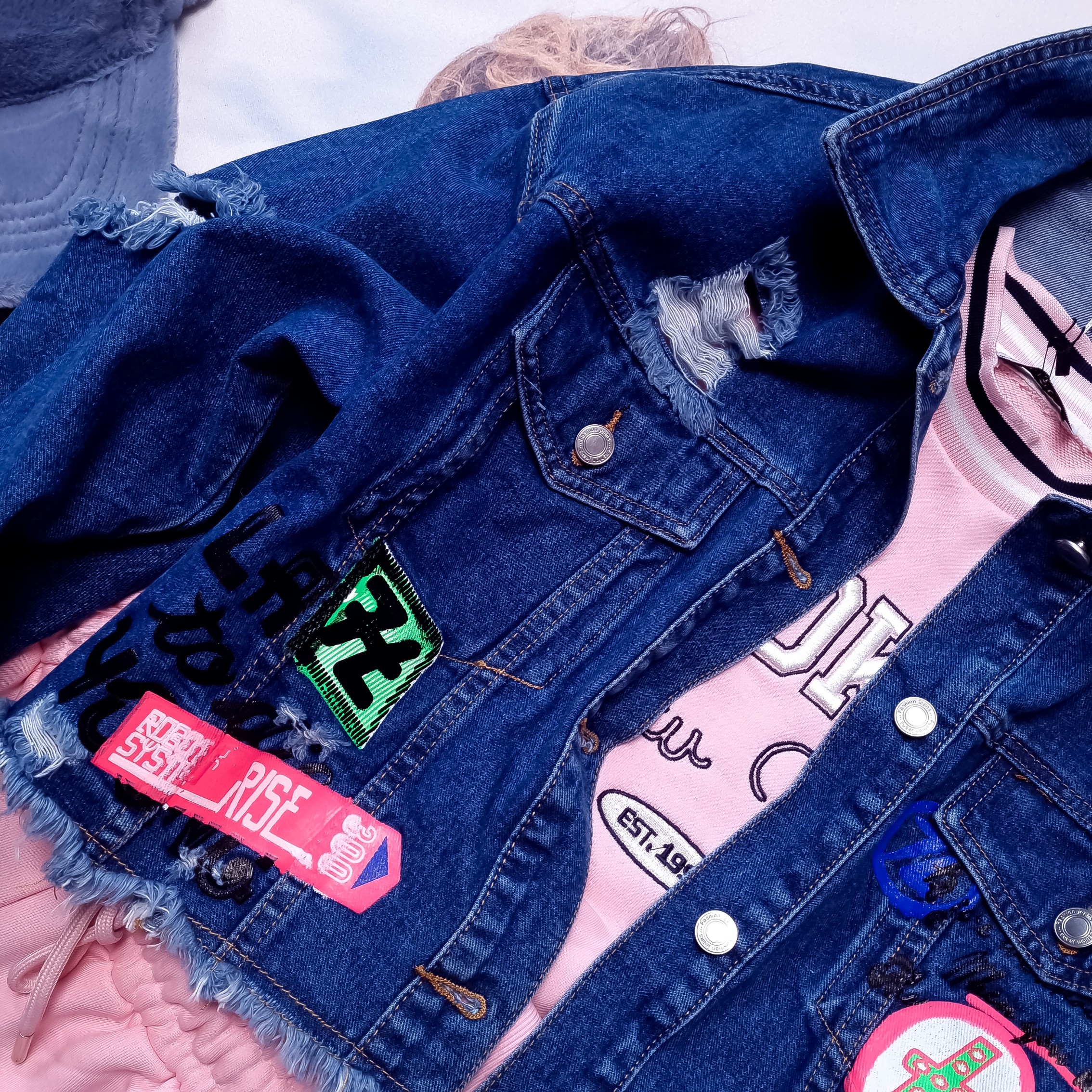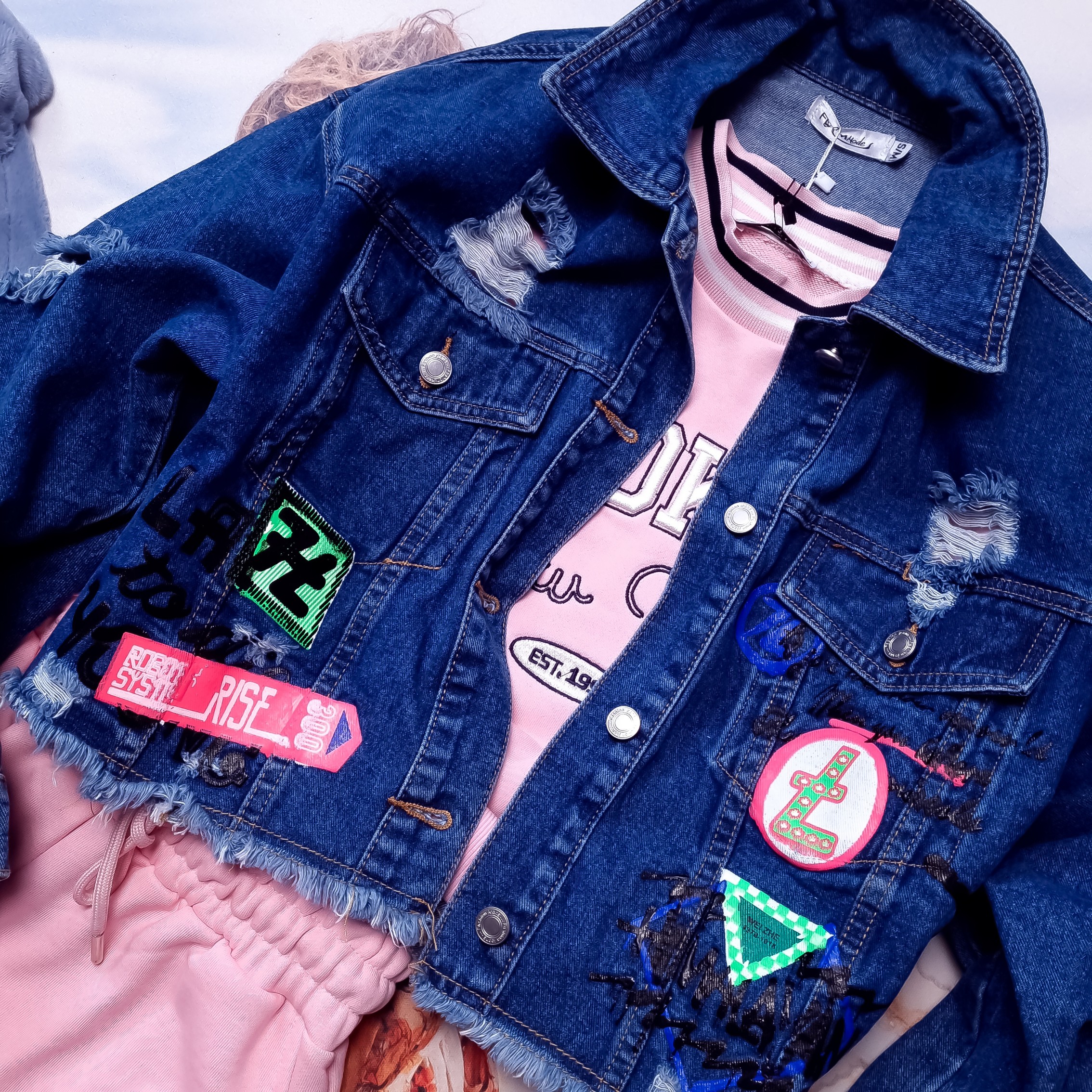 Lekka, jeansowa kurteczka zapinana na guziki, o fasonie swobodnym, w kolorze granatowym. Zdobiona kolorowymi naszywkami. Z przodu dwie kieszenie. Wysoka jakość.