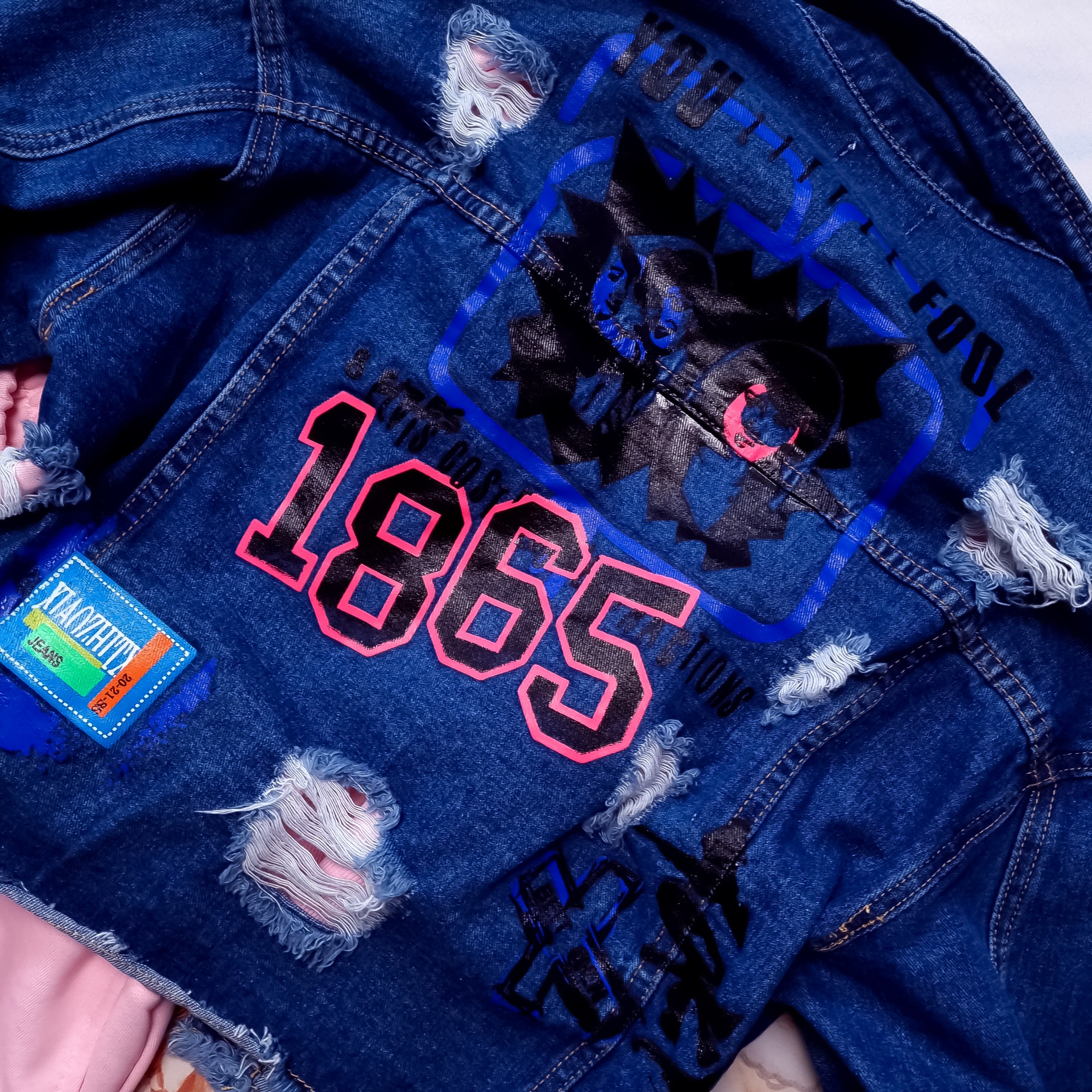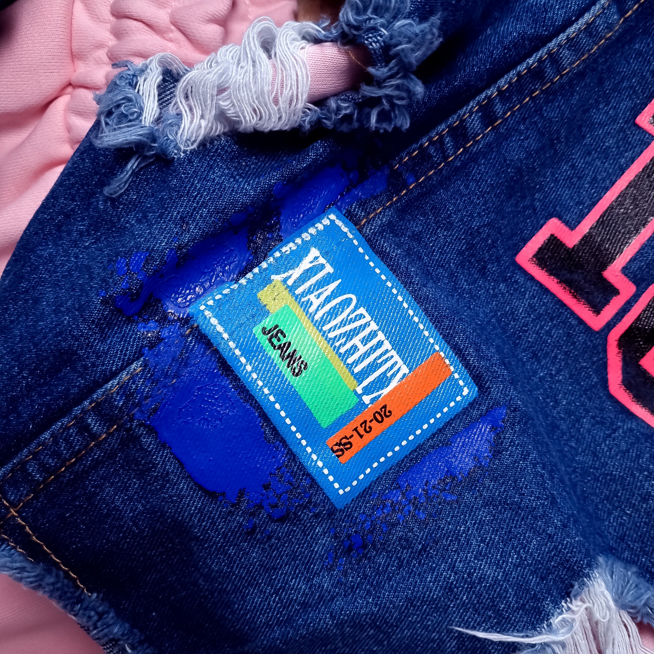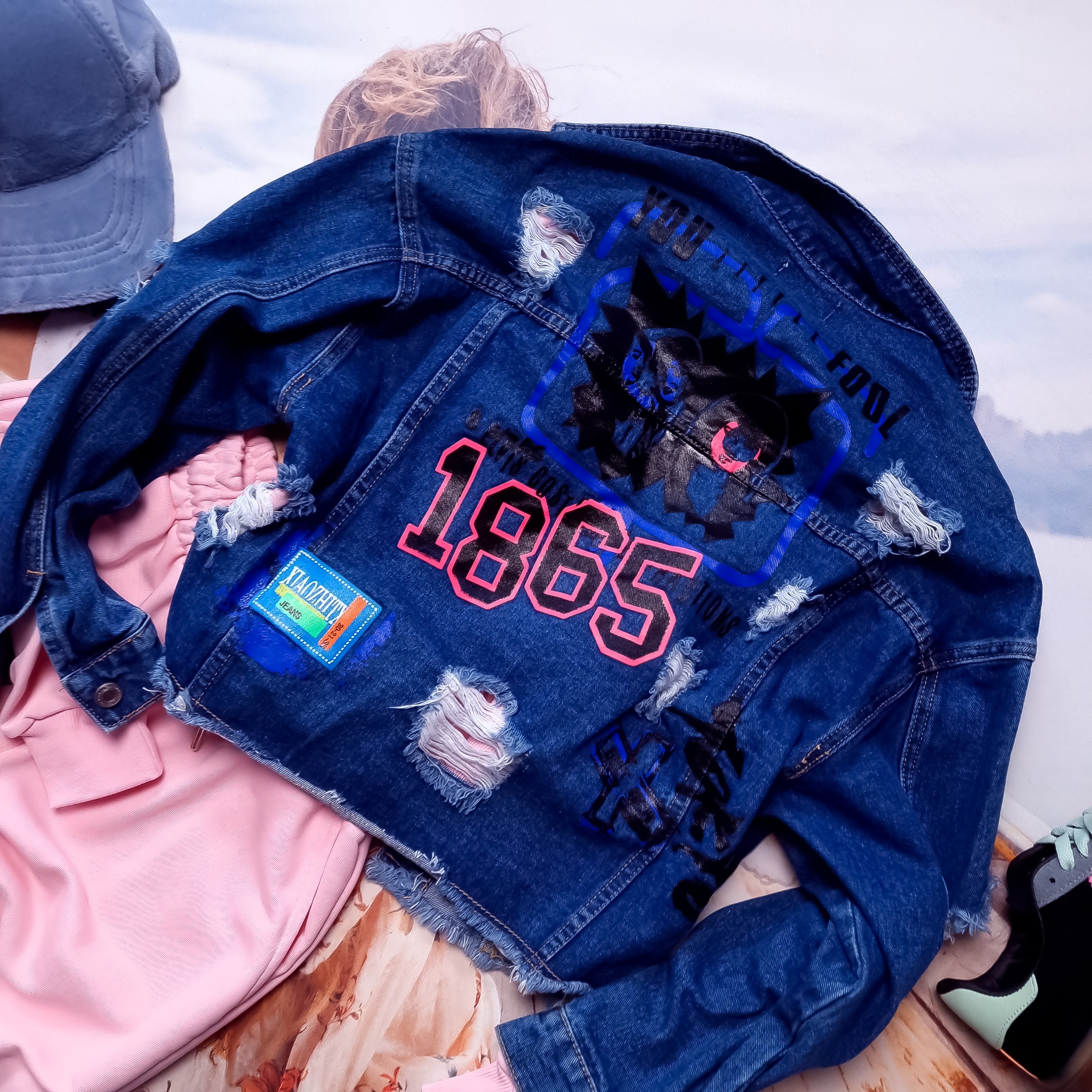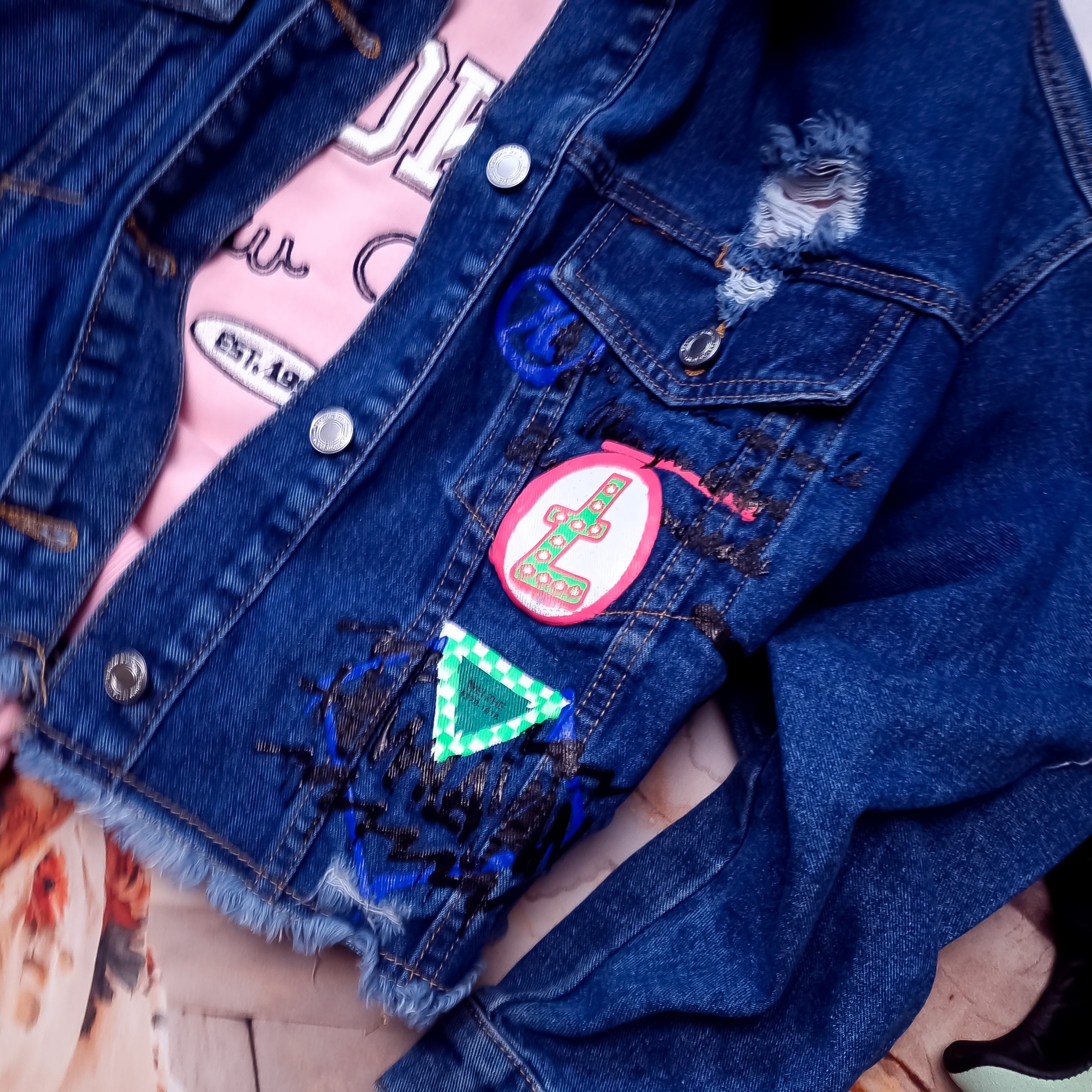 Lekka, jeansowa kurteczka zapinana na guziki, o fasonie swobodnym, w kolorze granatowym. Zdobiona kolorowymi naszywkami. Z przodu dwie kieszenie. Wysoka jakość.