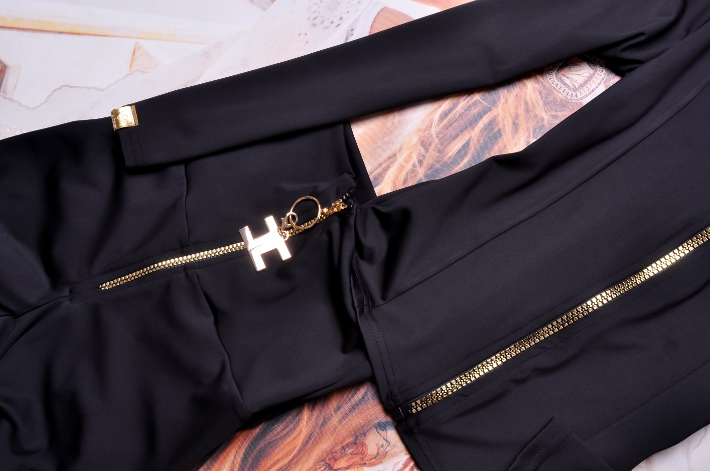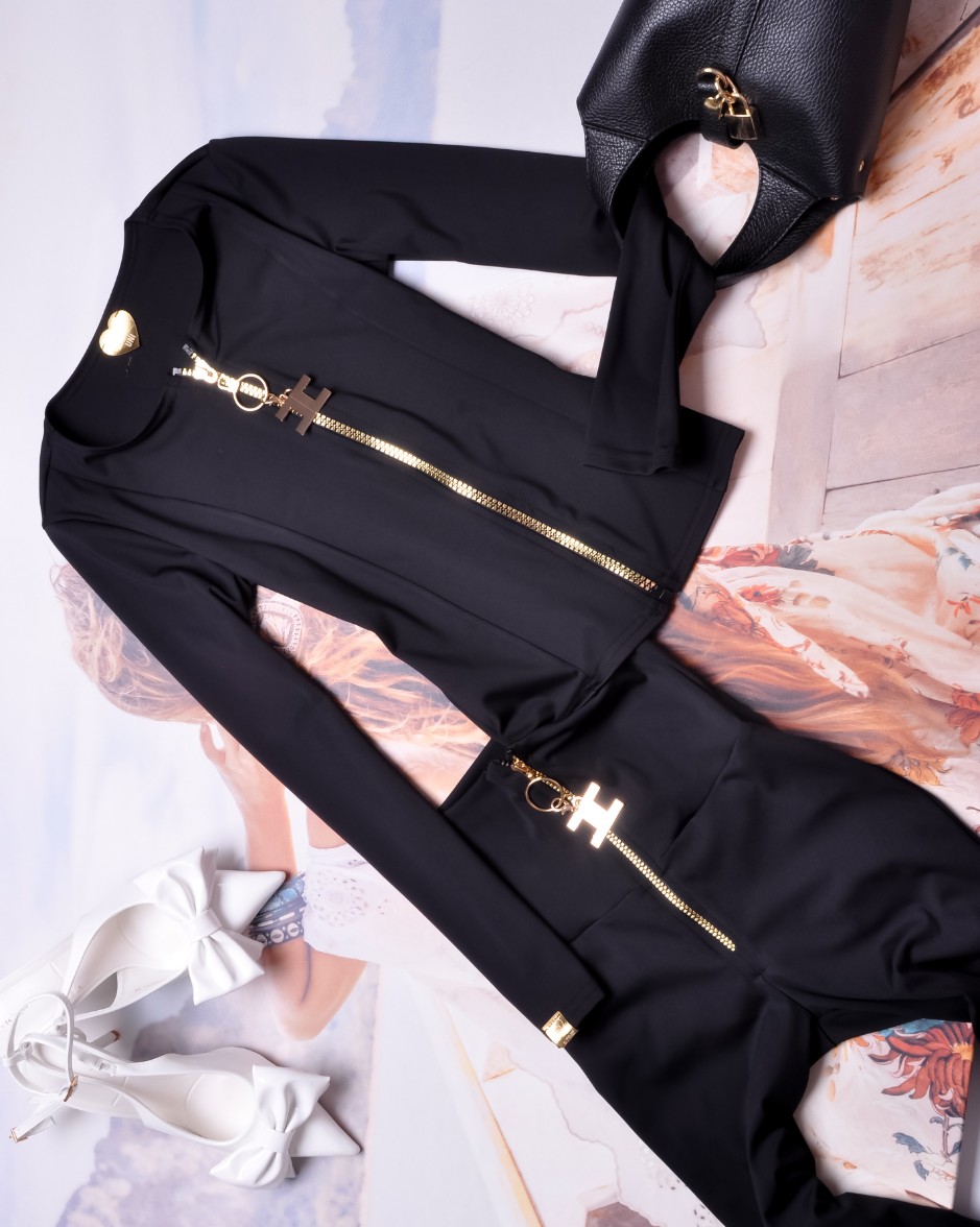 Czarna bluza o przylegającym fasonie, taliowana. Zapinana na zamek. Okrągły dekolt. Rękawy długie zakończone subtelnymi, złotymi naszywkami z logo.