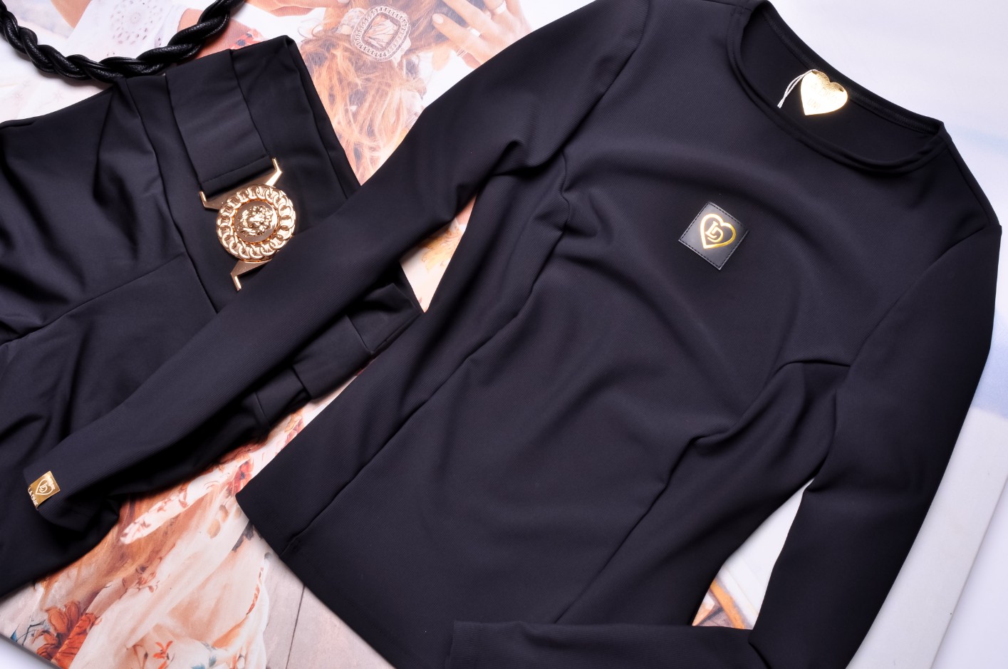 Czarna bluzka o przylegającym fasonie zdobiona subtelnym logo z przodu, taliowana. Wkładana przez głowę. Dekolt okrągły. Rękawy długie.