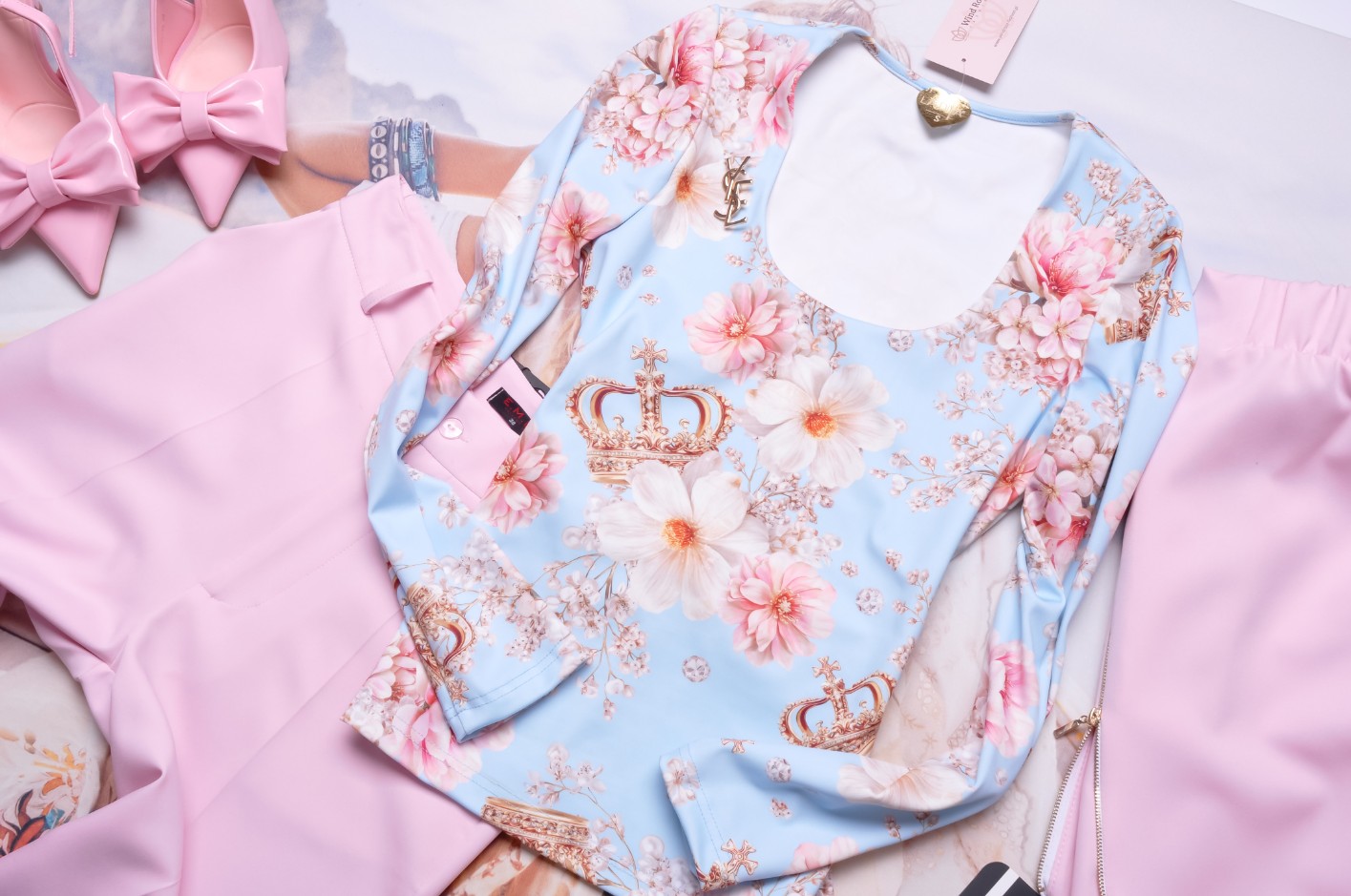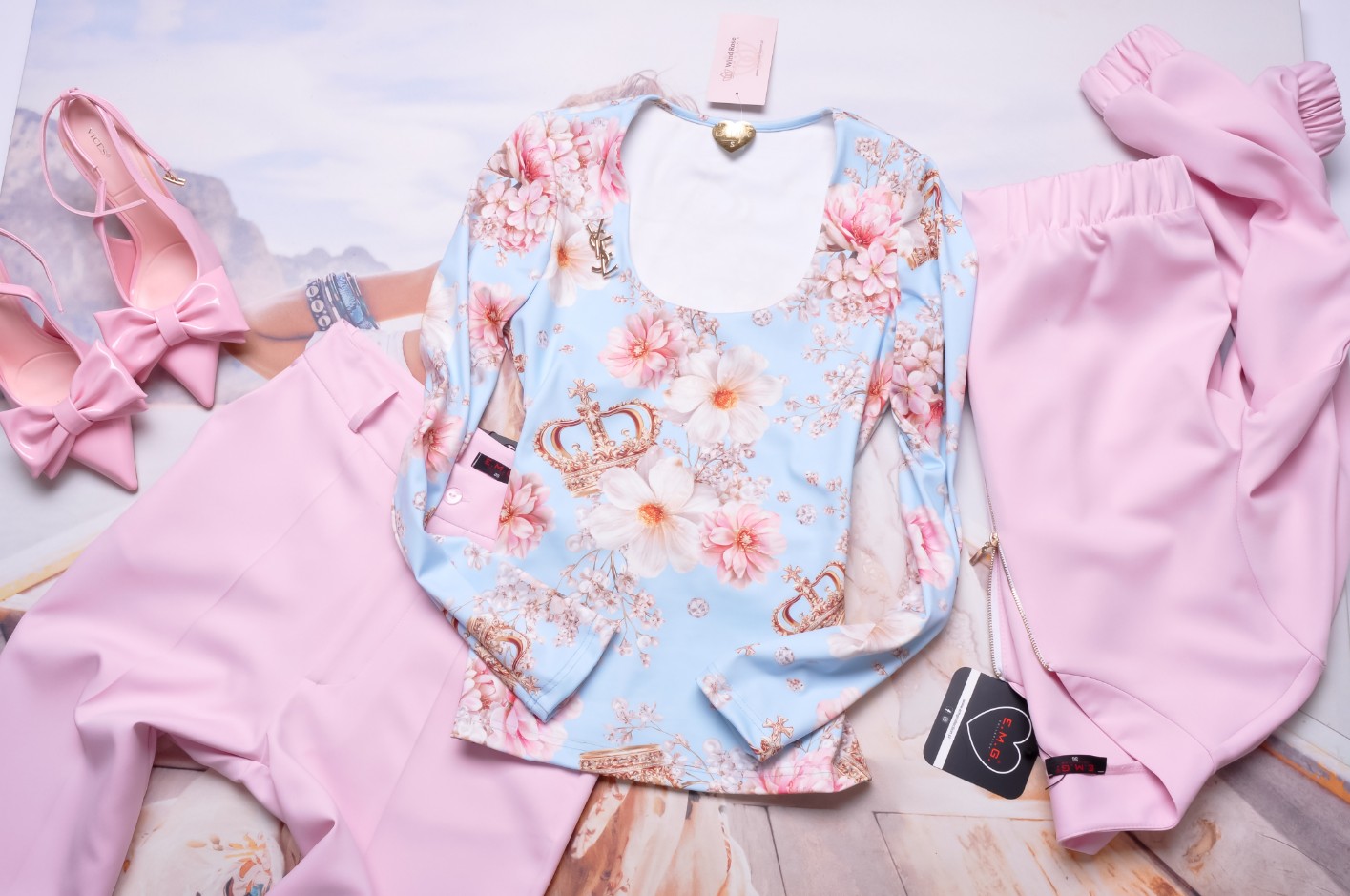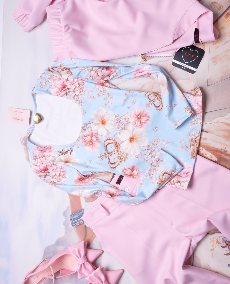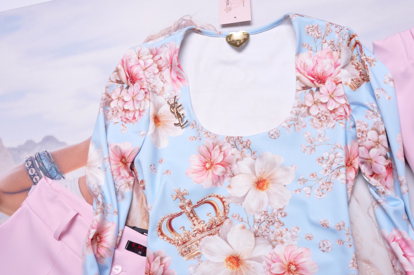 Niebieska bluzka o przylegającym fasonie w print kwiatów i koron. Wkładana przez głowę. Dekolt głęboki. Rękawy długie. Przy dekolcie zdobiona złotą agrafką. Materiał elastyczny.