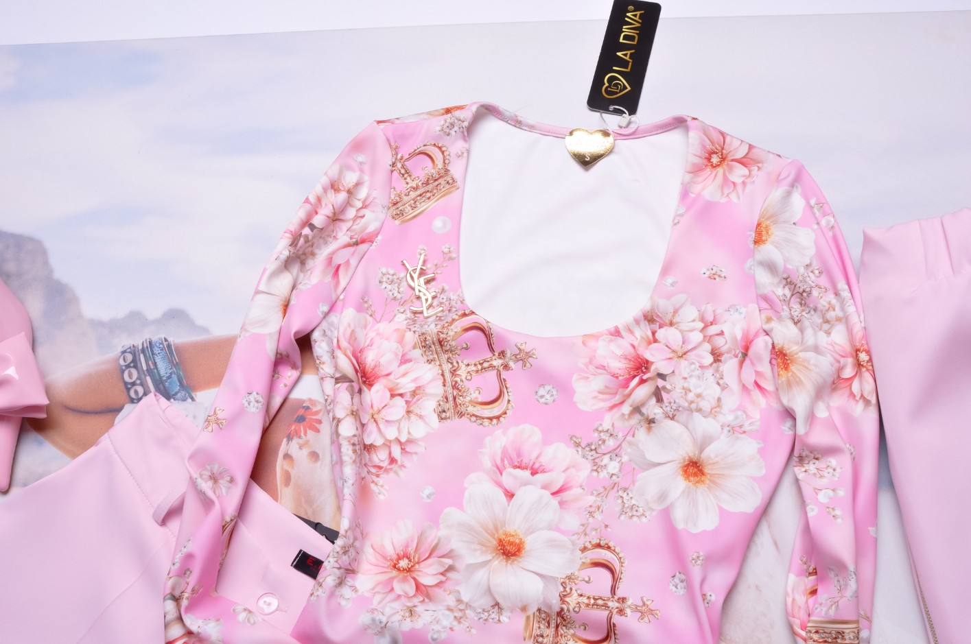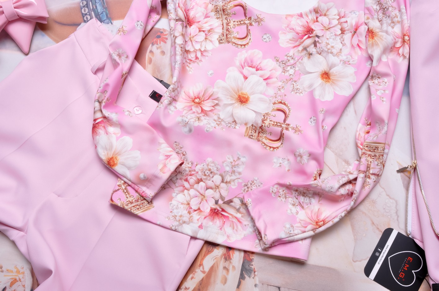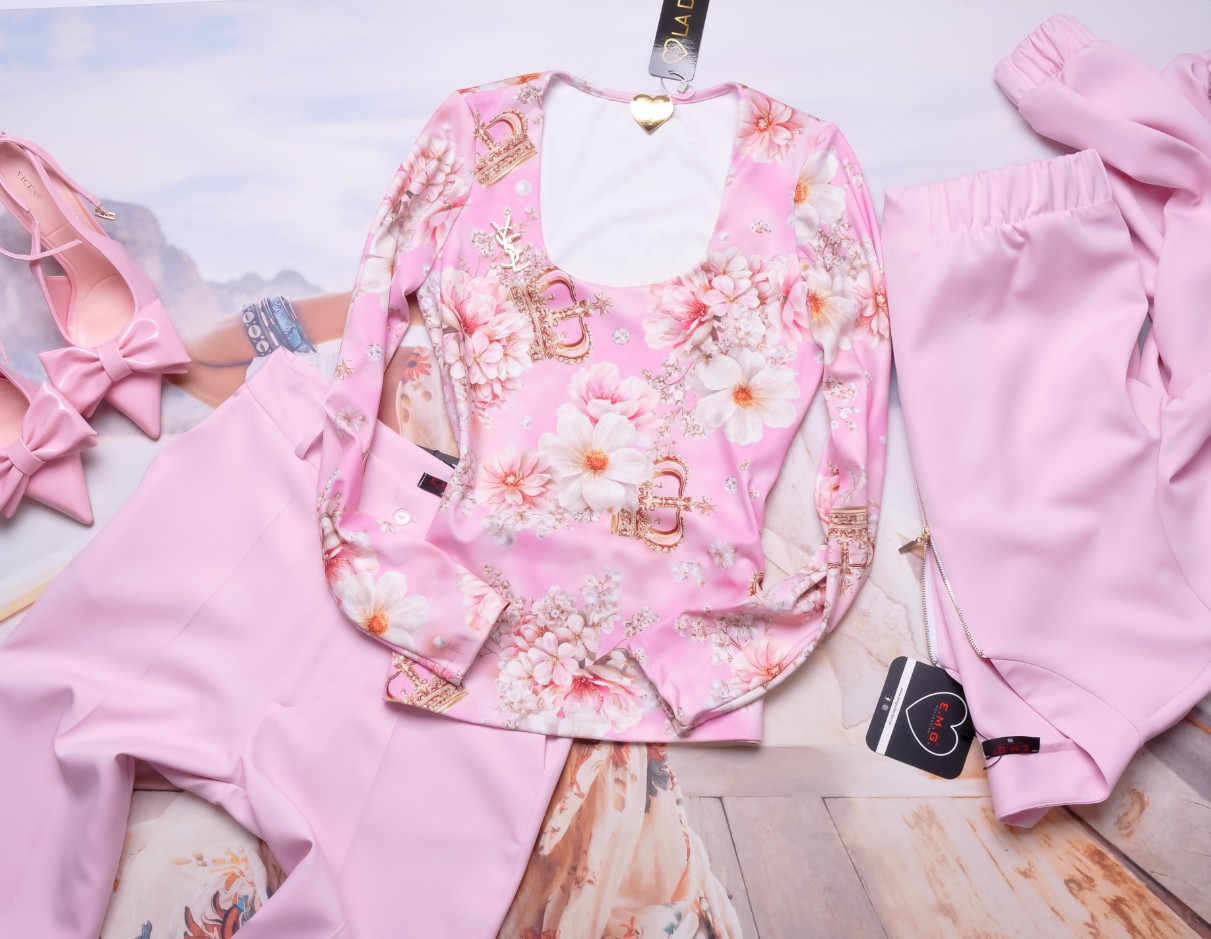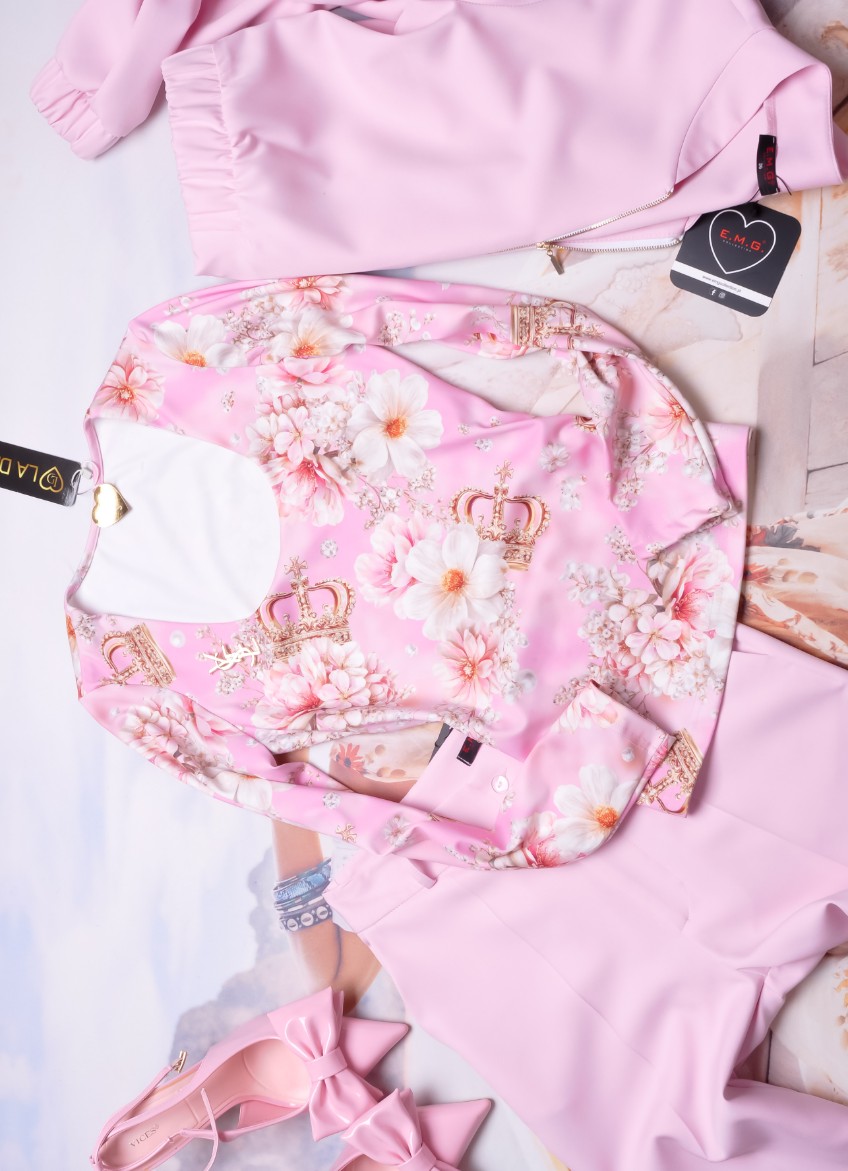 Różowa bluzka o przylegającym fasonie w print kwiatów i koron. Wkładana przez głowę. Dekolt głęboki. Rękawy długie. Przy dekolcie zdobiona złotą agrafką. Materiał elastyczny.