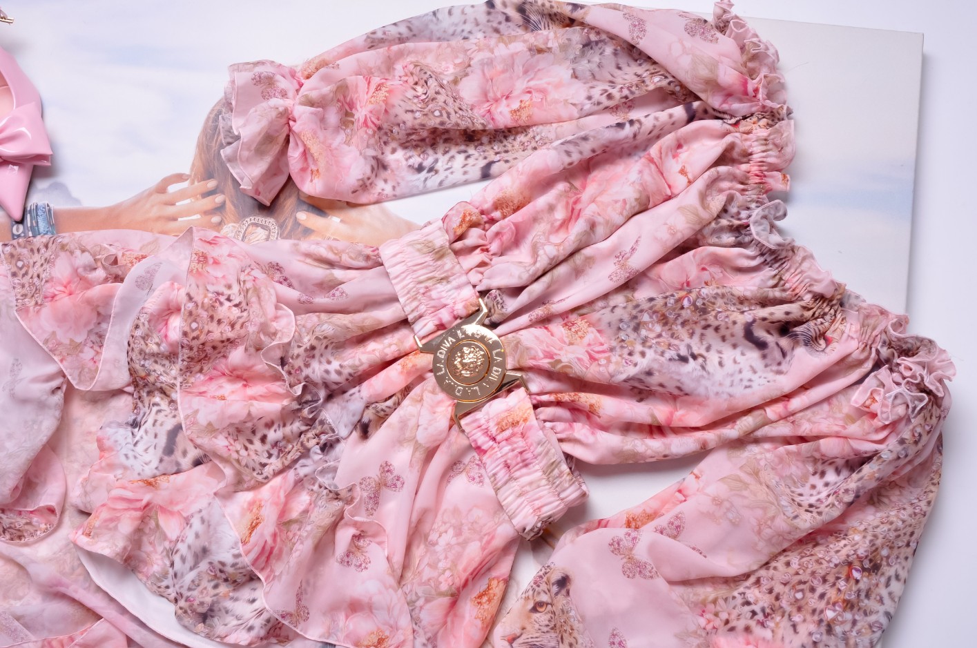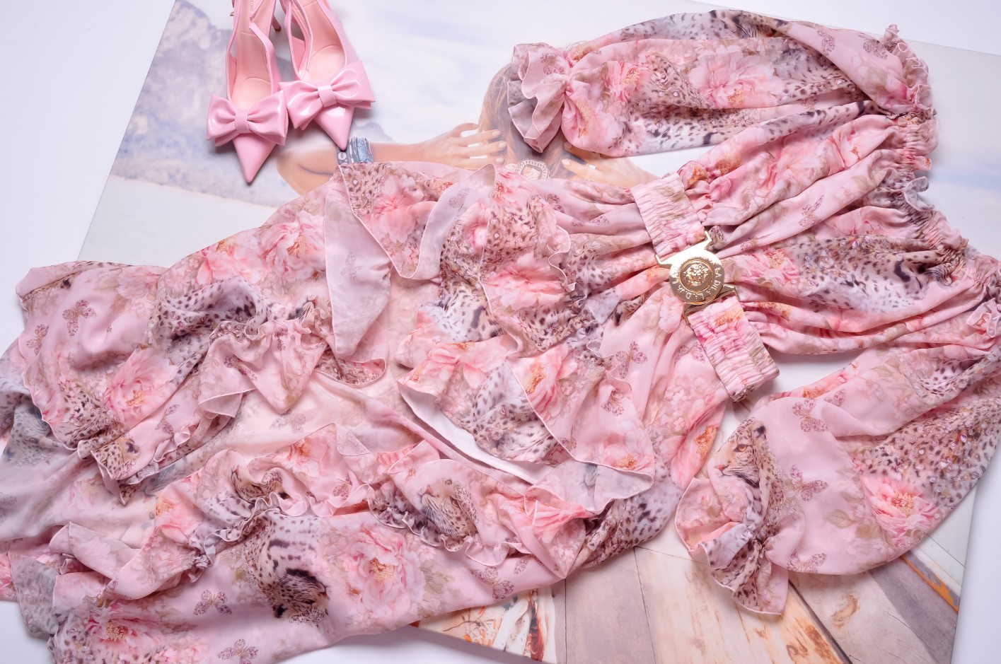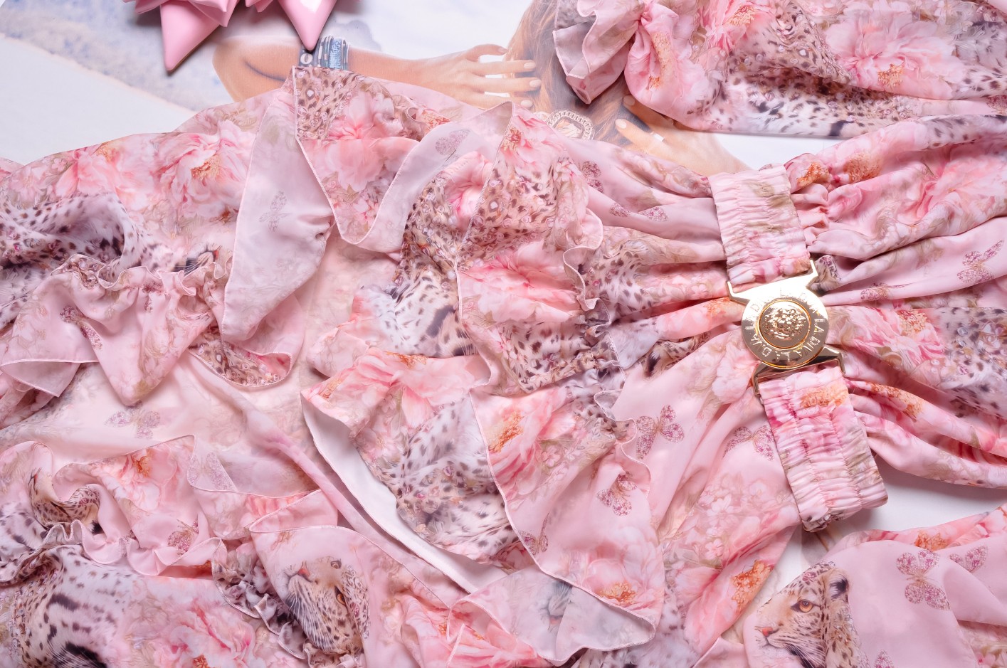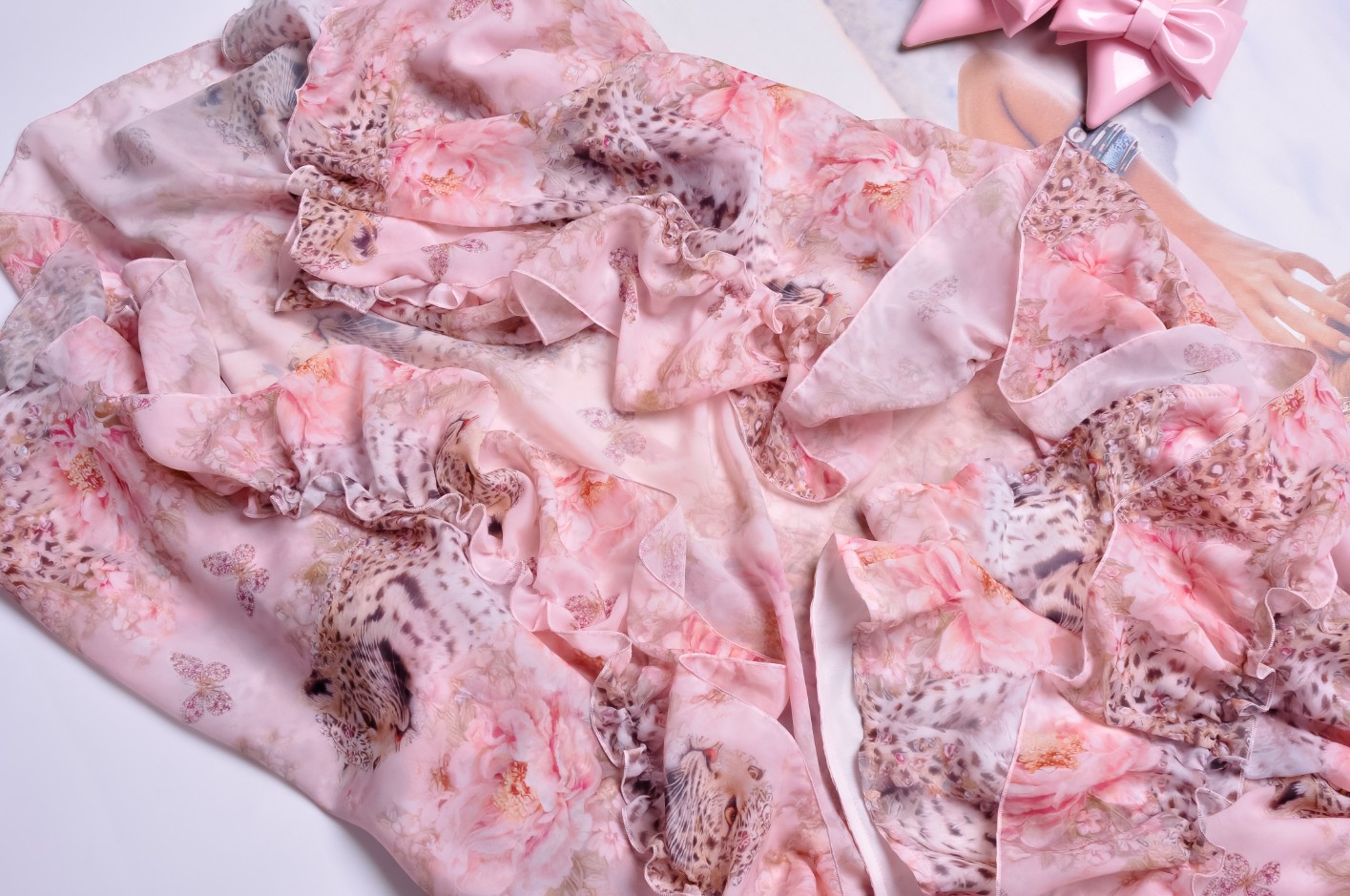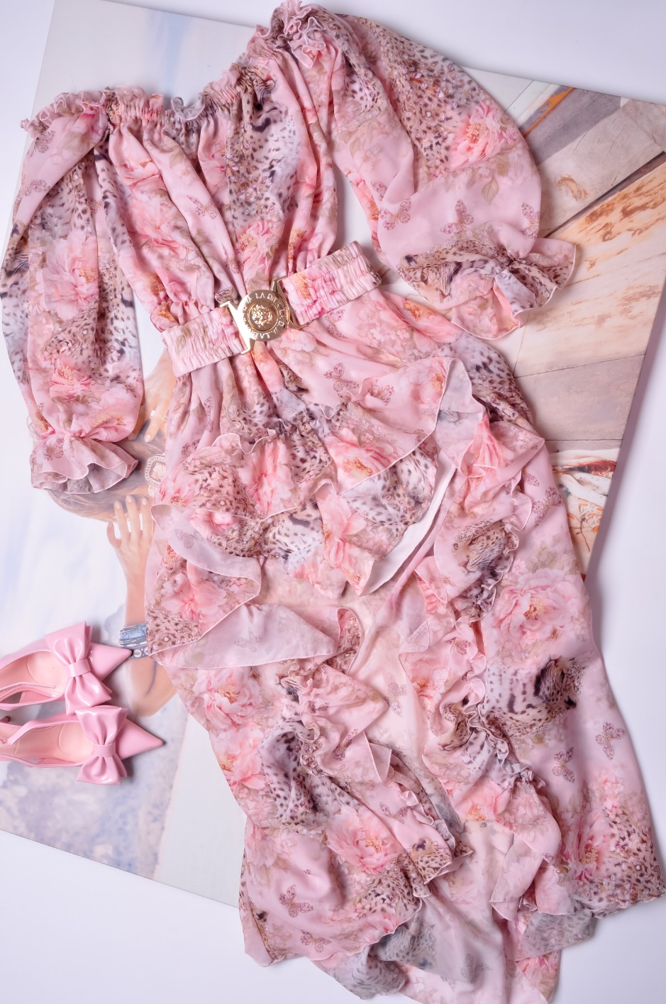 Kwiecista z motywem gepardów, asymetryczna sukienka/kombinezon Kleopatra w formie "hiszpanki". Model z długimi, bufiastymi rękawami. Przód krótszy, tył dłuższy. W talii gumka i w zestawie pasek do podkreślenia sylwetki.