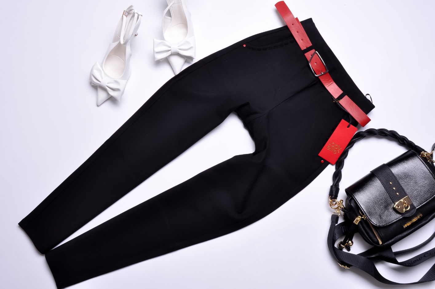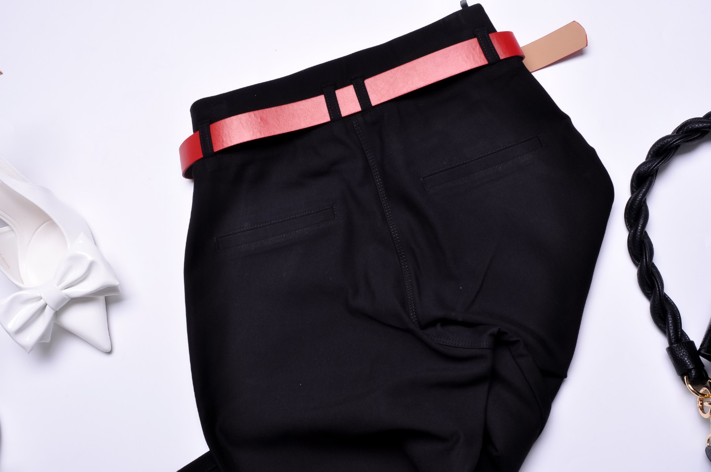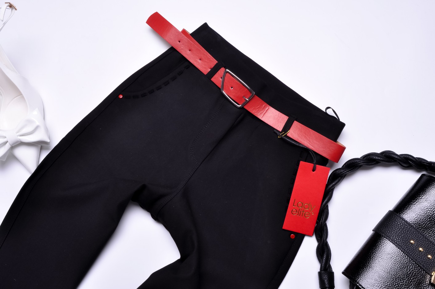 Uniwersalne spodnie materiałowe o dopasowanym fasonie. Nogawki zwężane. Wysoki stan. Kieszenie zdobione czarnymi cyrkoniami. Do zestawu czerwony pasek. W talii gumka dla lepszego dopasowania.