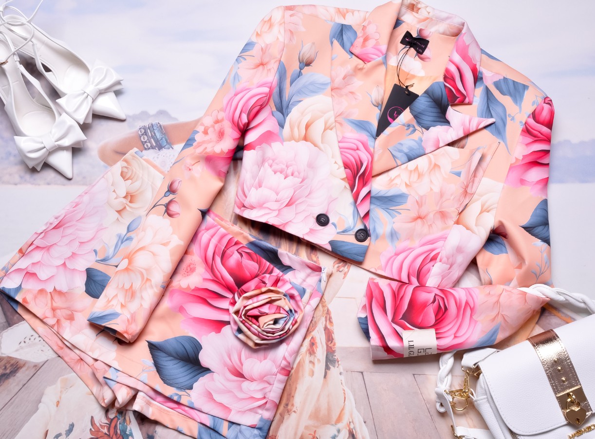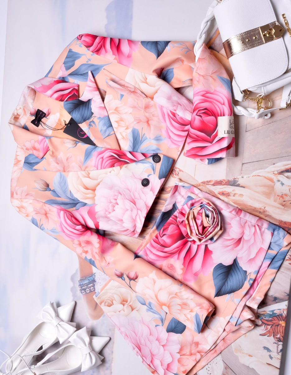 Zjawiskowy morelowy komplet składający się z krótkiej marynarki oraz spódnico-spodenek.