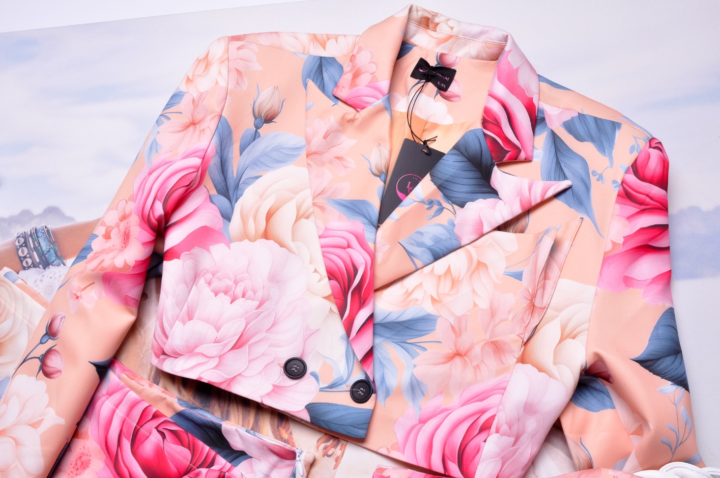 Marynarka z długimi szerokimi rękawami zapinana na guziczki.