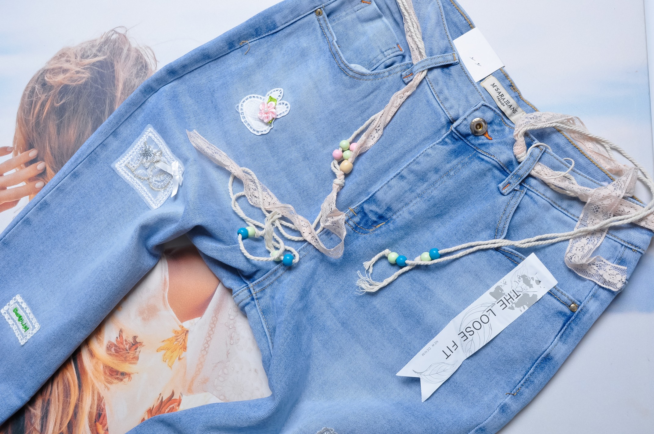 M.SARA - JEANSOWE SPODNIE - LOOSE FIT - NASZYWKI
