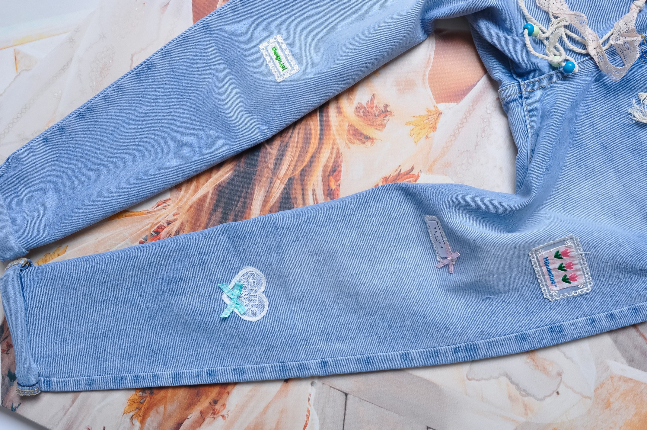 Jeansy w jasnym kolorze. Zapinane na zamek oraz guziczek. Z przodu i z tyłu dwie kieszenie. Z przodu zdobione wiosennymi naszywkami.