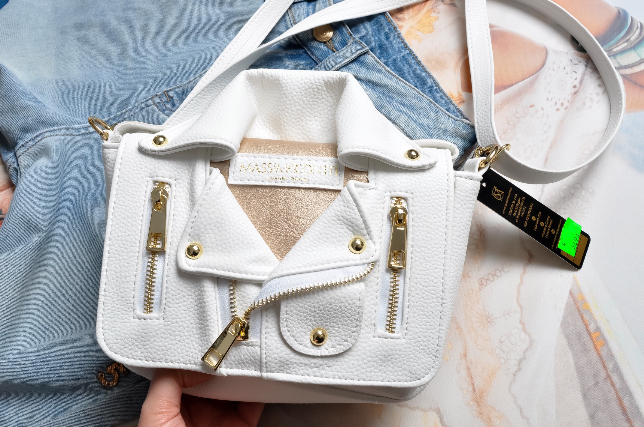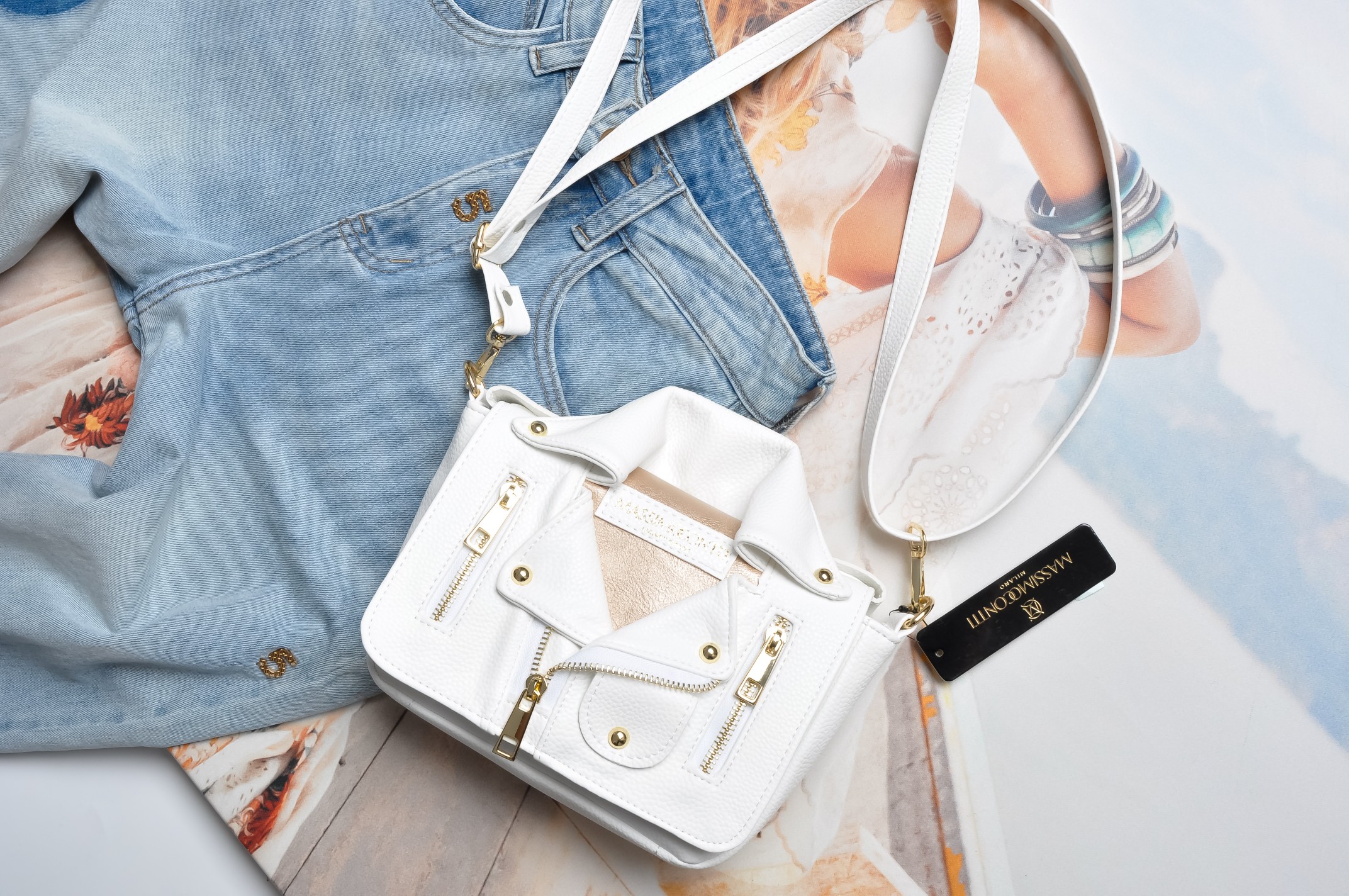 Mała torebka w białym kolorze. Posiada jedną główną komorę i jedną kieszonkę w środku. Z przodu zdobiona na wzór ramoneski. Posiada dwa paski. Wykonana ze skóry naturalnej.