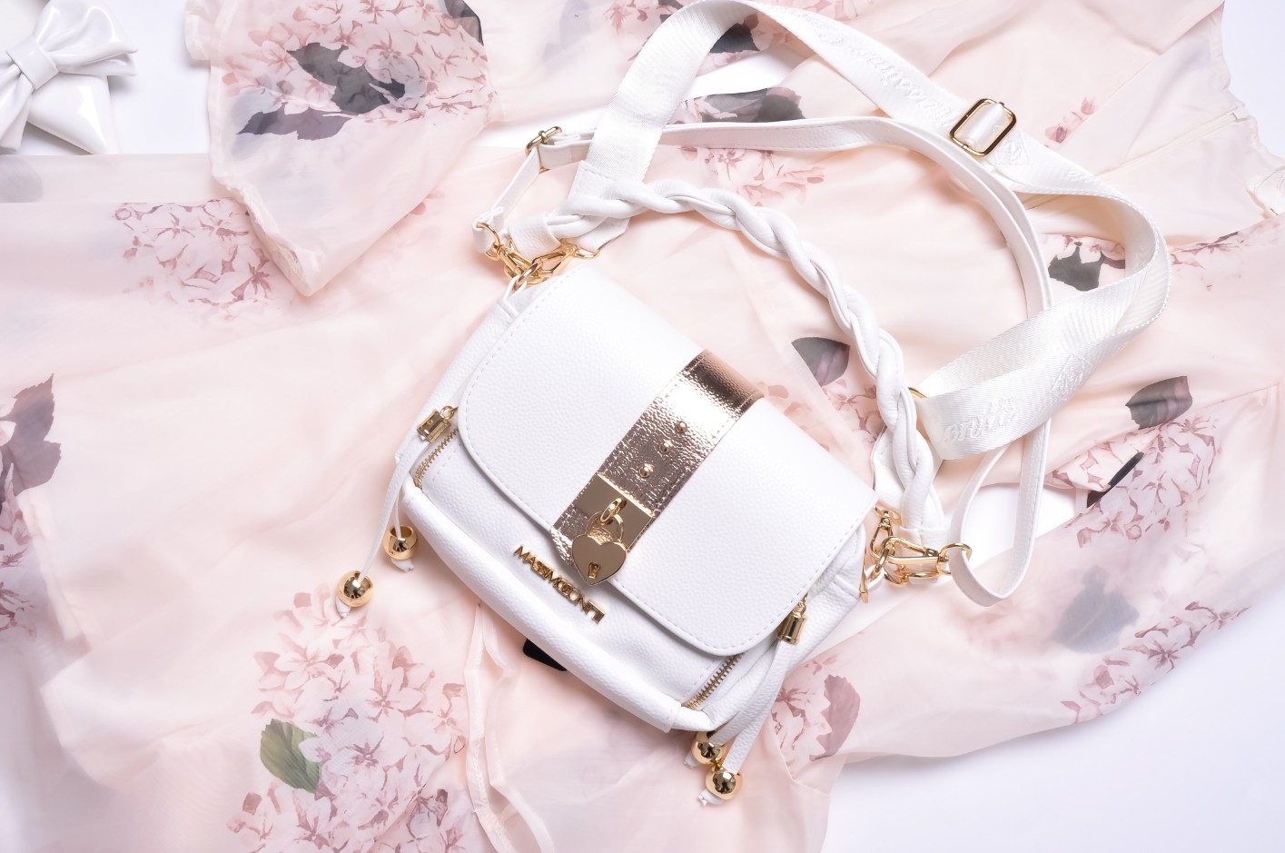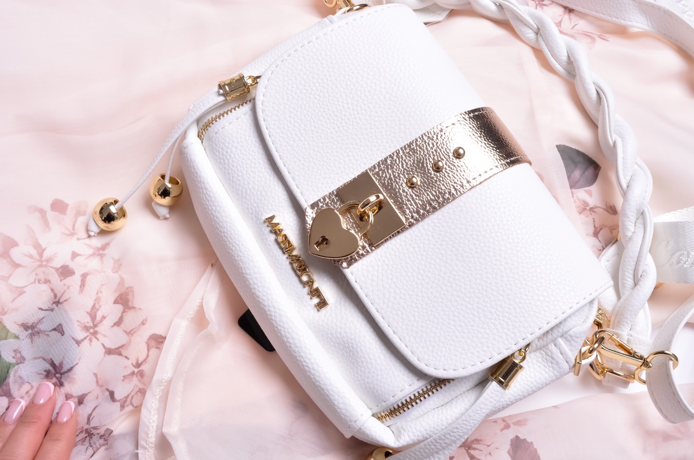 Mała torebka w białym kolorze. Posiada jedną główną komorę i dwie kieszonki w środku. Z przodu i z tyłu dodatkowe kieszonki na zamek. Posiada dwa paski. Wykonana ze skóry naturalnej.