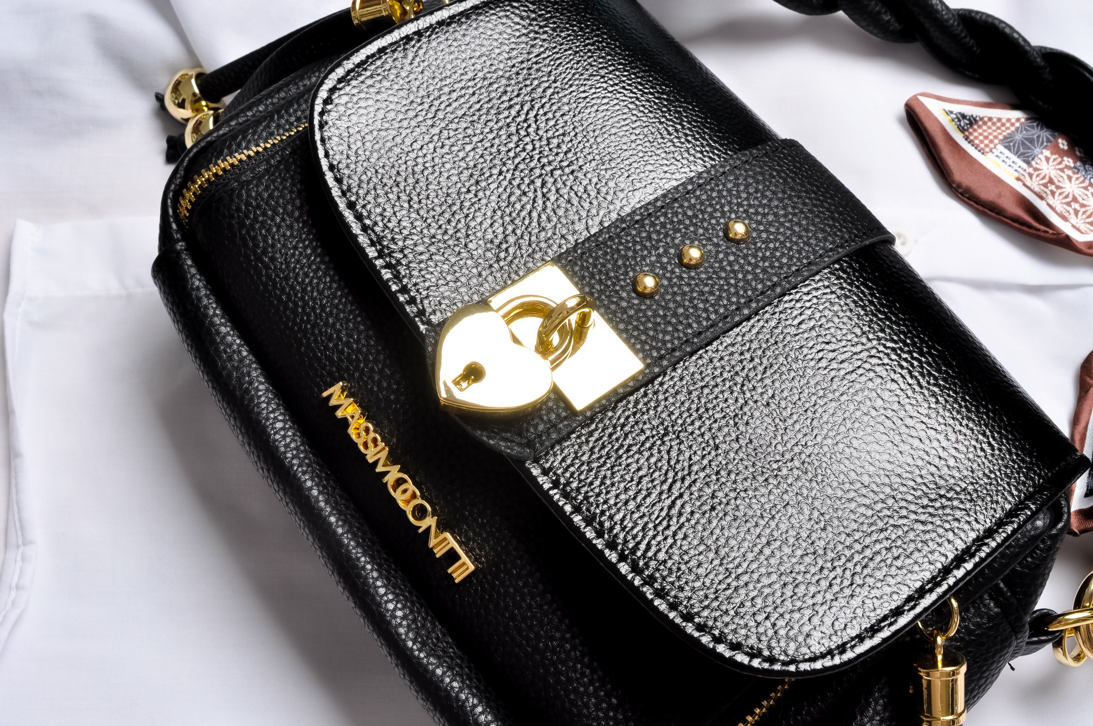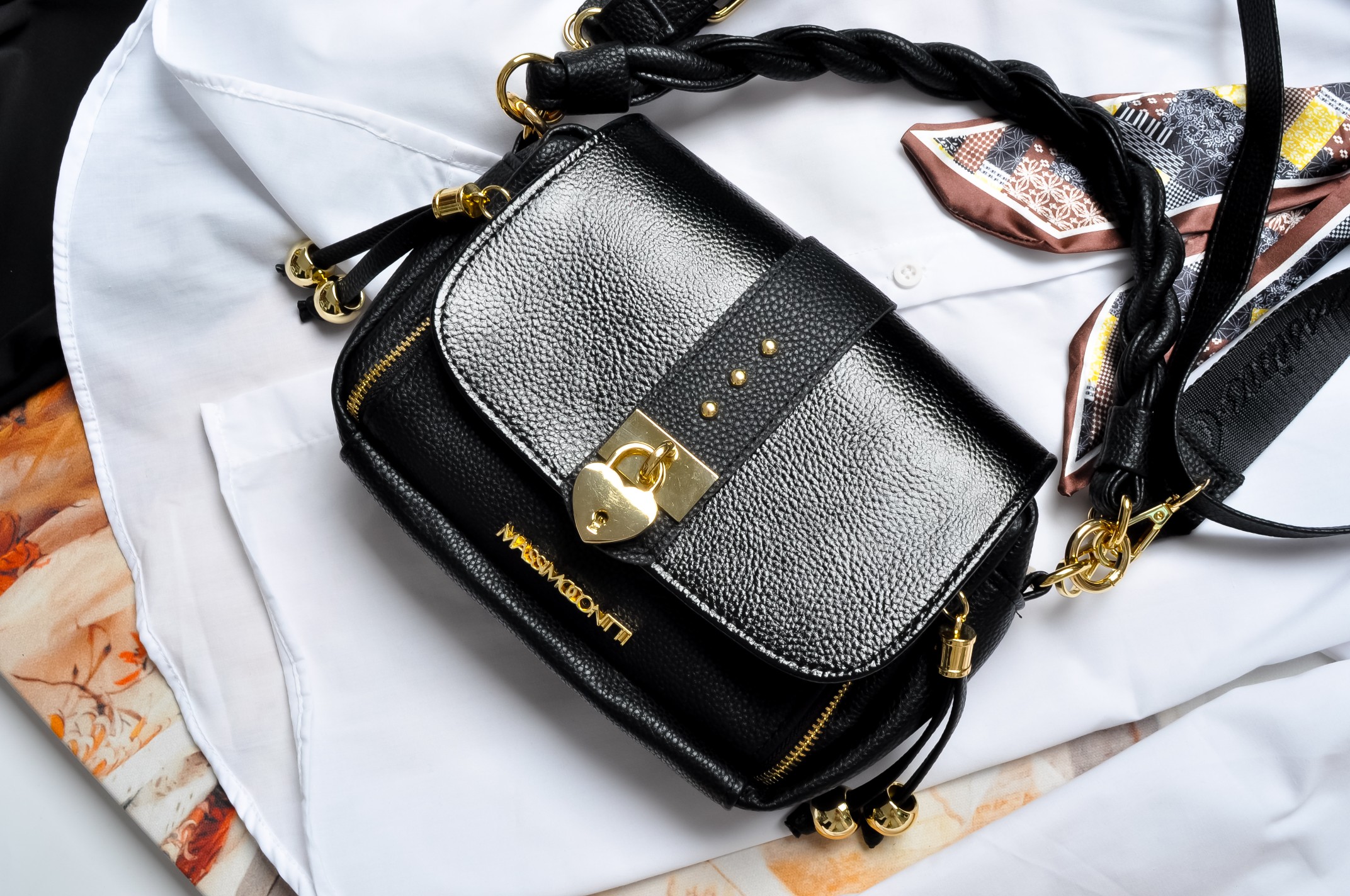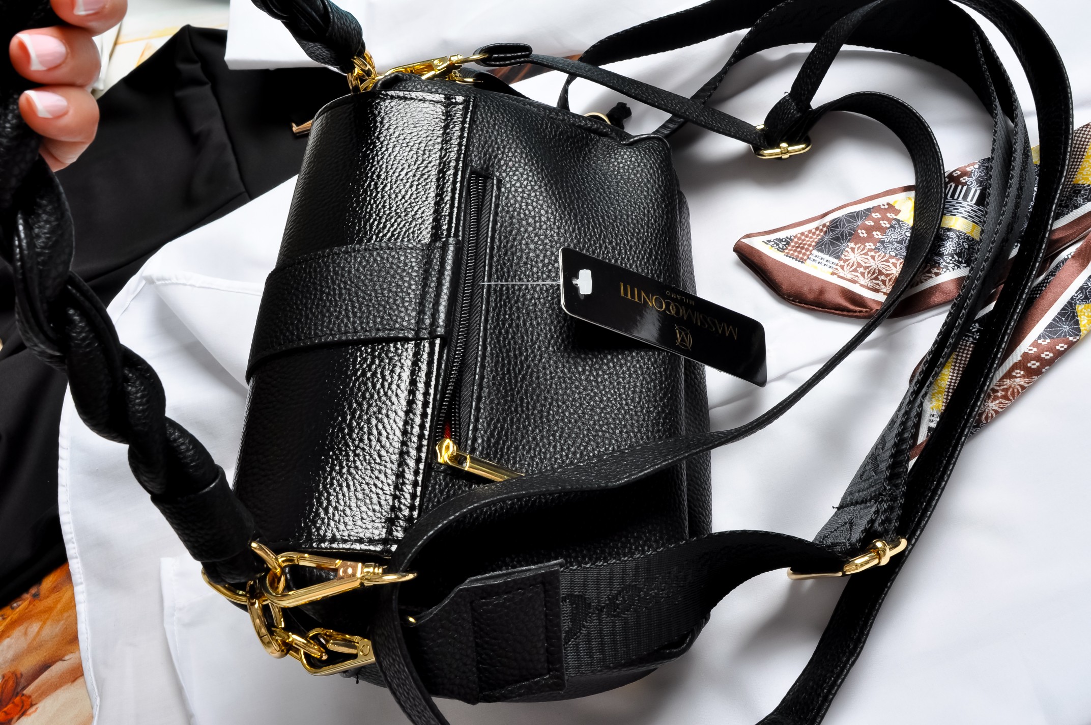 Mała torebka w czarnym kolorze. Posiada jedną główną komorę i dwie kieszonki w środku. Z przodu i z tyłu dodatkowe kieszonki na zamek. Posiada dwa paski. Wykonana ze skóry naturalnej.