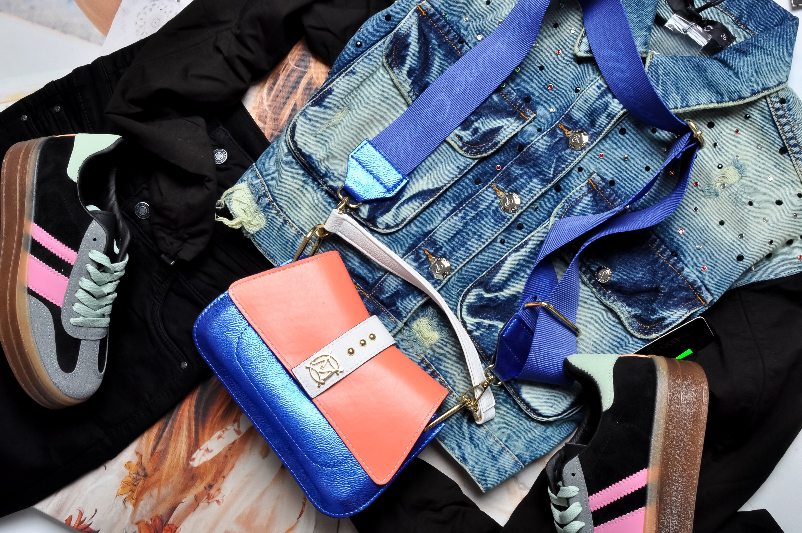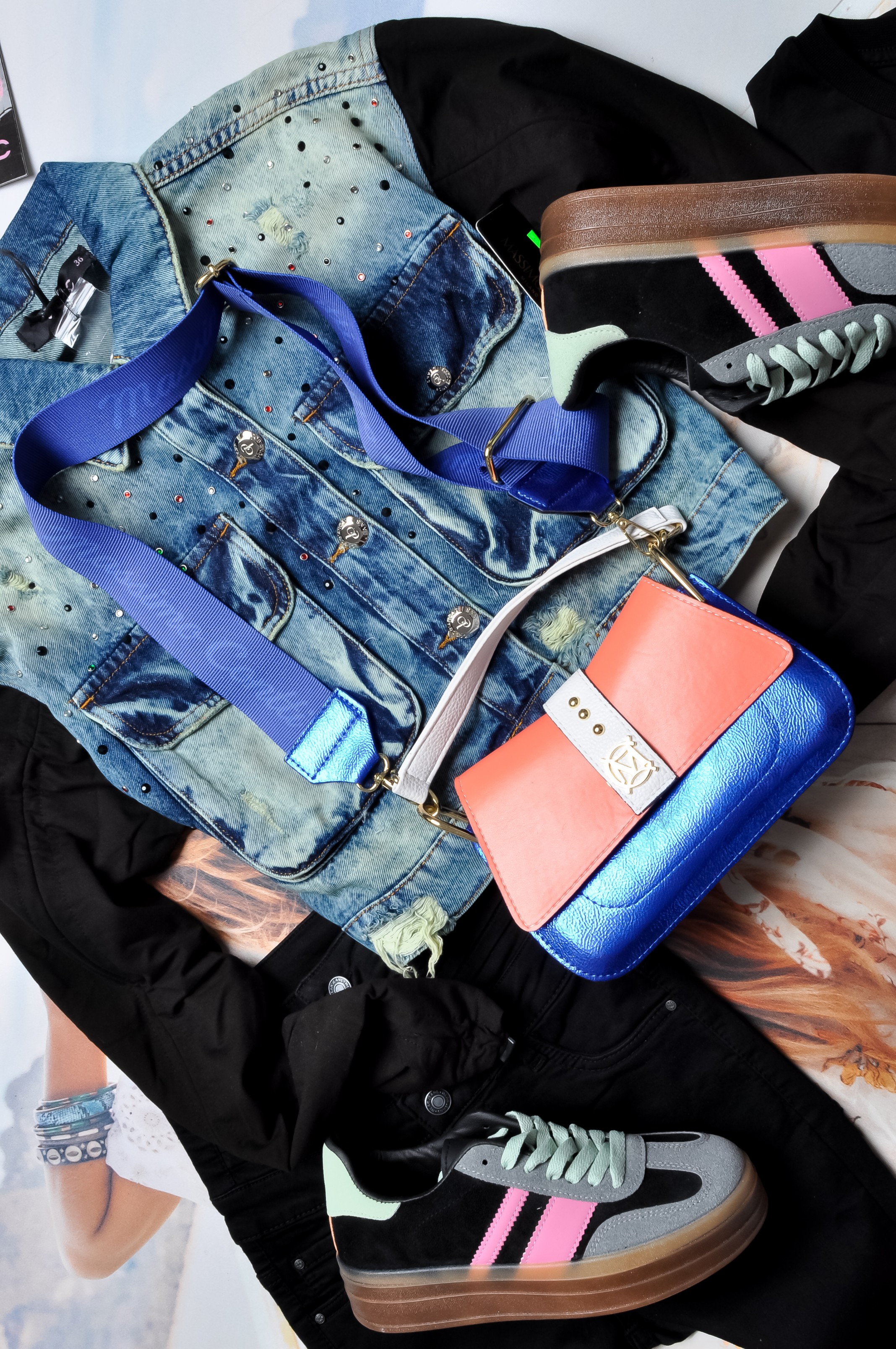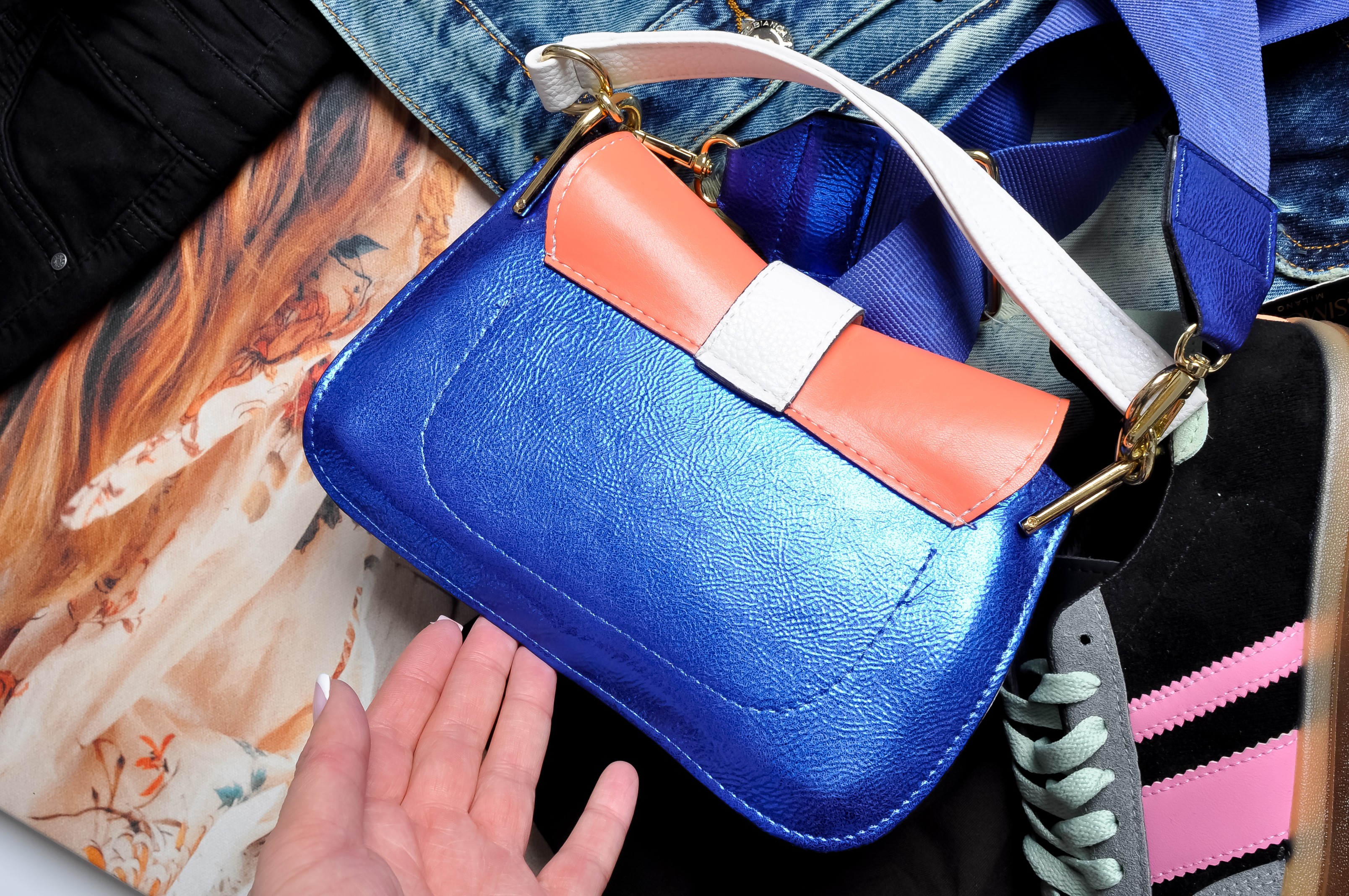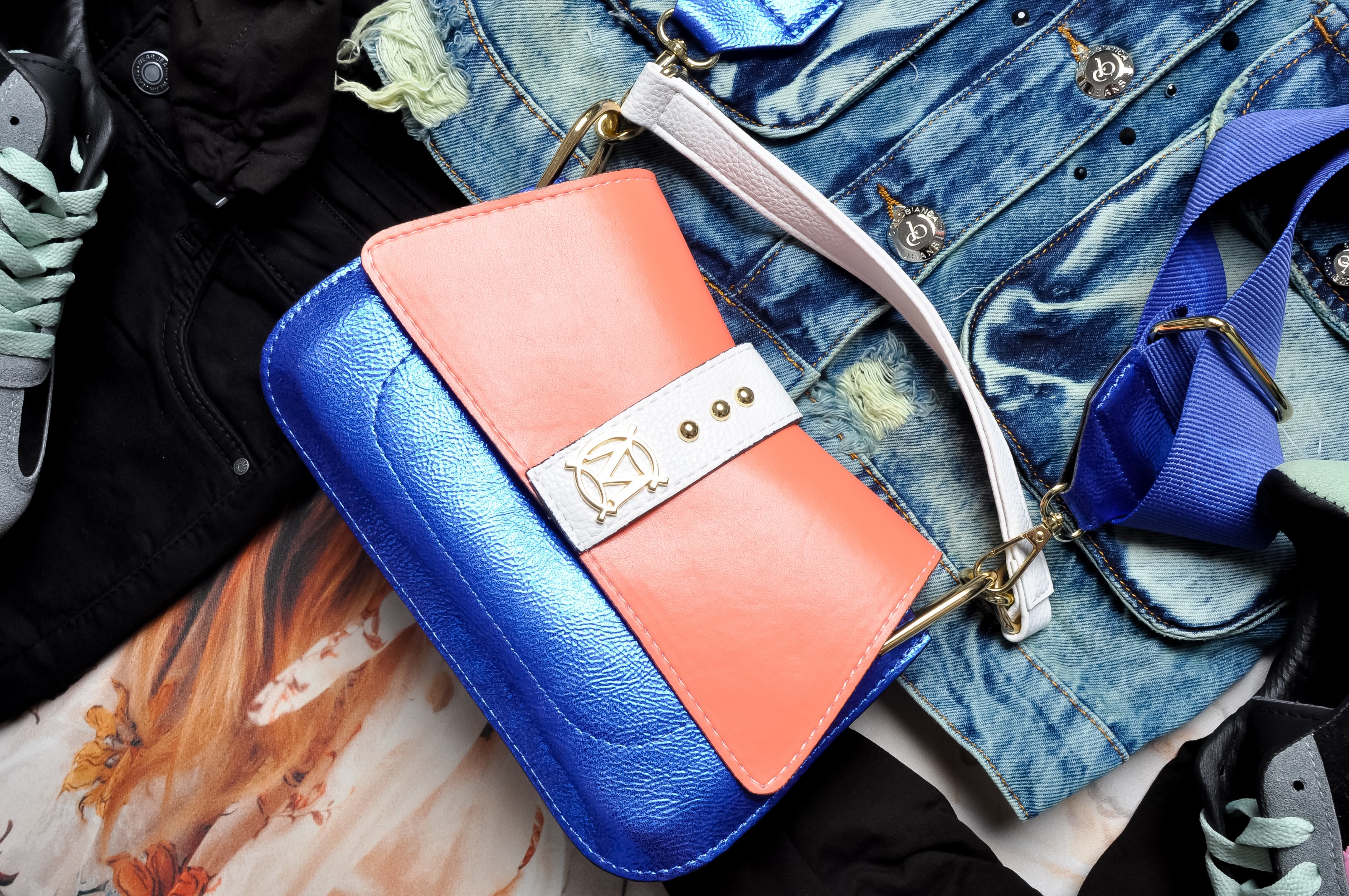 Torebka na ramię w metalicznym granatowym kolorze z klapą w kolorze pomarańczowym. Zdobiona złotymi elementami na przodzie. Do torebki dołączone są dwa długie paski w kolorze granatowym - cienki metaliczny i gruby materiałowy. W środku torebka posiada dwie wewnętrzne kieszonki. Idealna na każde wyjście, na każdą okazję.