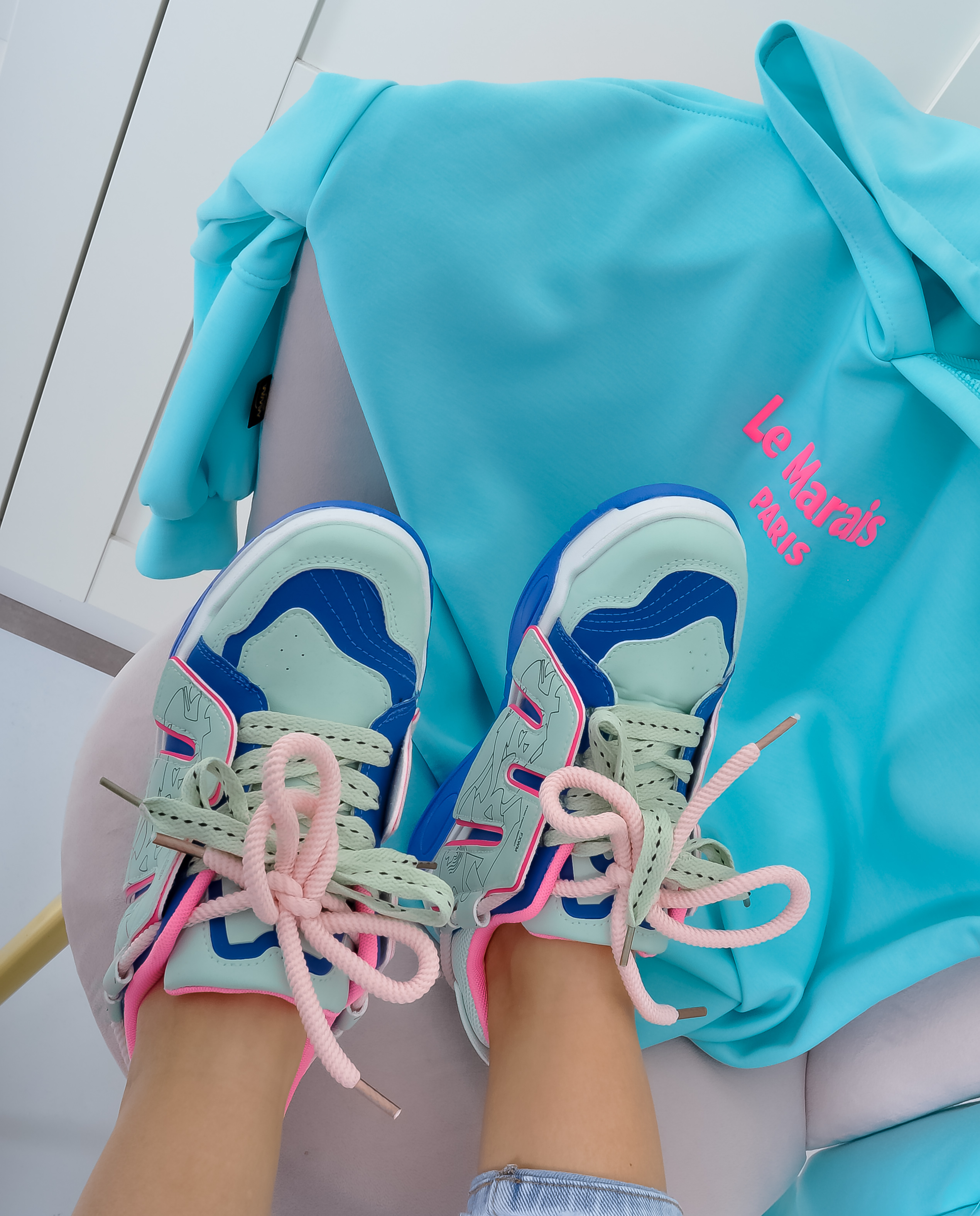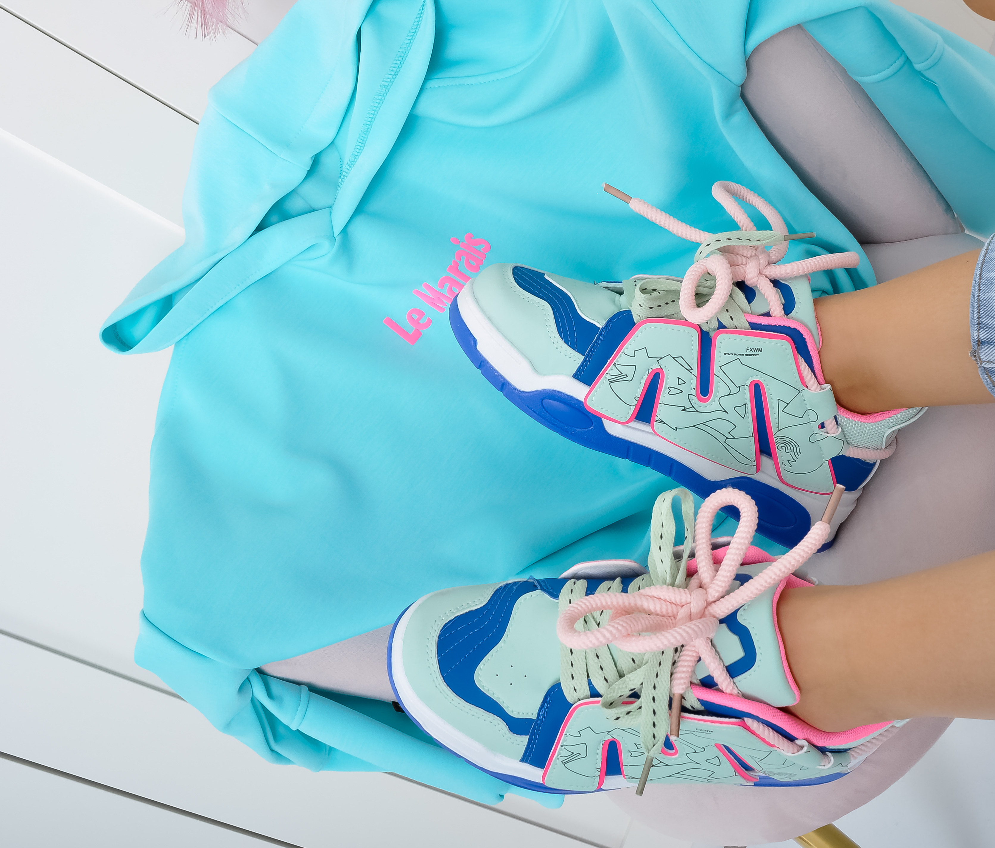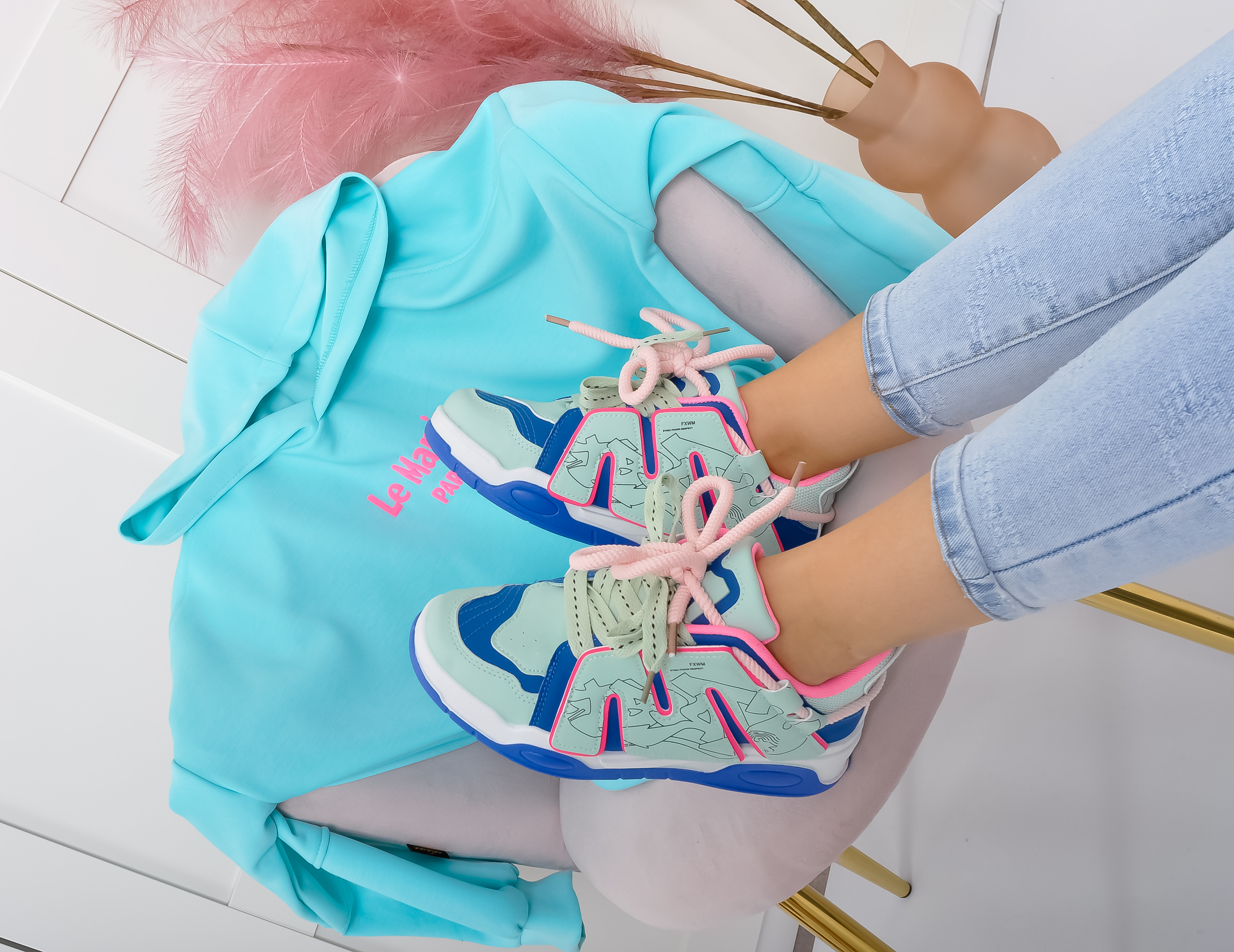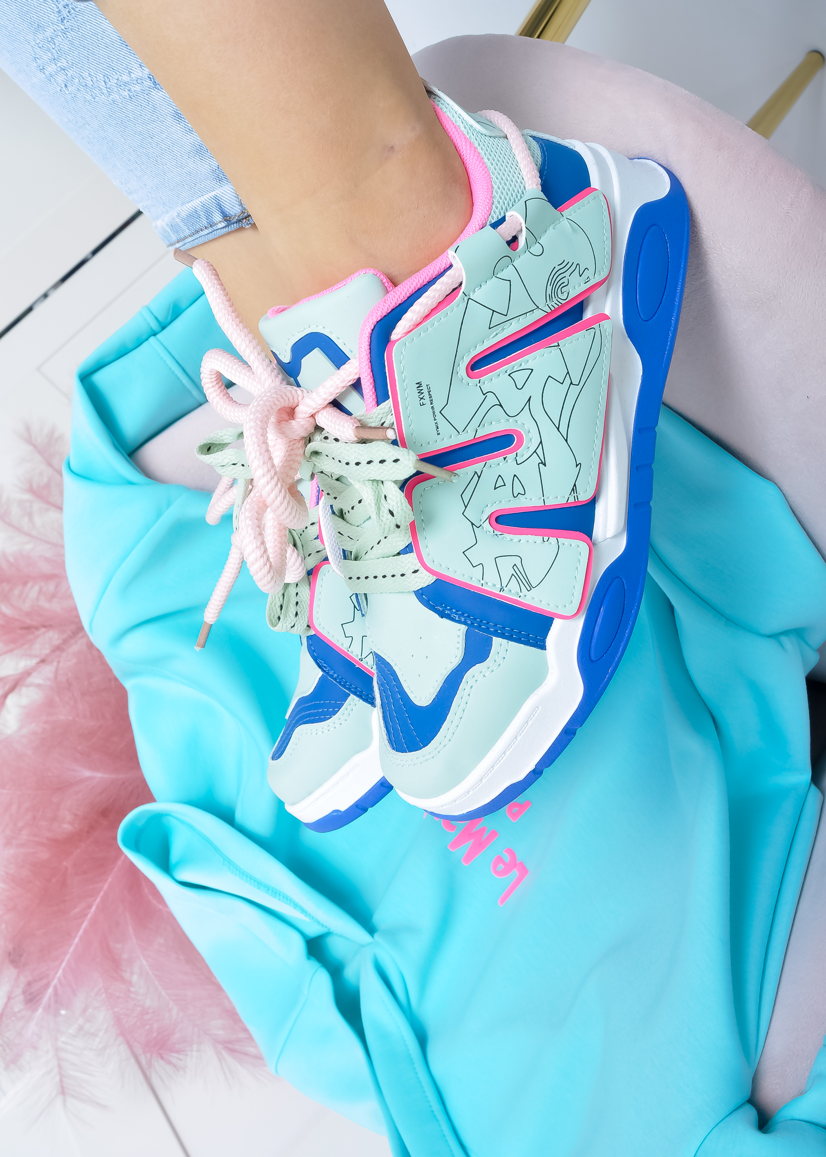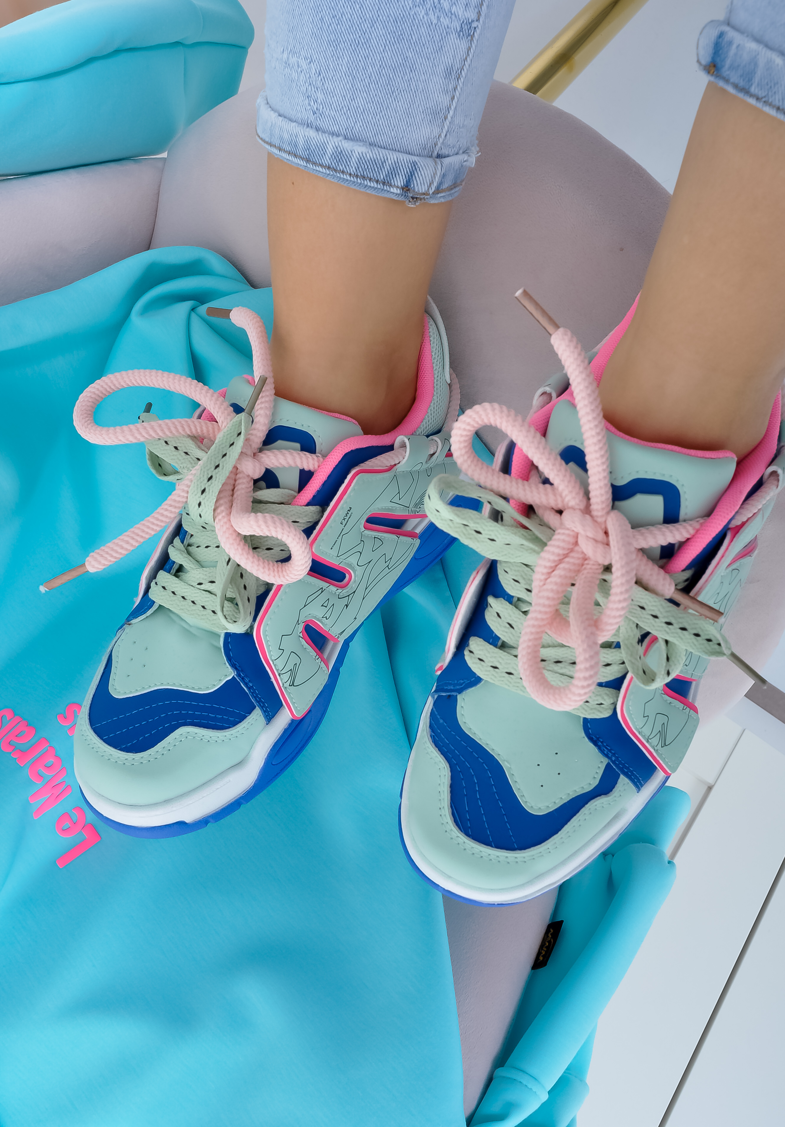 Sznurowane sneakersy na grubej podeszwie. Buty są w połączeniu kolorów: miętowym, niebieskim i różowym. Wiązane na różowe i miętowe sznurówki.