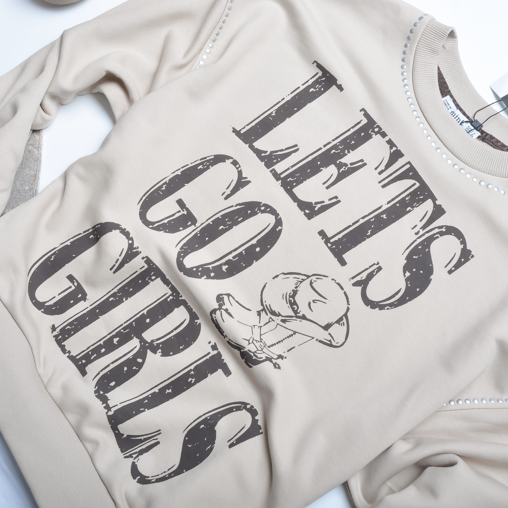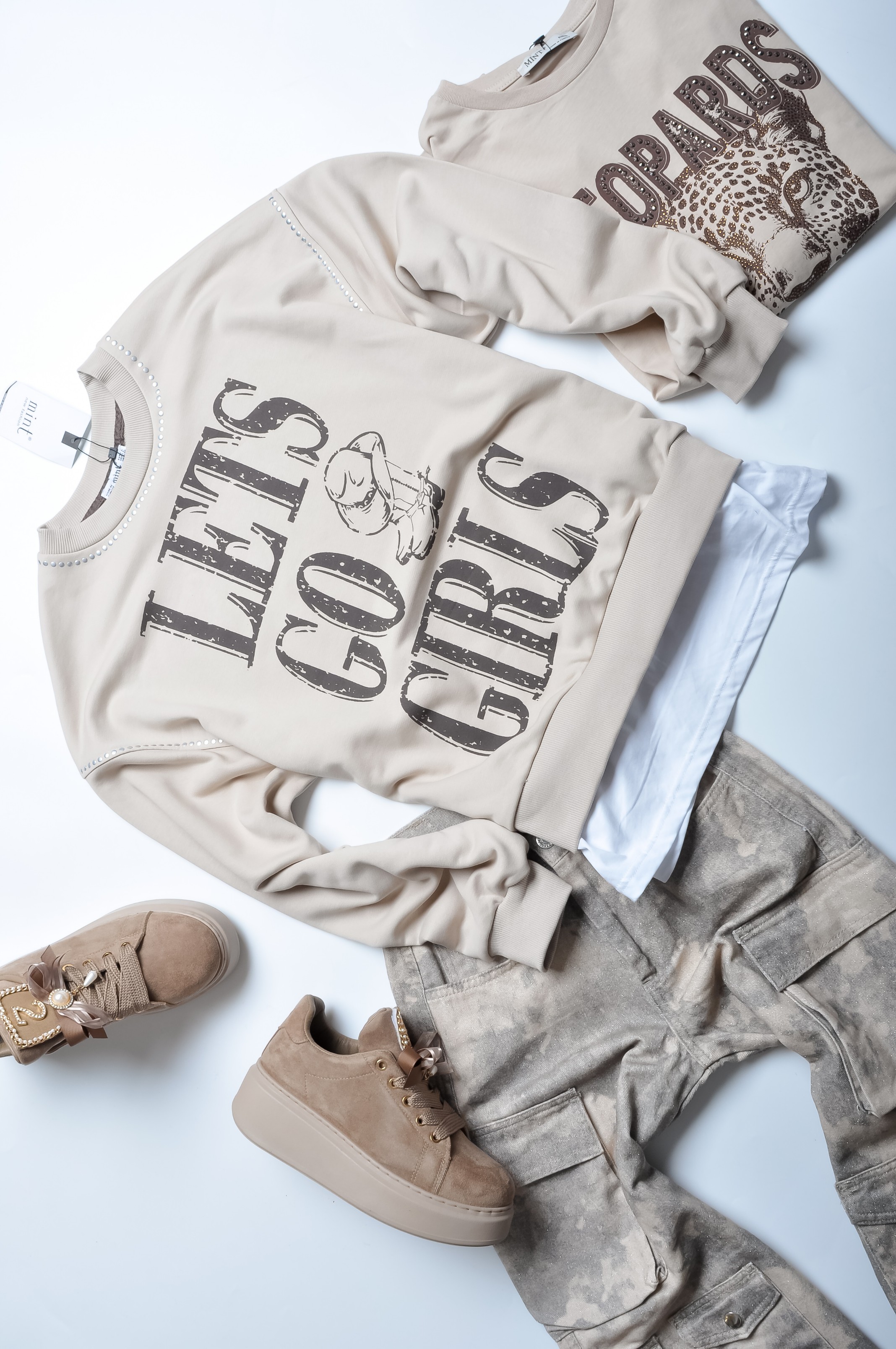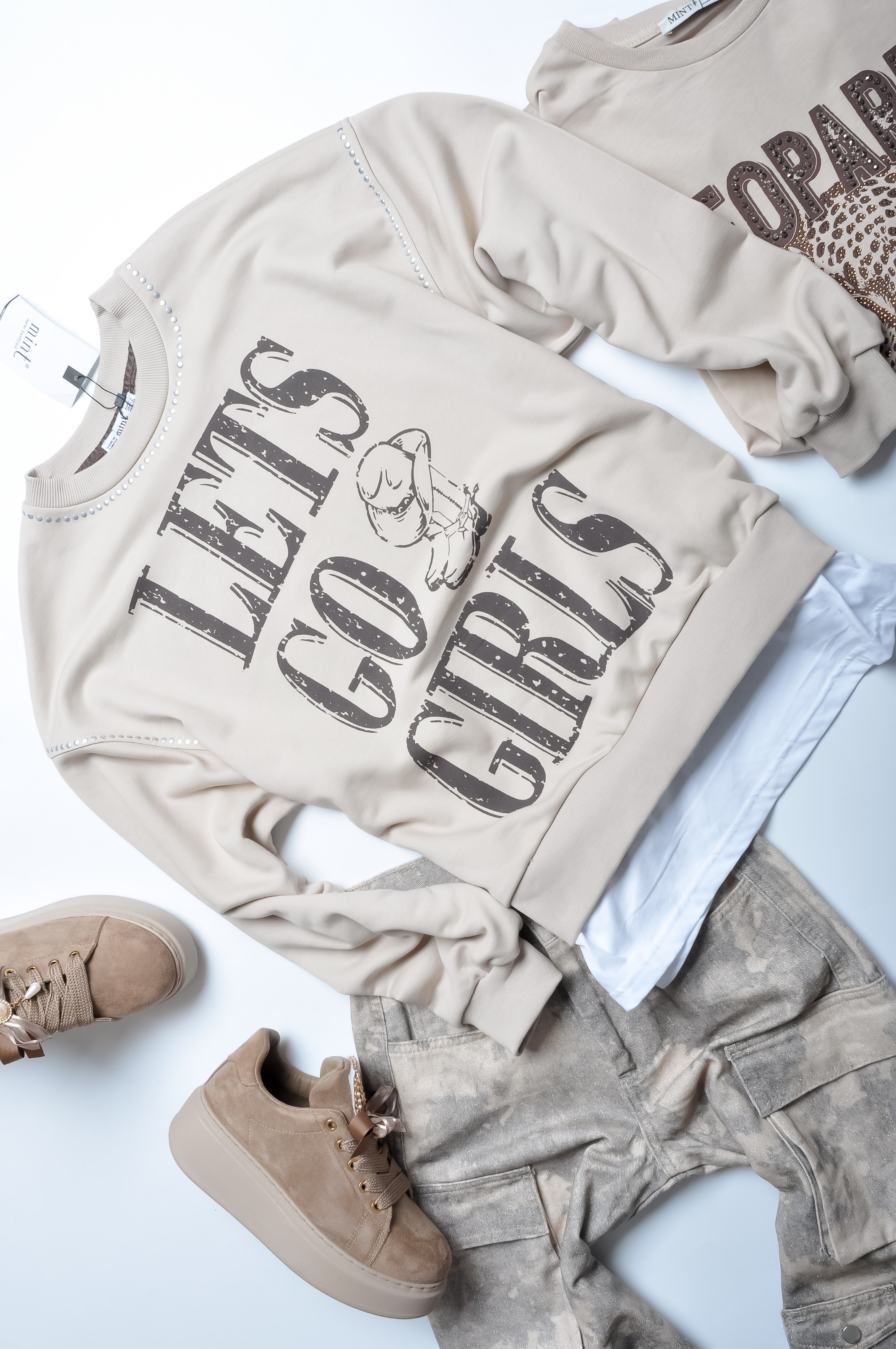 Śliczna bluza w beżowym kolorze. Wkładana przez głowę. Dekolt okrągły. Rękawy długie, obniżona linia ramion. Fason oversize, nieprzylegający. Imitująca koszulkę pod spodem. Aplikacja brązowych napisów "LETS GO GIRLS". Linia ramion i dekoltu wyszyta srebrnymi cyrkoniami.
