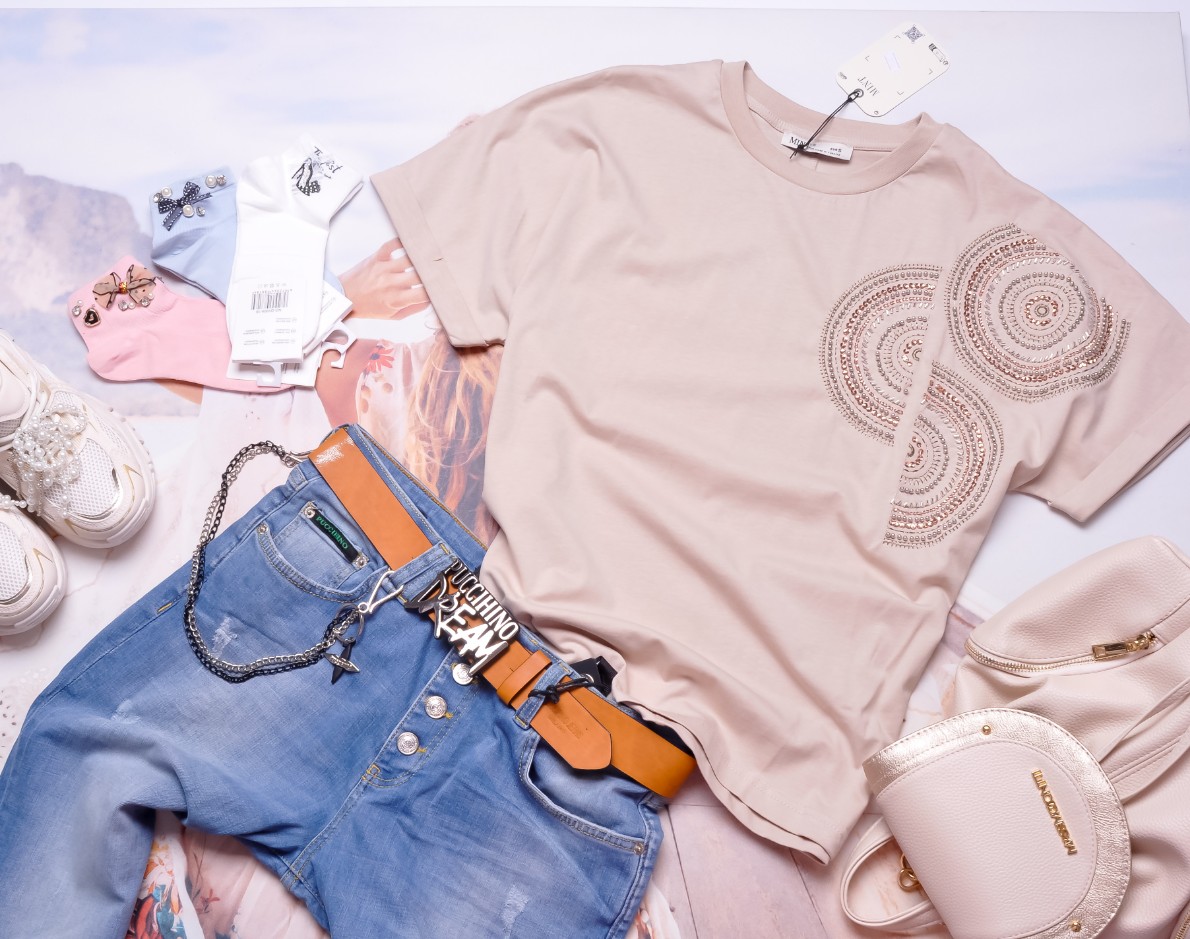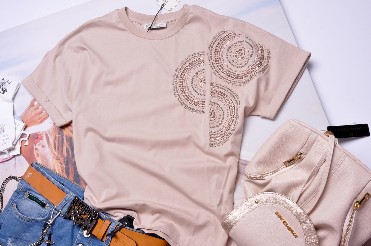 Śliczna bluzka w beżowym kolorze. Wkładana przez głowę. Dekolt okrągły. Rękawy krótkie. Fason oversize, nieprzylegający. Obniżona linia ramion. Wykończona cyrkoniową aplikacją kół.