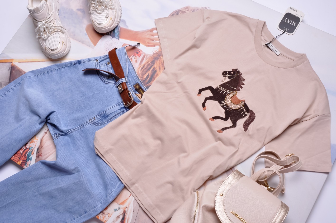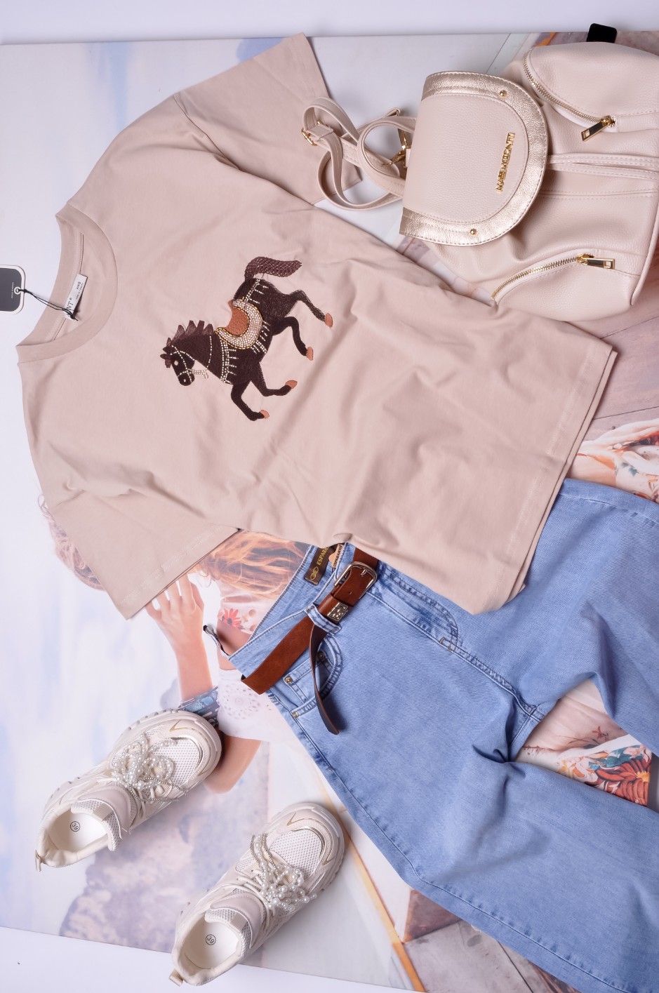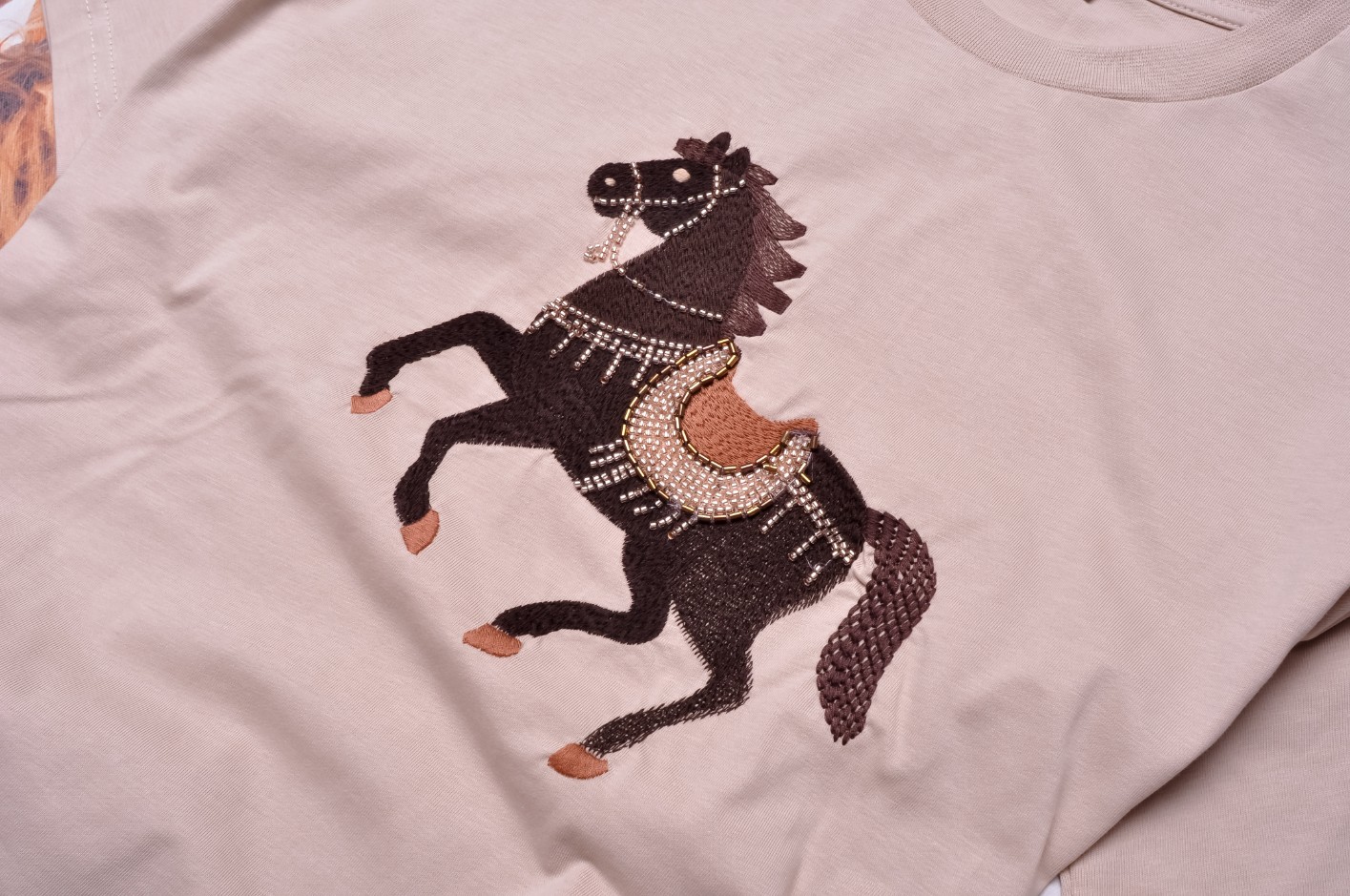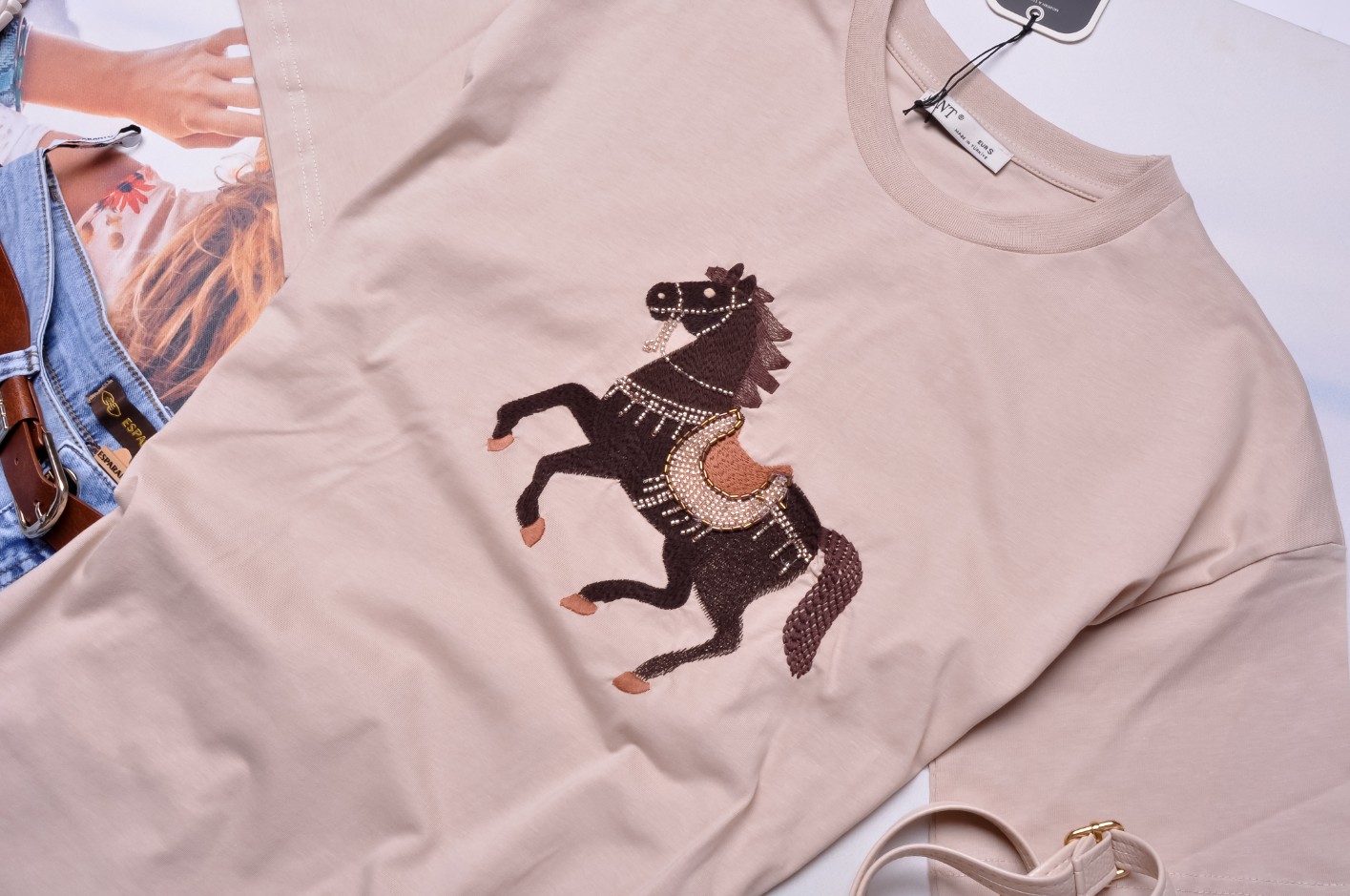 Śliczna bluzka w beżowym kolorze. Wkładana przez głowę. Dekolt okrągły. Rękawy krótkie. Zdobiona haftowanym koniem zdobionym koralikami. Fason oversize, nieprzylegający. Obniżona linia ramion.