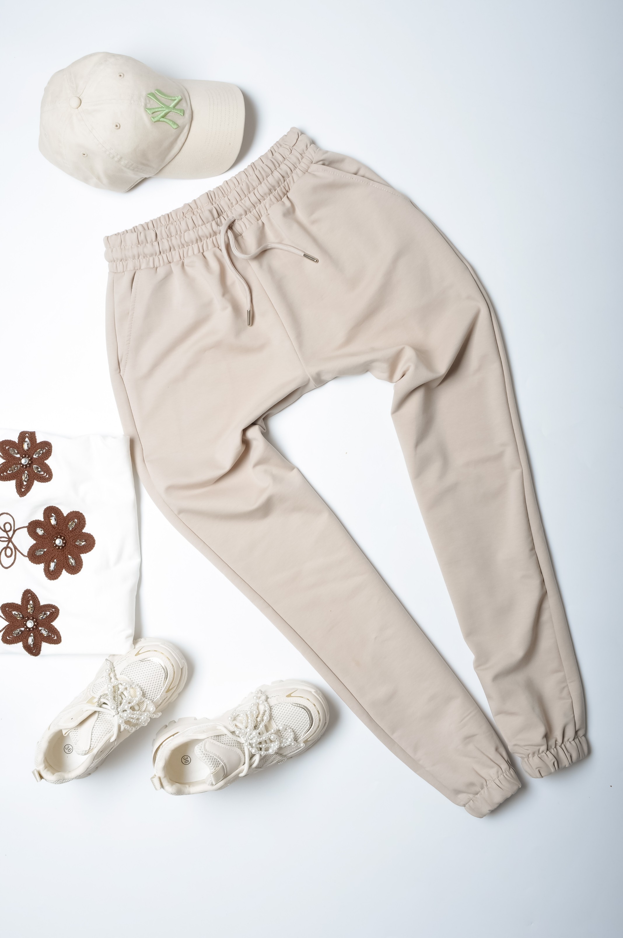Spodnie w beżowym kolorze. W pasie gumka i sznureczek dla lepszego dopasowania. Po bokach kieszenie.