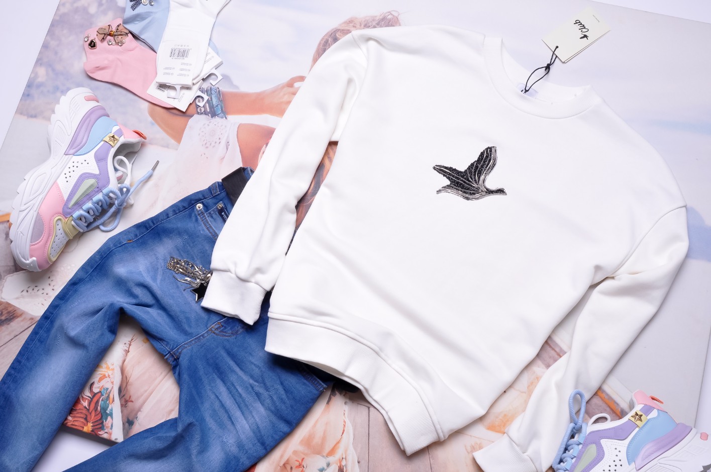 Śliczna bluza w białym kolorze. Wkładana przez głowę. Dekolt okrągły. Rękawy długie. Fason oversize, nieprzylegający. Wykończona aplikacją cyrkoniowego ptaka.