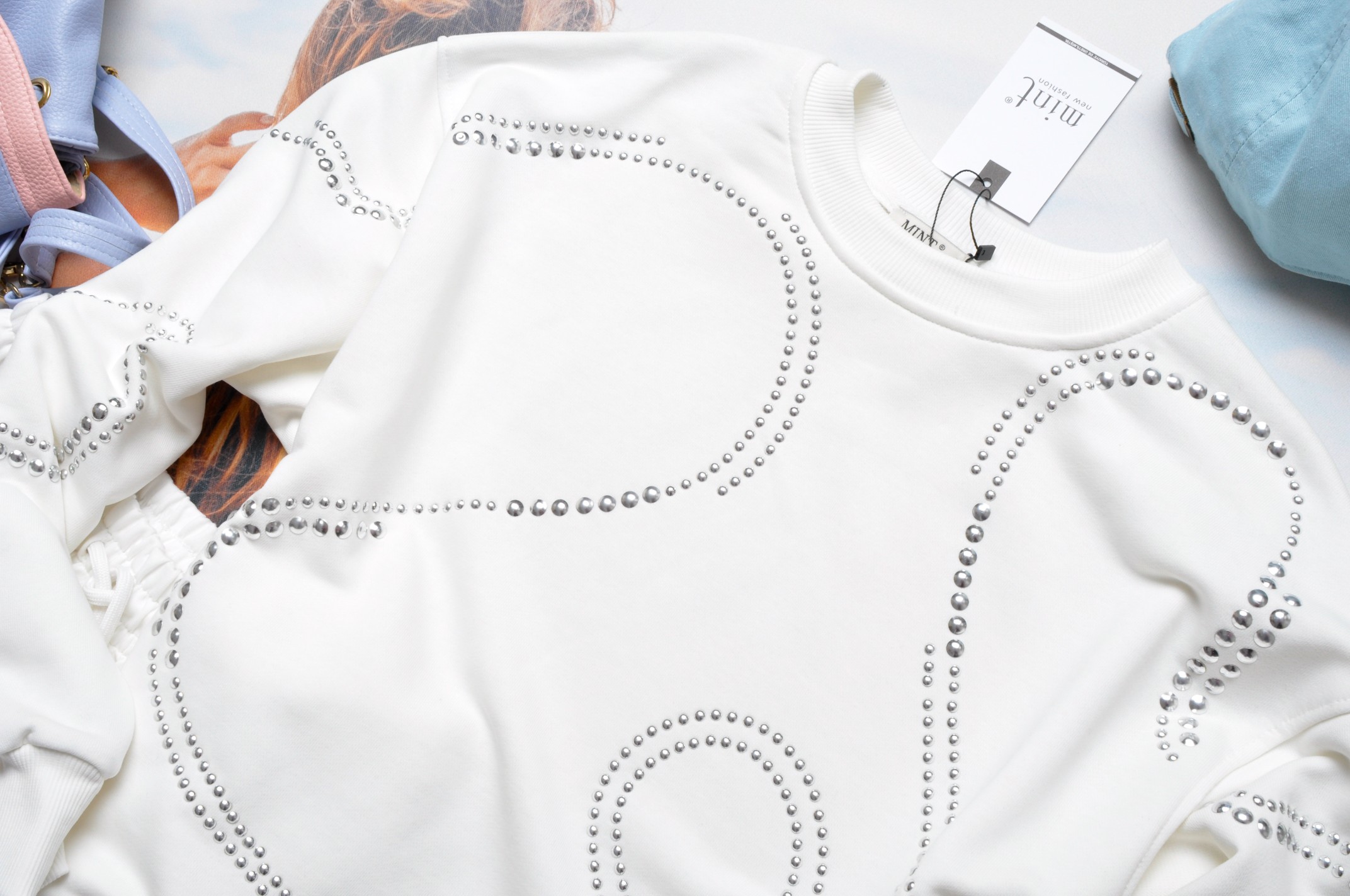 Śliczna bluza w białym kolorze. Wkładana przez głowę. Dekolt okrągły. Rękawy długie, obniżona linia ramion. Fason oversize, nieprzylegający. Wykończona aplikacją.