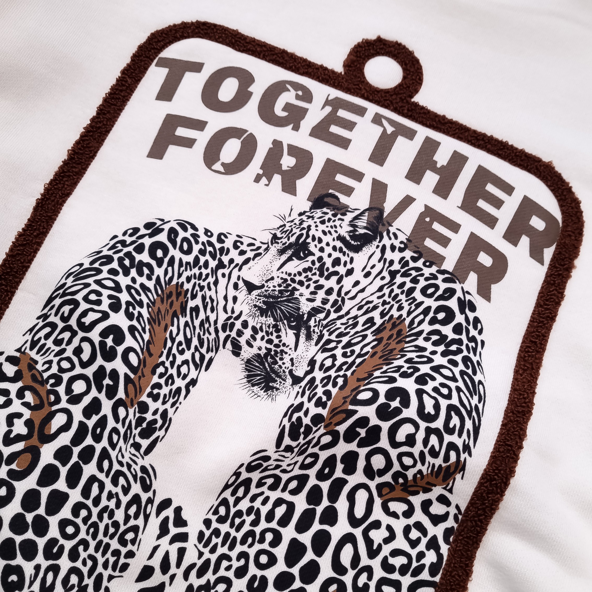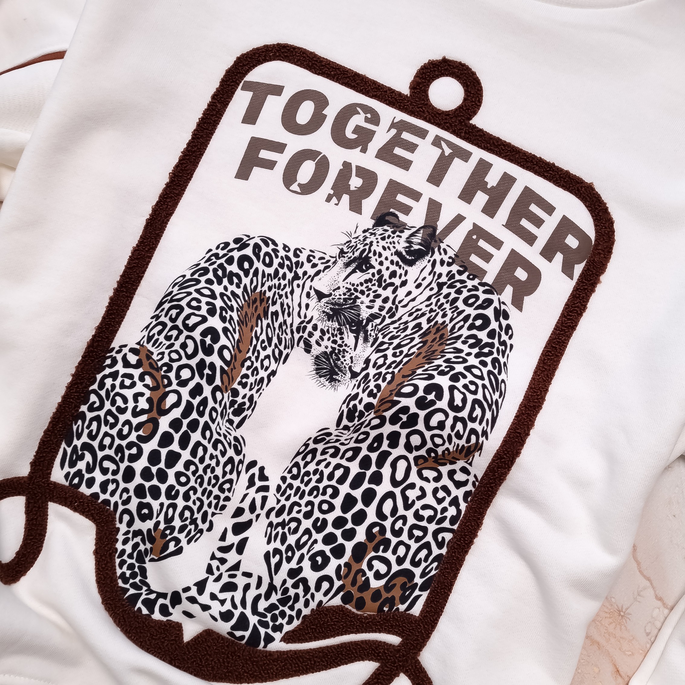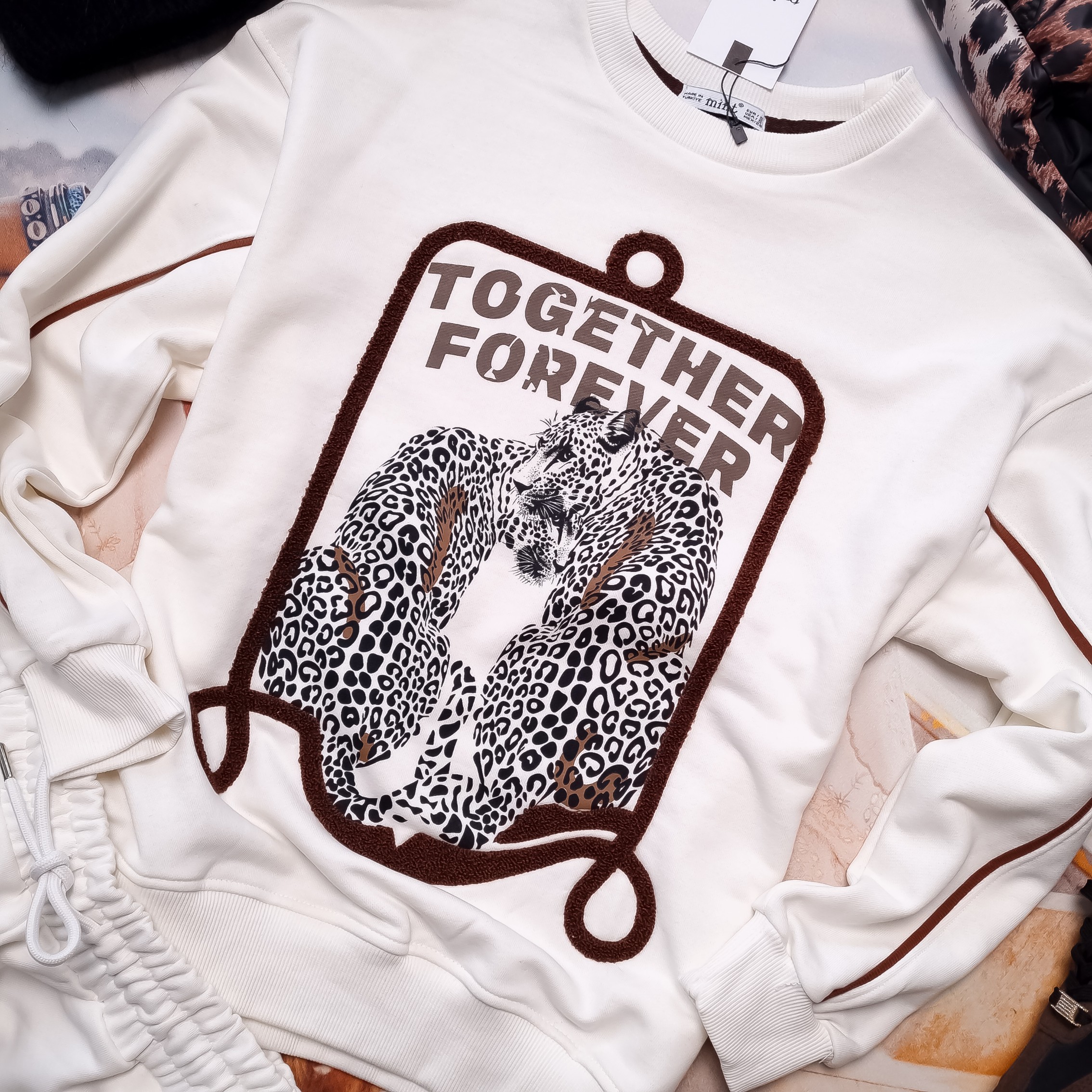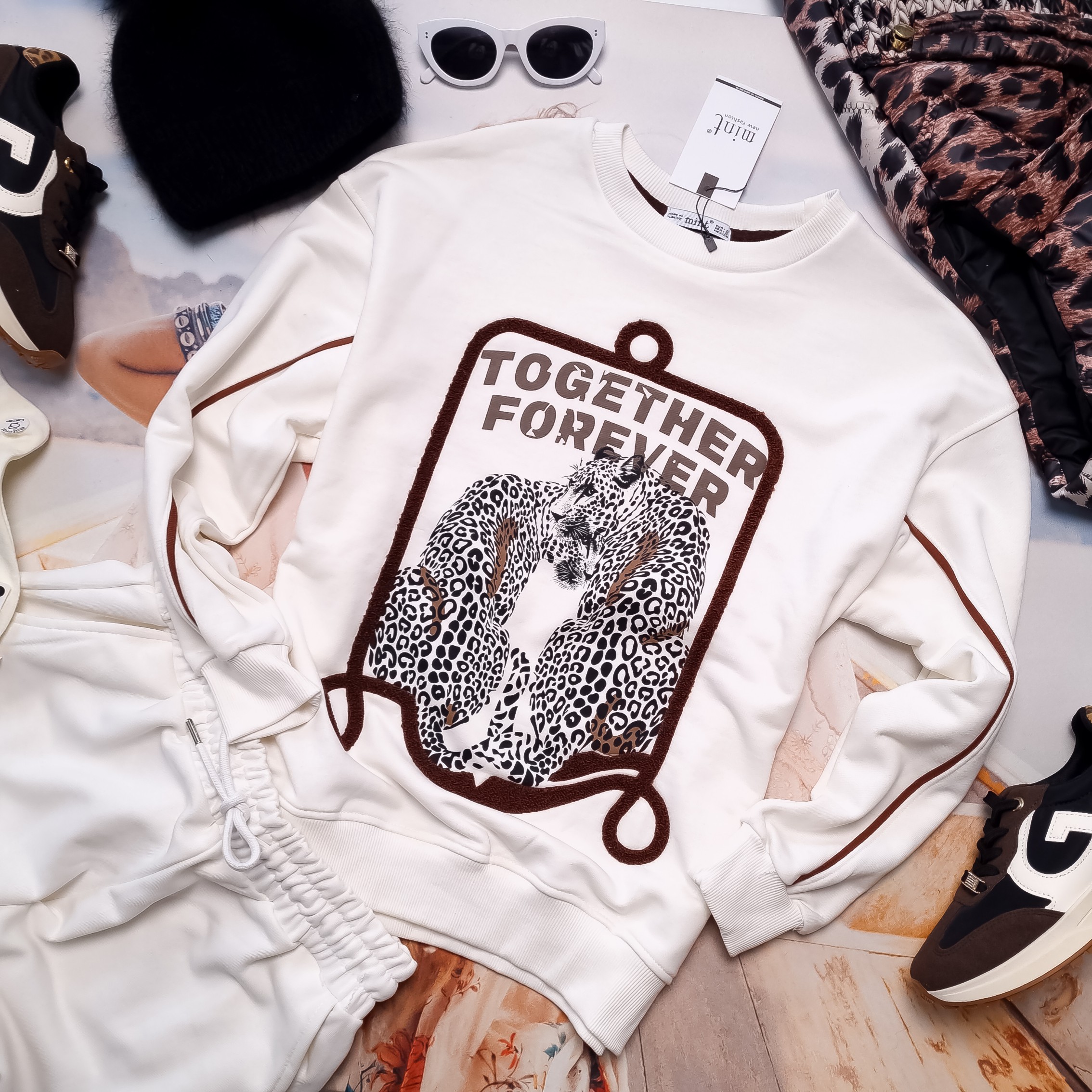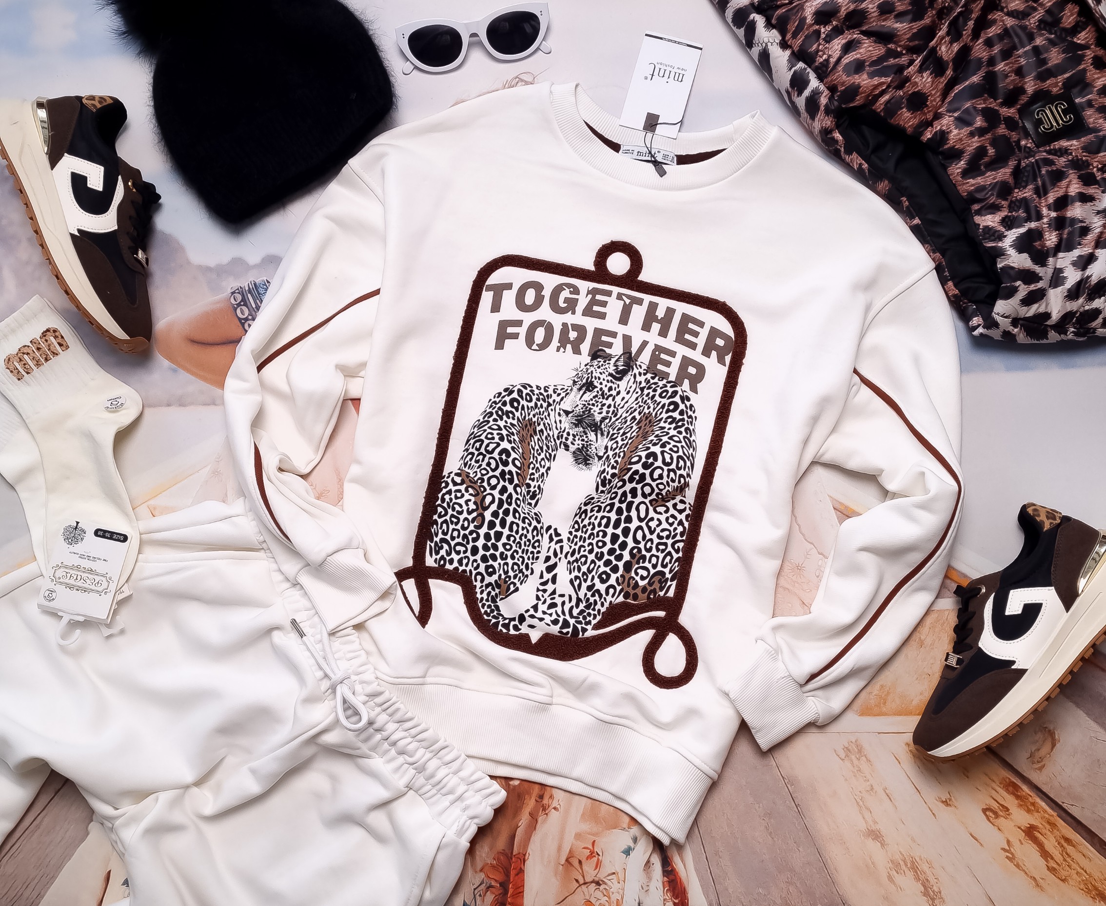 Śliczna bluza w białym kolorze. Wkładana przez głowę. Dekolt okrągły. Rękawy długie, obniżona linia ramion. Fason oversize, nieprzylegający. Wykończona motywem z panterami.