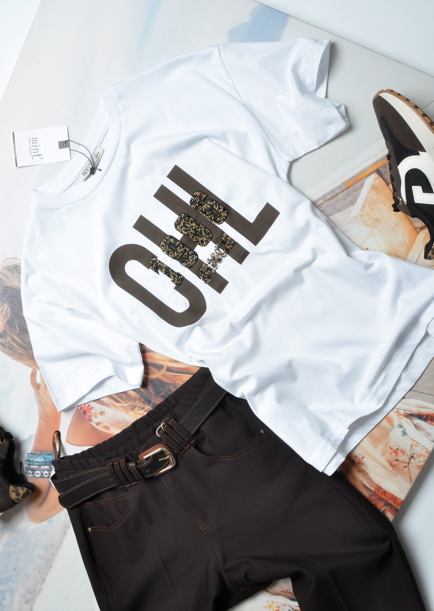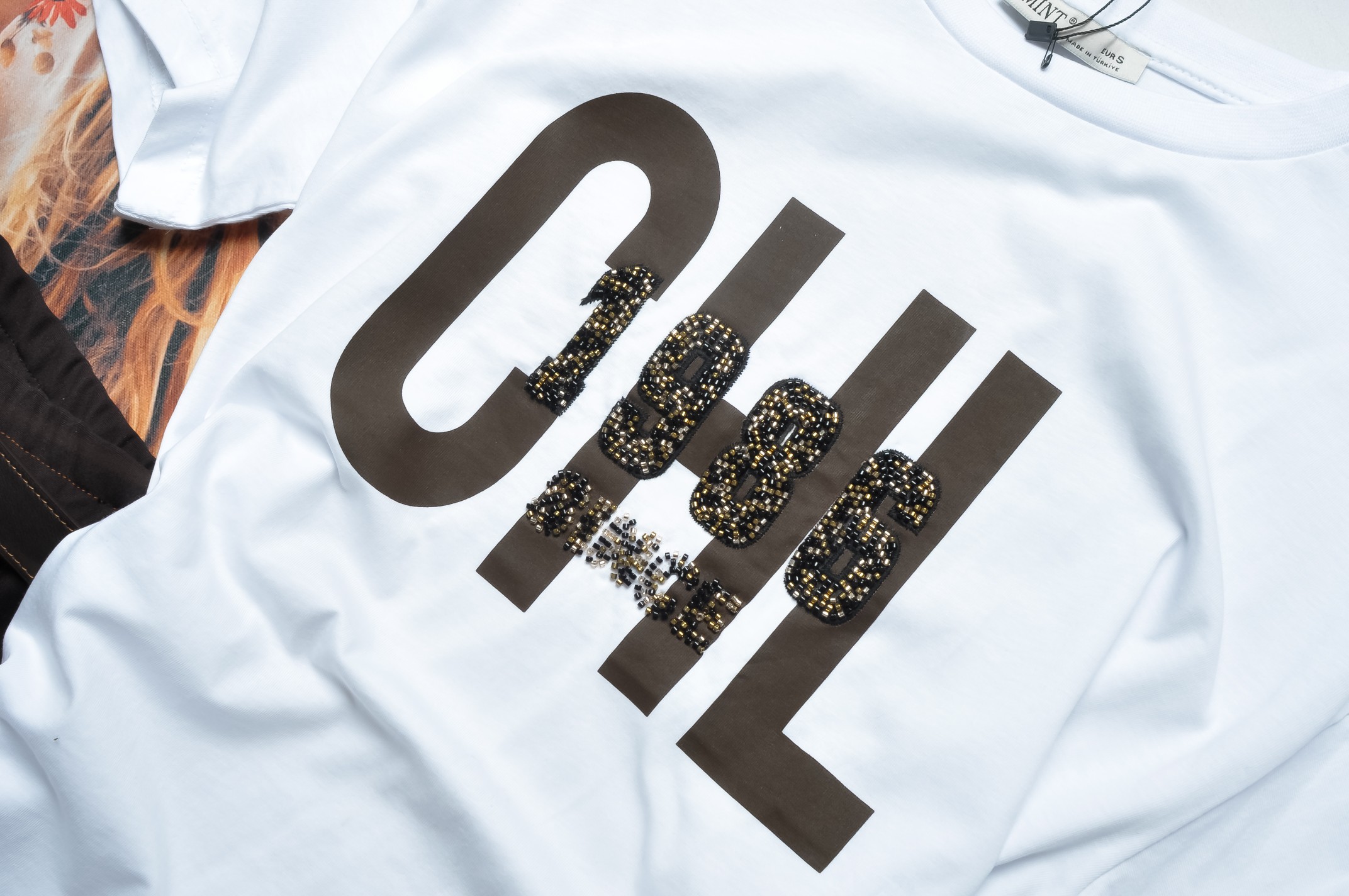 Śliczna bluzka w białym kolorze. Wkładana przez głowę. Dekolt okrągły. Rękawy krótkie. Zdobiona brązowym napisem i napisami wyszywanymi koralikami. Fason oversize, nieprzylegający. Obniżona linia ramion.