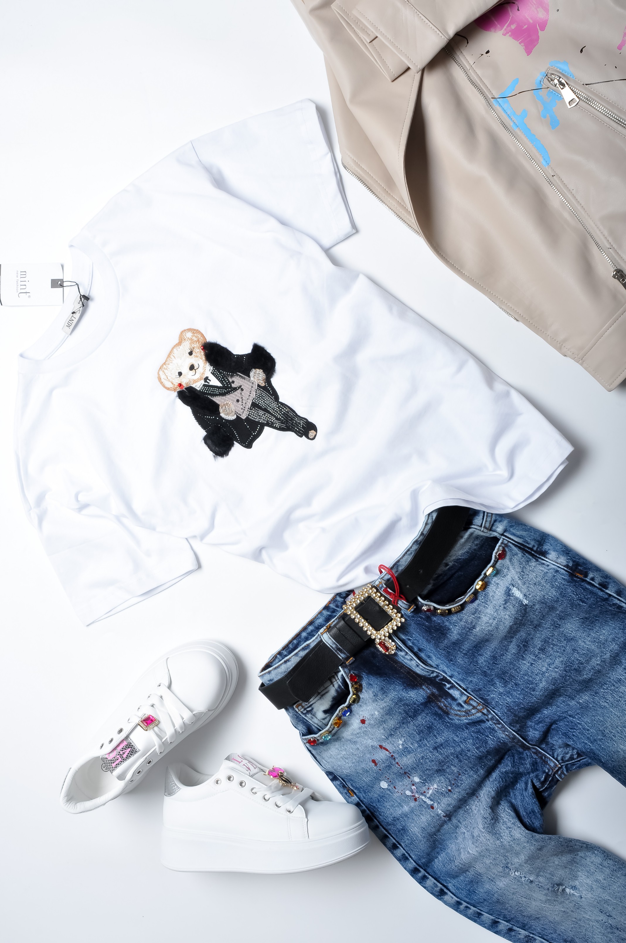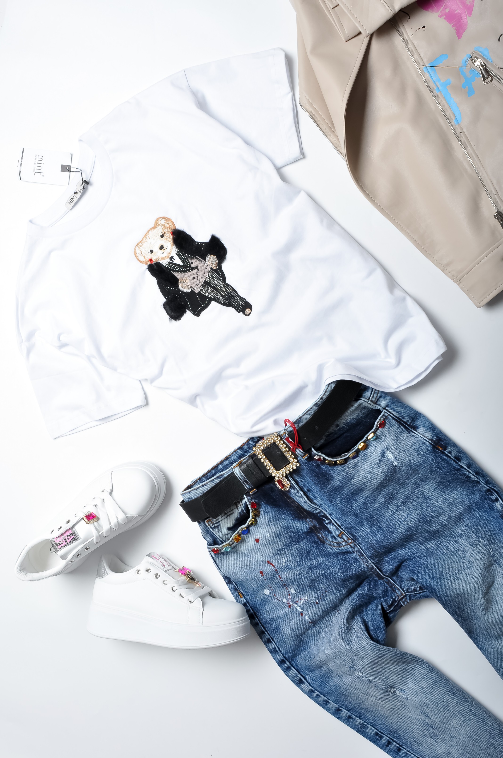Śliczna bluzka w białym kolorze. Wkładana przez głowę. Dekolt okrągły. Rękawy krótkie. Fason oversize, nieprzylegający. Zdobiona uroczym misiem z futerkiem i cyrkoniamii.