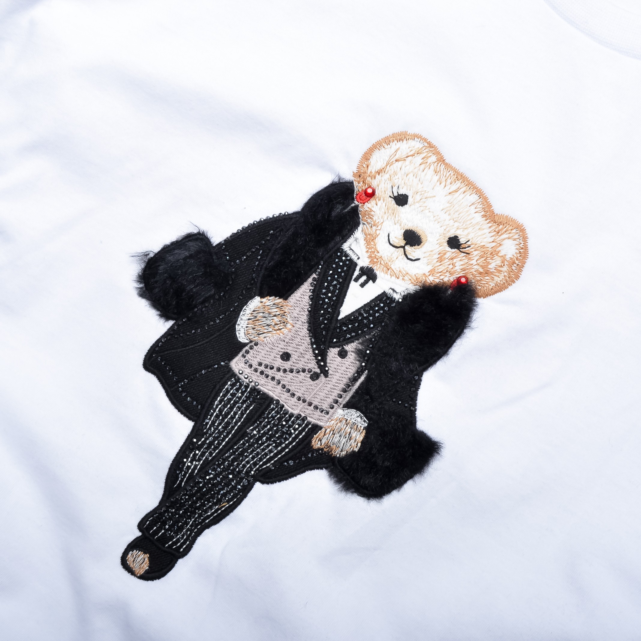 Śliczna bluzka w białym kolorze. Wkładana przez głowę. Dekolt okrągły. Rękawy krótkie. Fason oversize, nieprzylegający. Zdobiona uroczym misiem z futerkiem i cyrkoniamii.