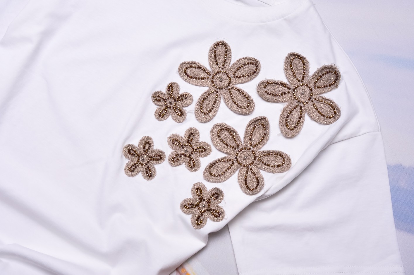 Śliczna bluzka w białym kolorze. Wkładana przez głowę. Dekolt okrągły. Rękawy krótkie. Zdobiona wyszywanymi kwiatami i koralikami. Fason oversize, nieprzylegający. Obniżona linia ramion.