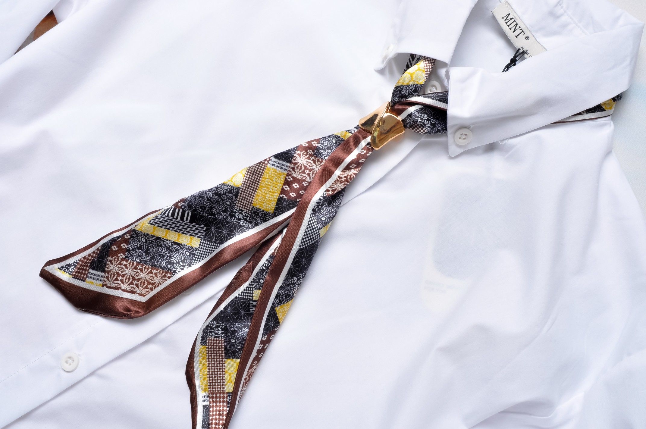 Gładka koszula w białym kolorze. Zapinana na guziki. Rękawy wykończone mankietami, z możliwością podwinięcia. Krój prosty. Posiada kołnierzyk i w zestawie ozdobny fular.