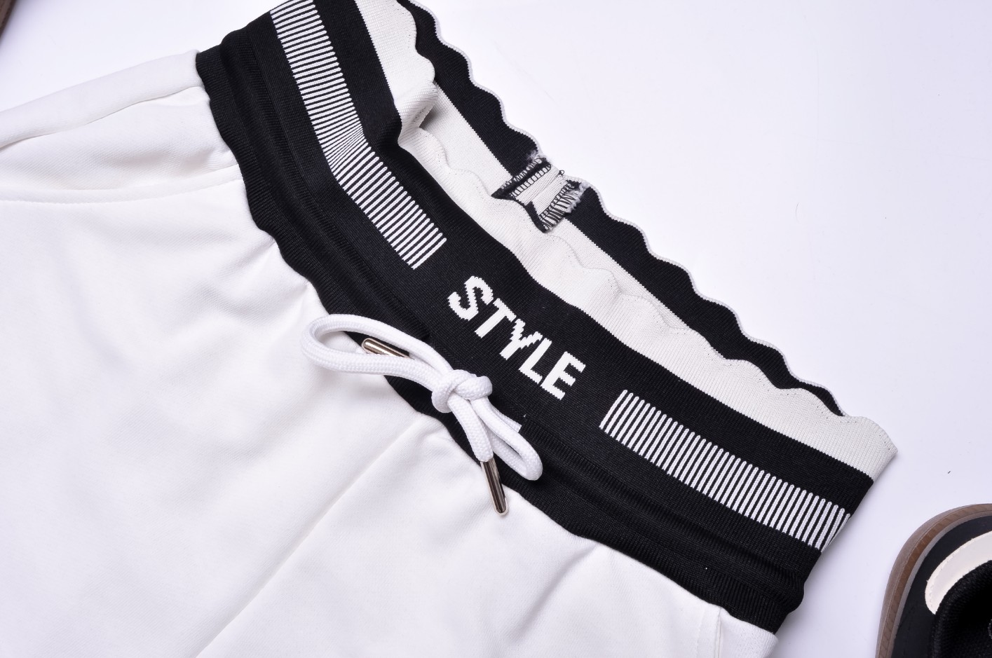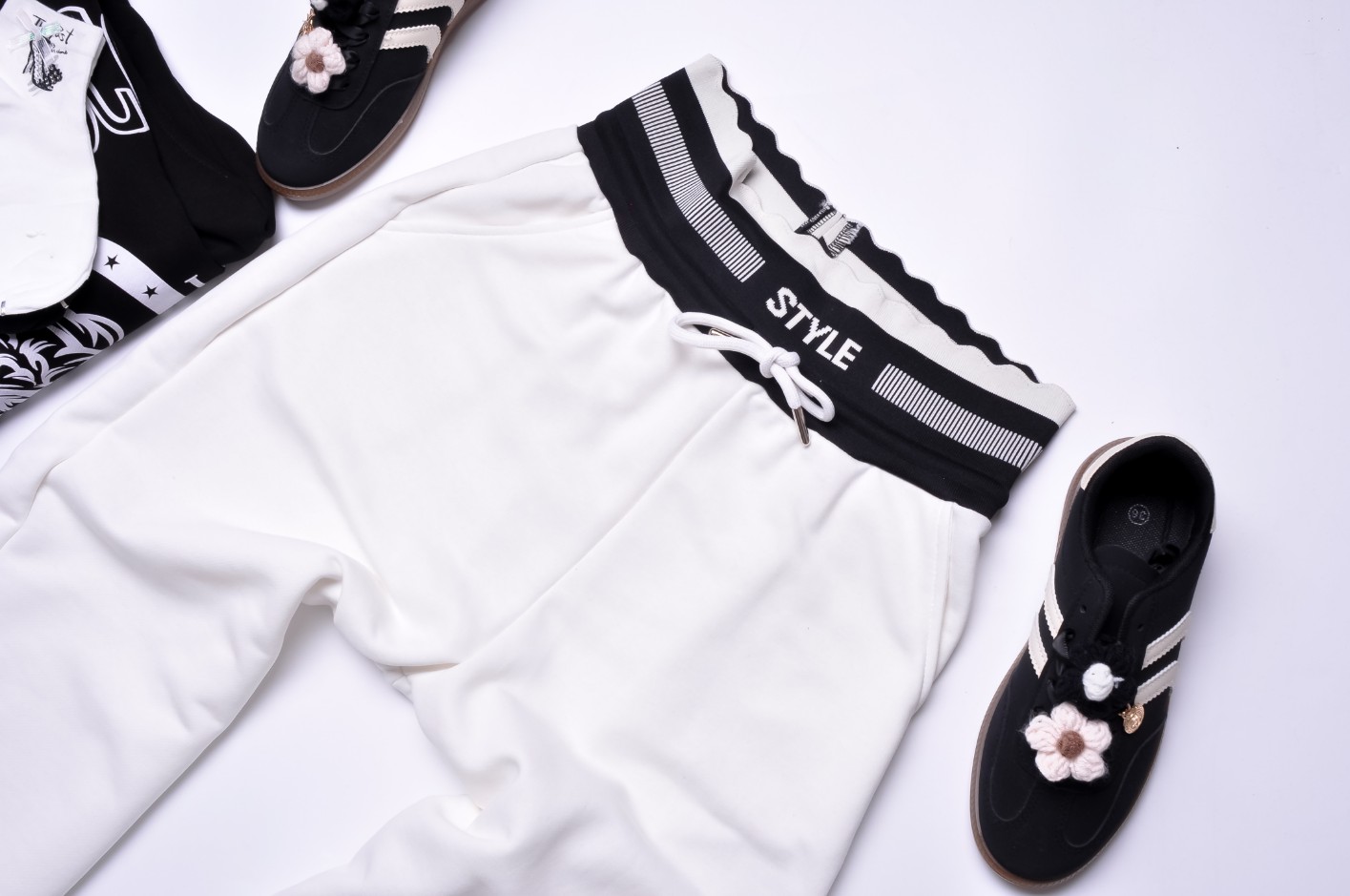 Spodnie w białym kolorze. W pasie szeroka gumka dla lepszego dopasowania i sznurek. Nogawki szerokie. Po bokach kieszenie.
