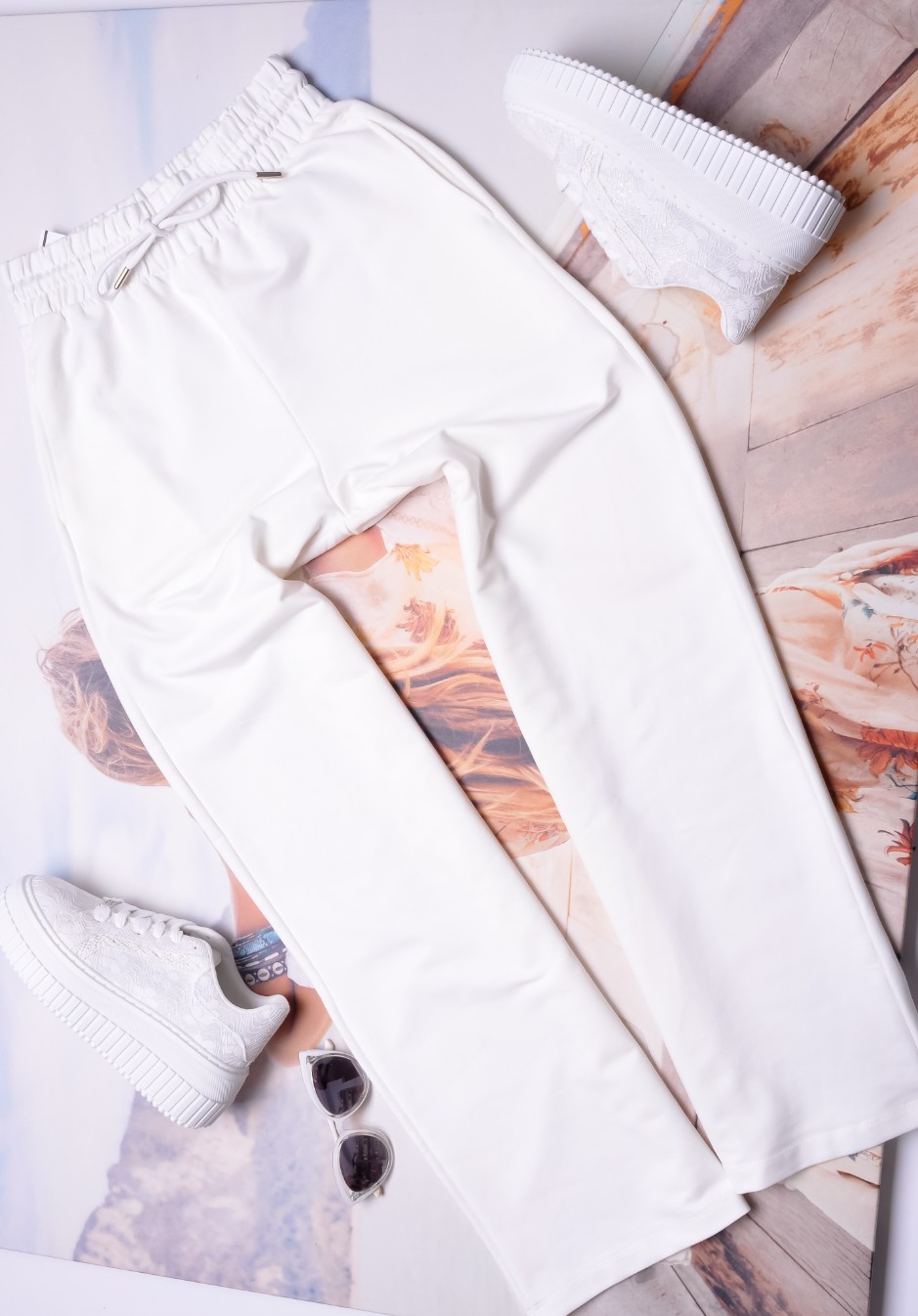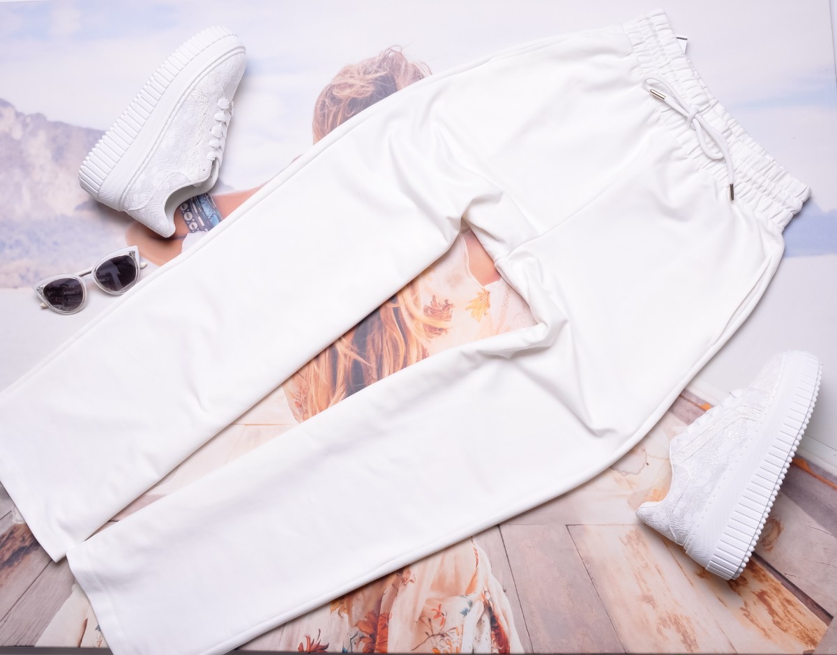 Spodnie w białym kolorze. W pasie gumka i sznureczek dla lepszego dopasowania. Nogawki szerokie. Po bokach kieszenie.