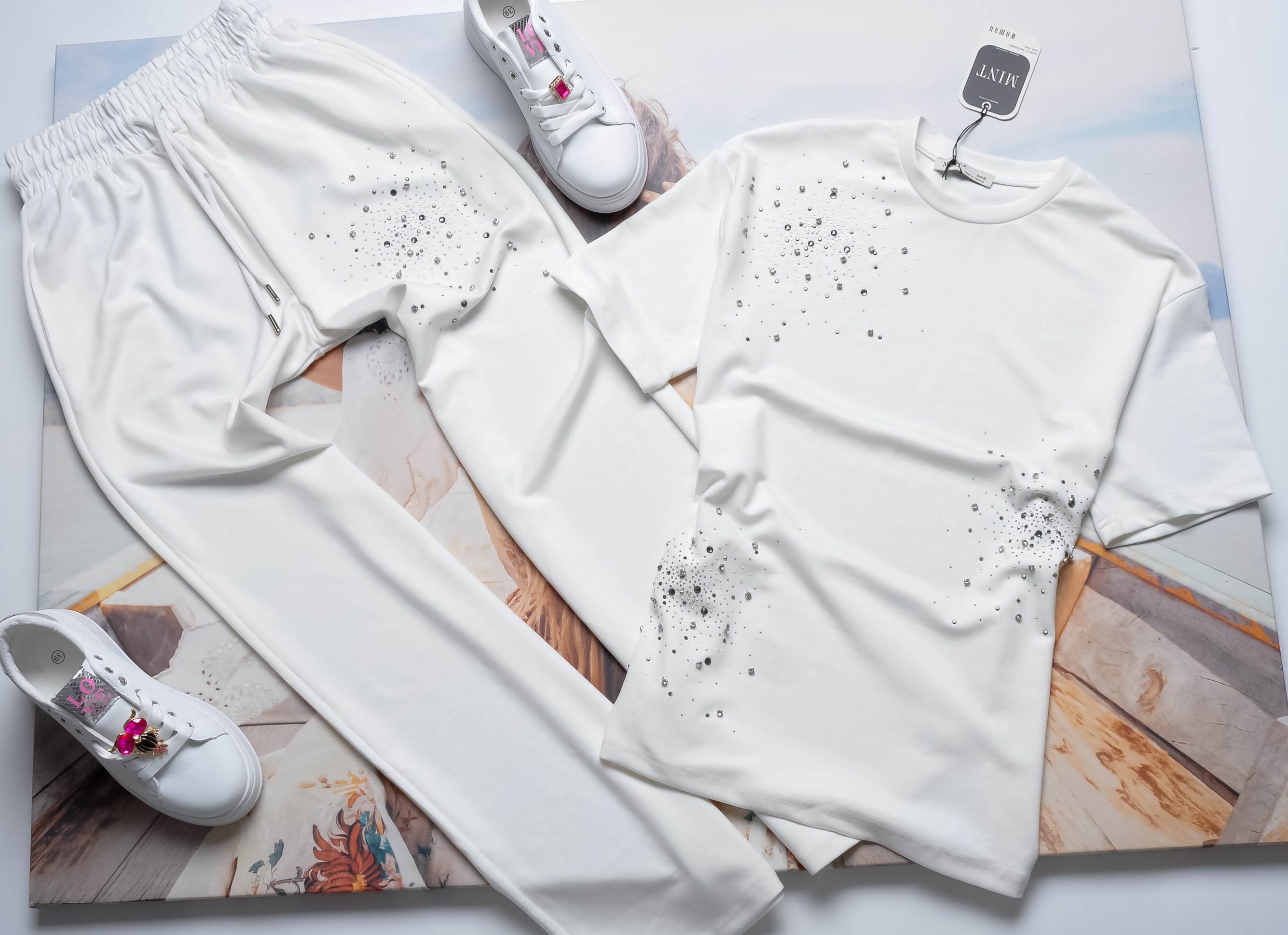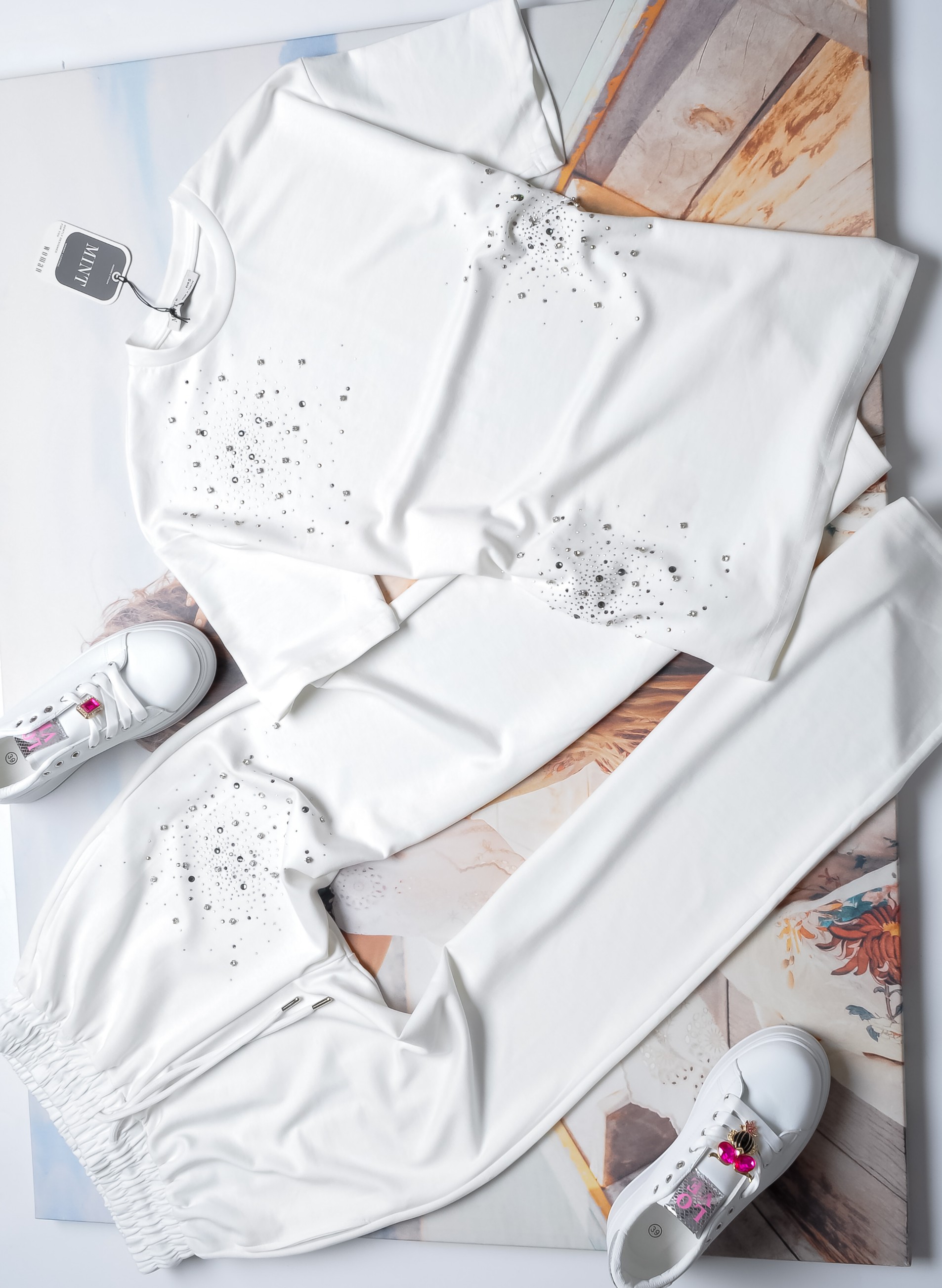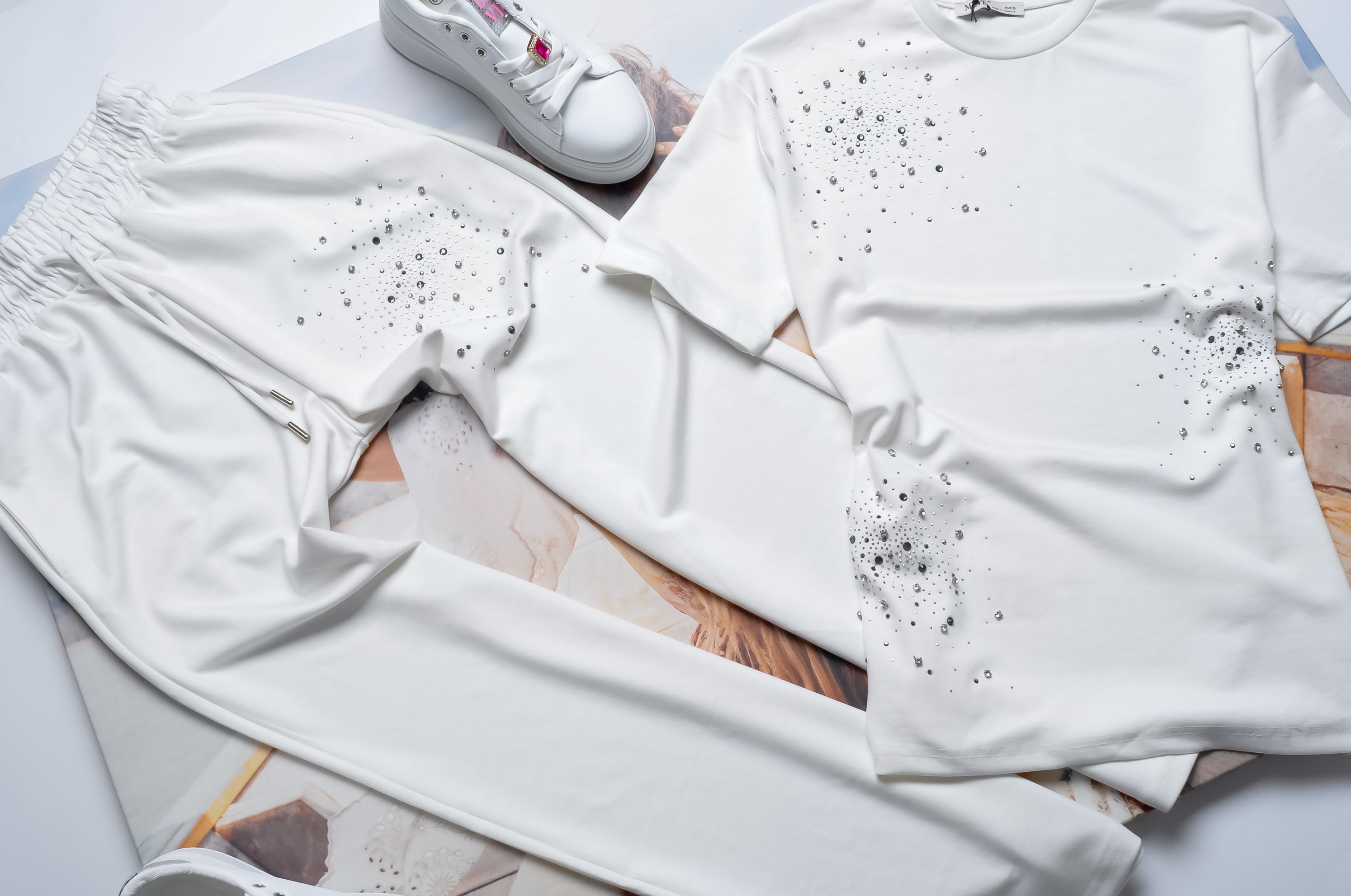 Dwuczęściowy dres składający się z bluzki i spodni w białym kolorze. Komplet bogato zdobiony cyrkoniami.