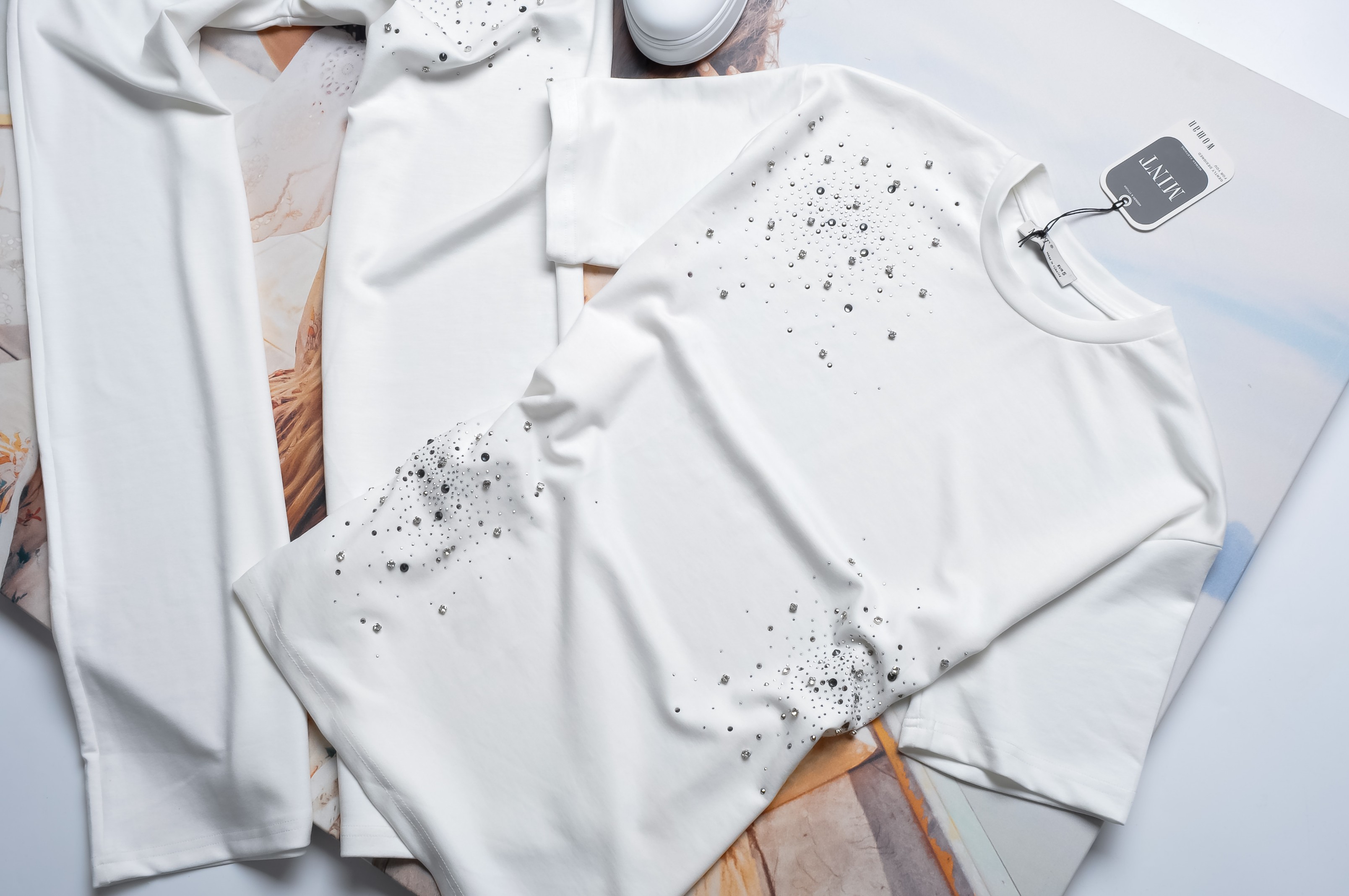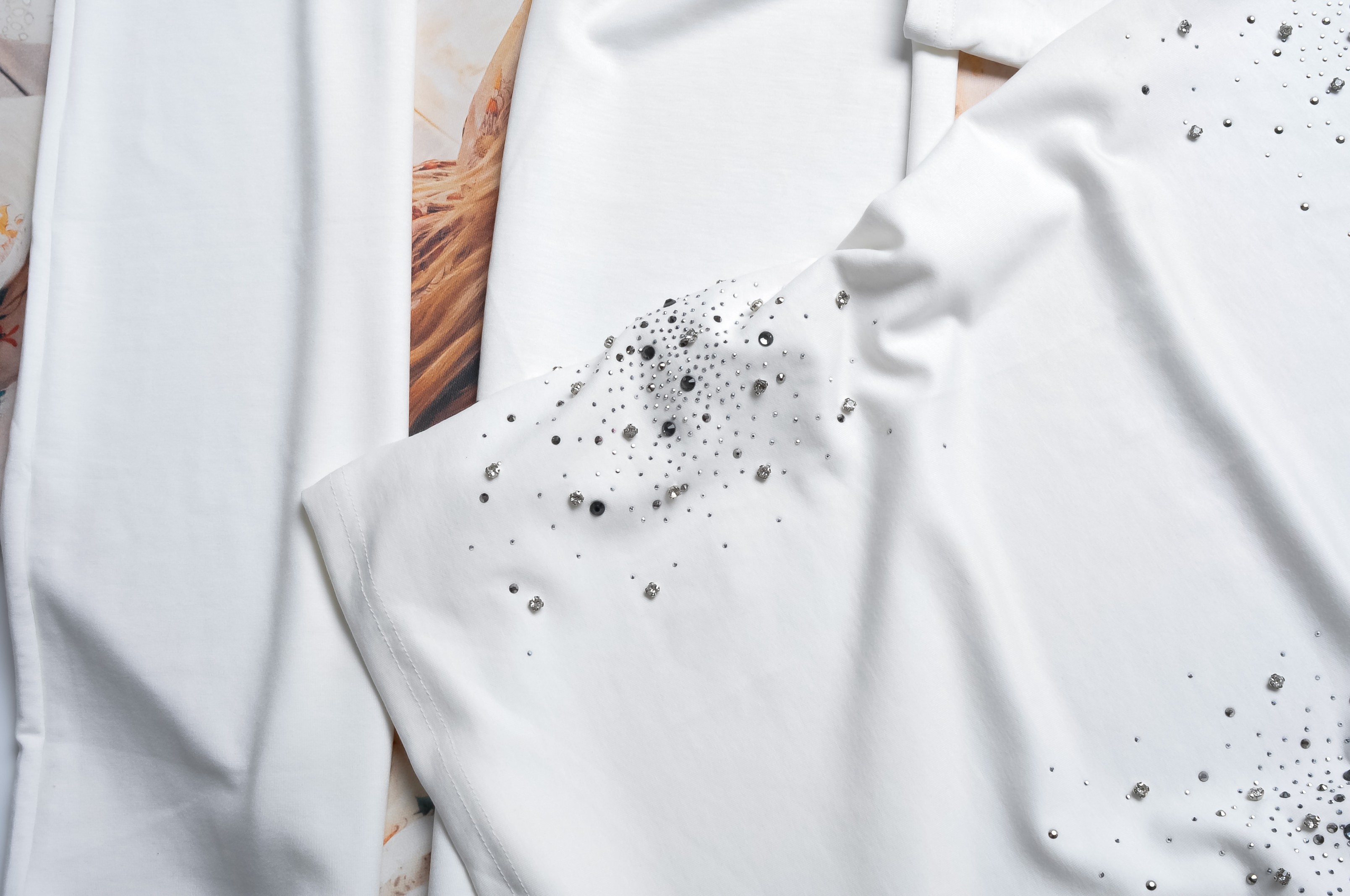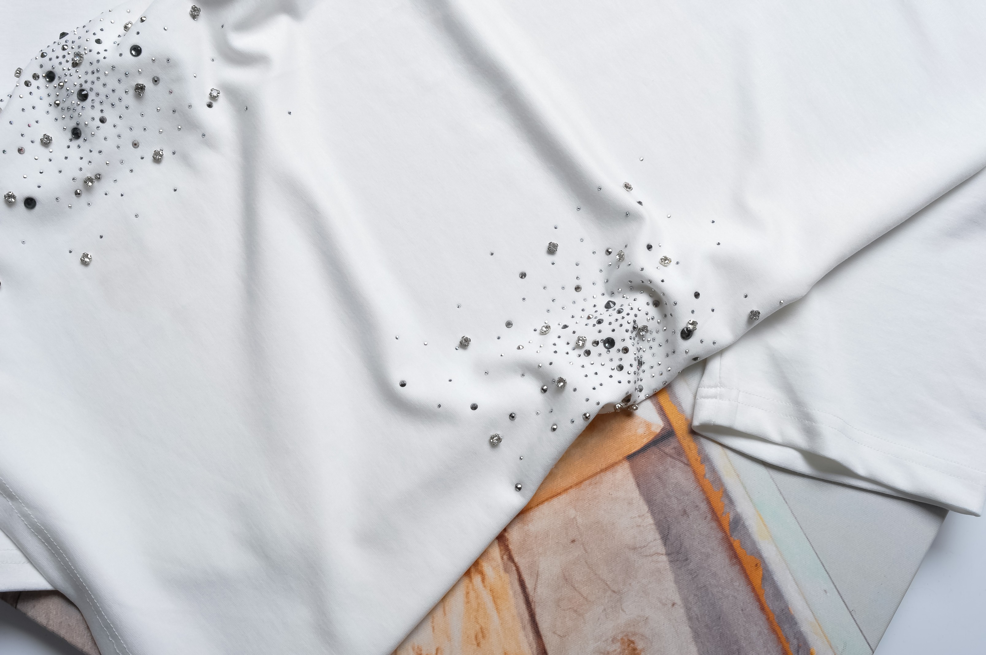 Dwuczęściowy dres składający się z bluzki i spodni w białym kolorze. Komplet bogato zdobiony cyrkoniami.