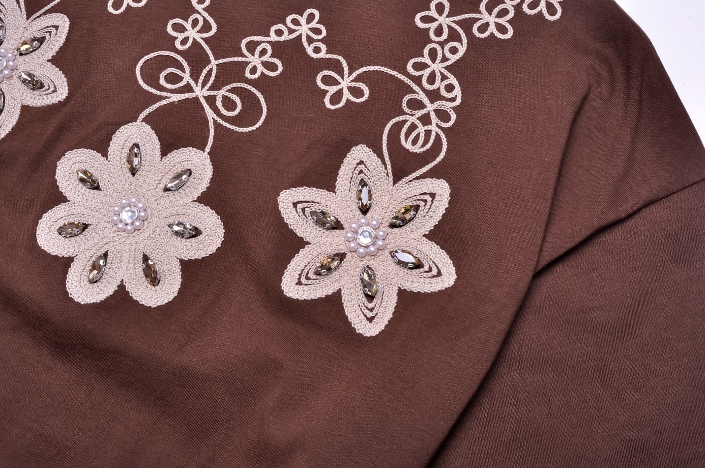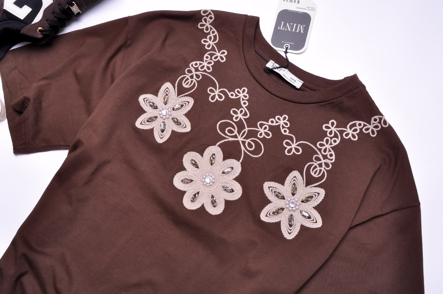 Śliczna bluzka w brązowym kolorze. Wkładana przez głowę. Dekolt okrągły. Rękawy krótkie. Zdobiona wyszywanymi beżowymi kwiatami i wzorami. Kwiaty wykończone są cyrkoniami i perełkami. Fason oversize, nieprzylegający. Obniżona linia ramion.