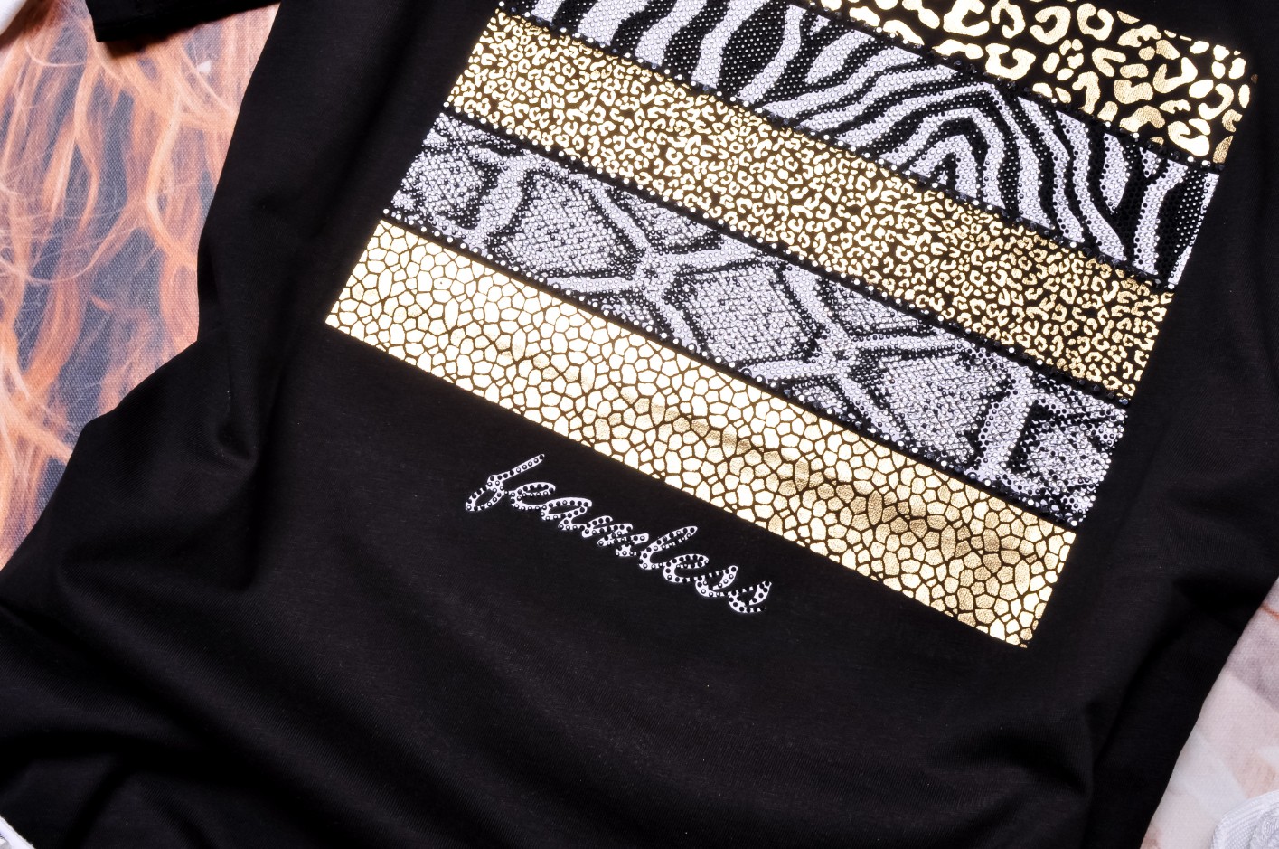 Śliczna bluzka w czarna kolorze. Wkładana przez głowę. Dekolt okrągły. Rękawy krótkie. Zdobiona aplikacją zwierzęcych wzorów wykończoną cyrkoniami. Fason oversize, nieprzylegający. Obniżona linia ramion.