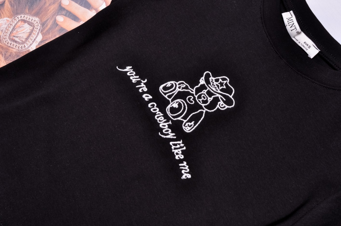Śliczna, krótsza bluzka w czarnym kolorze wykończona wyszywanym misiem kowbojem i napisami. Wkładana przez głowę. Dekolt okrągły. Z krótkimi rękawkami.