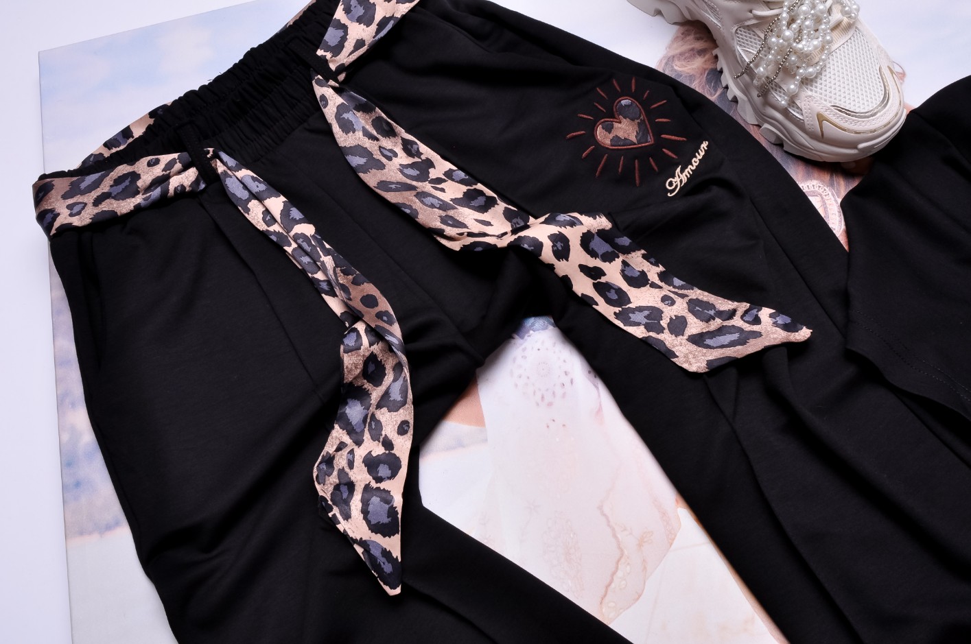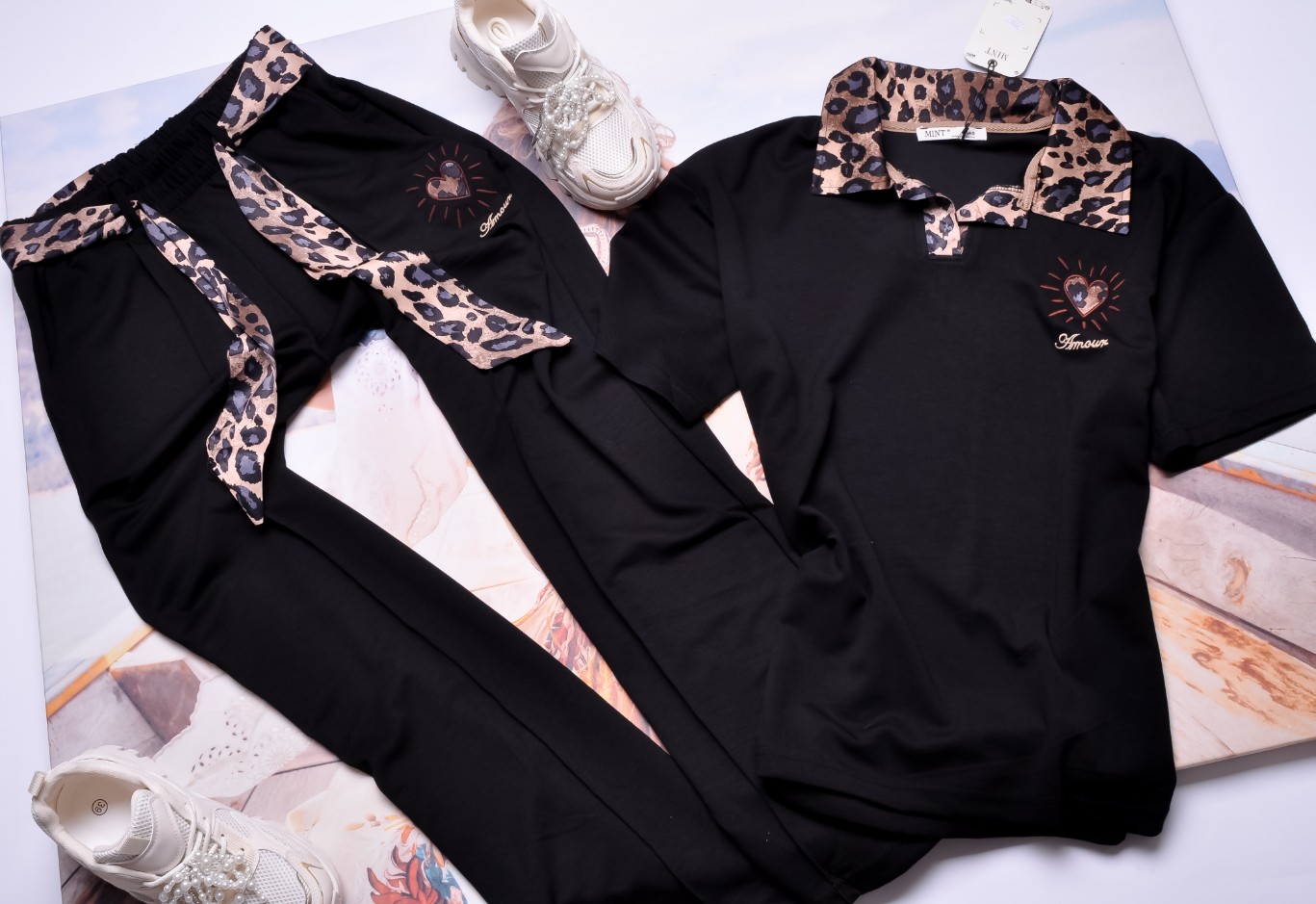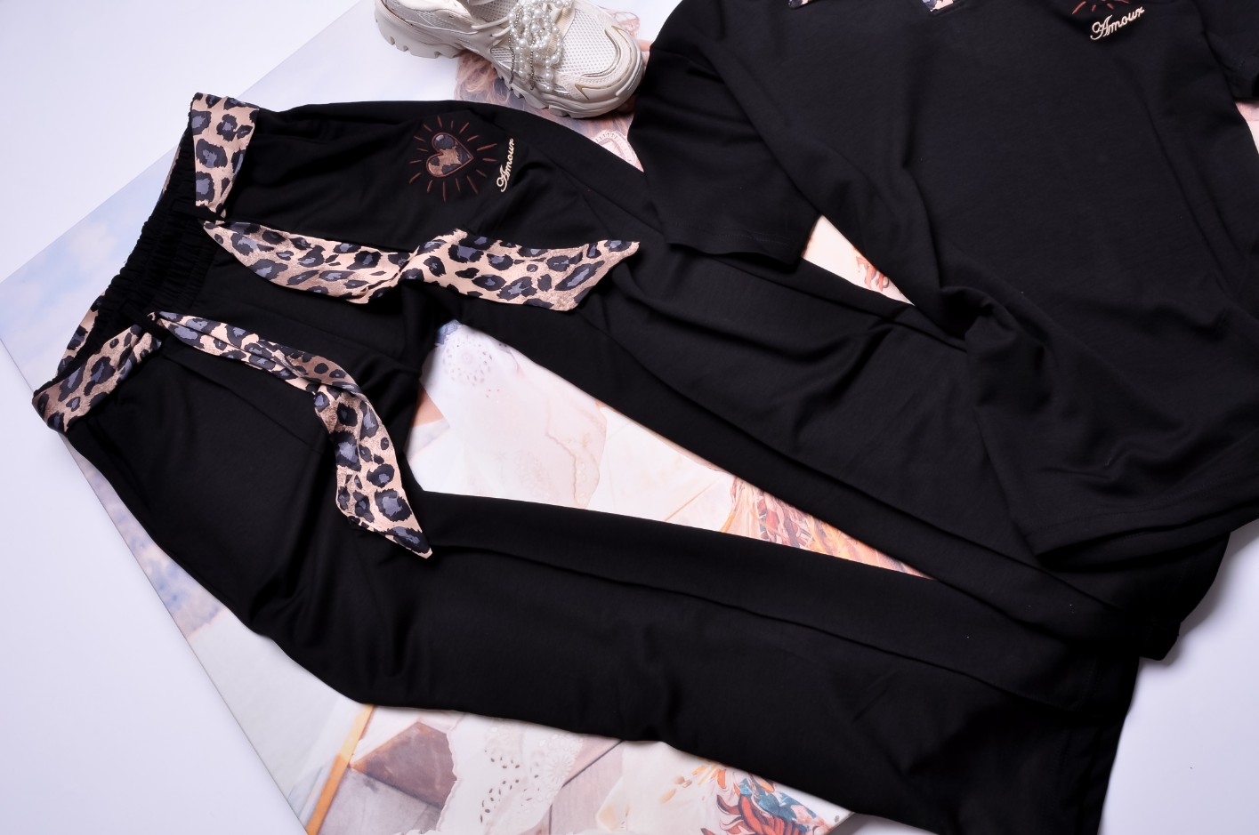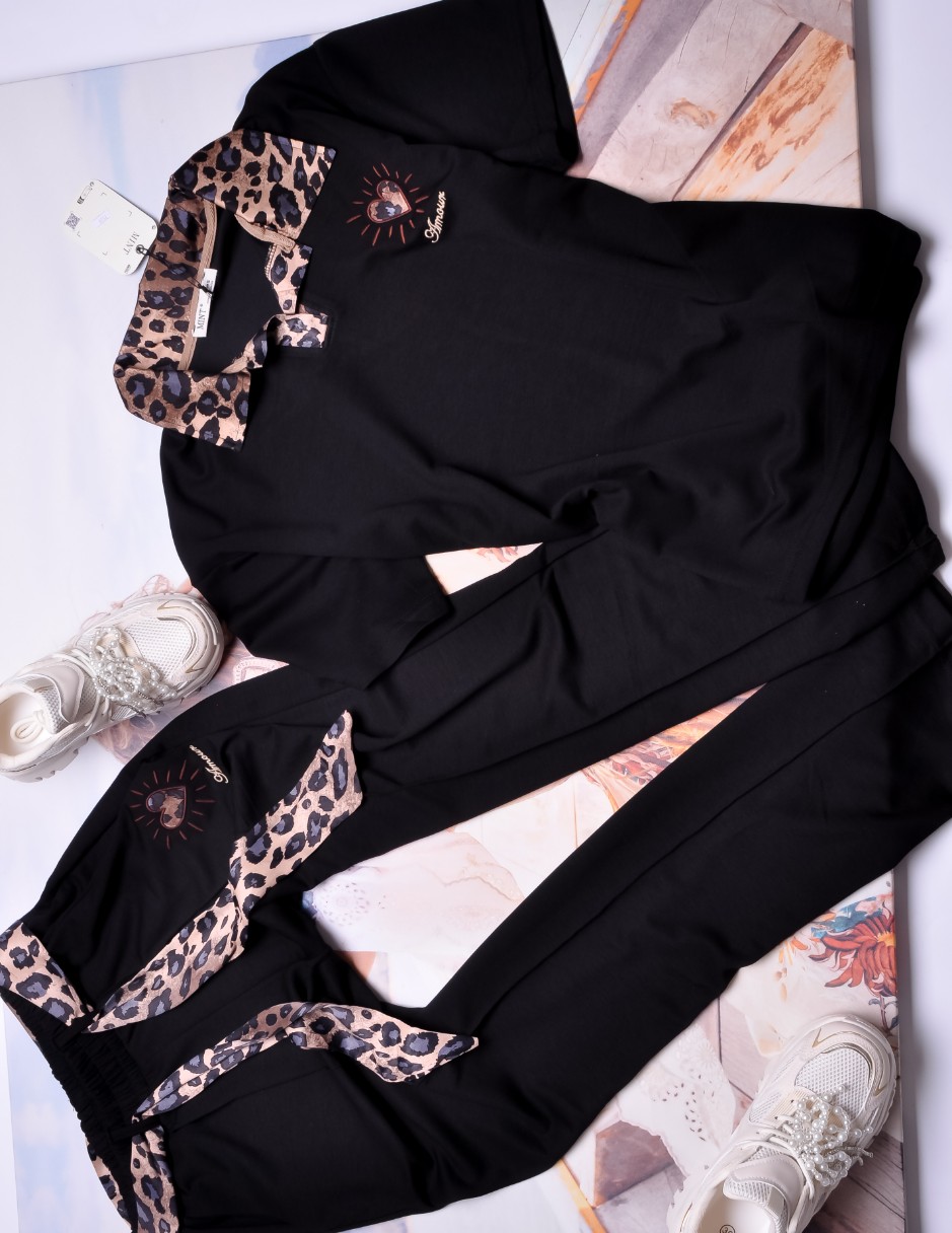 Dwuczęściowy dres składający się z bluzki i spodni w czarnym kolorze.