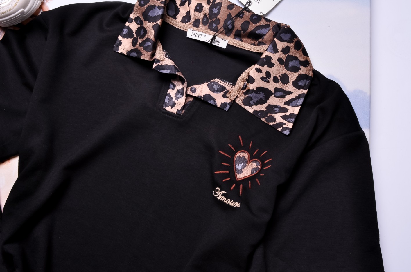 Bluzka o fasonie luźnym, nieprzylegającym. Rękawy krótkie. Z panterkowym kołnierzykiem. Linia ramion obniżona. Z lewej strony aplikacja.
