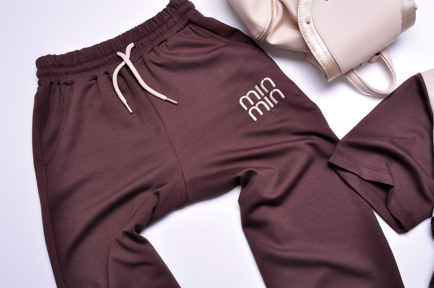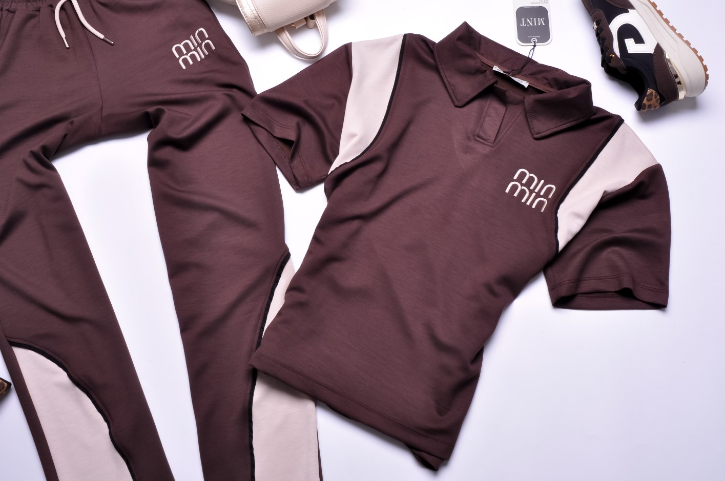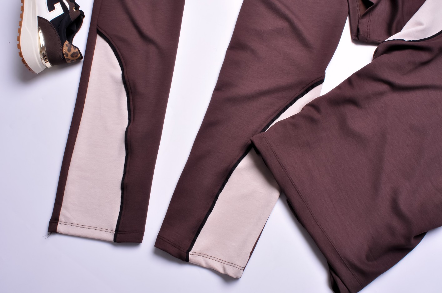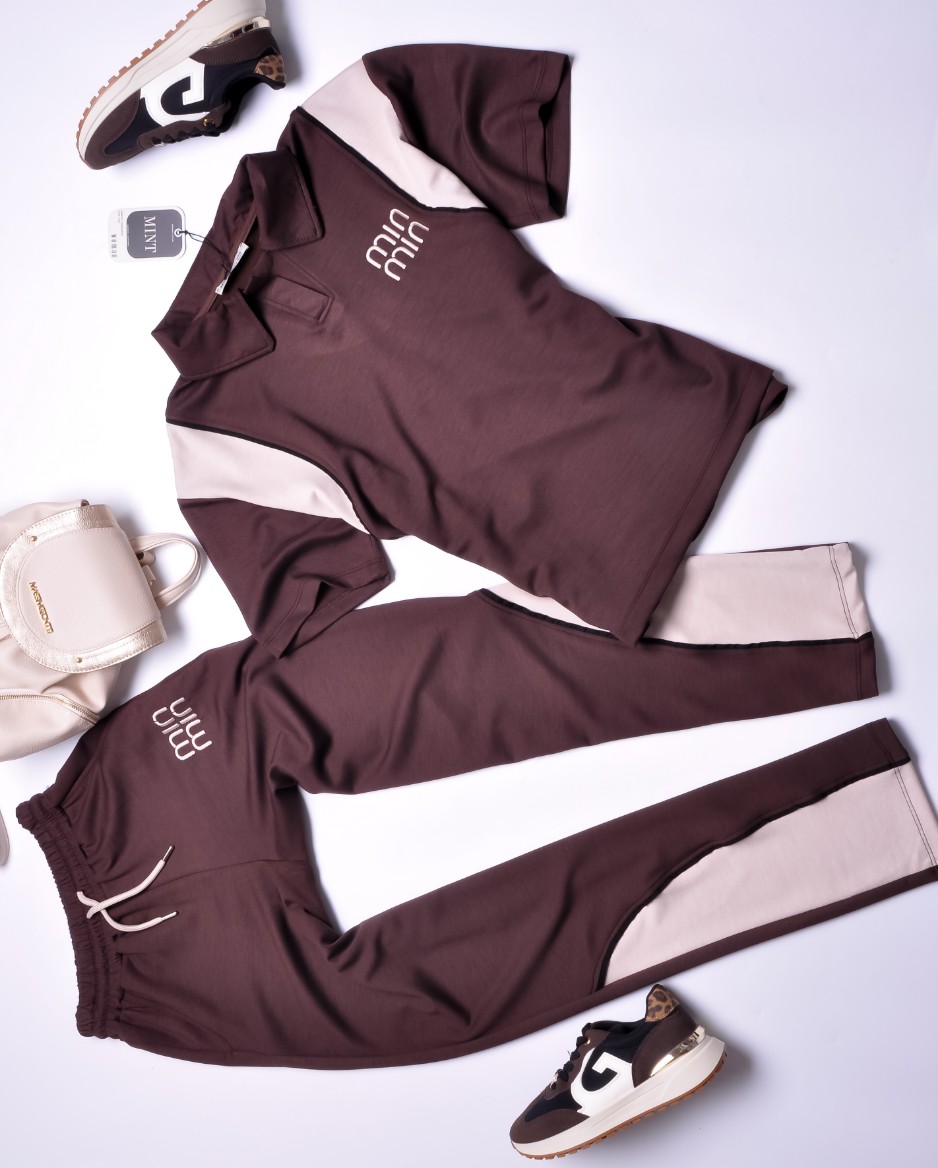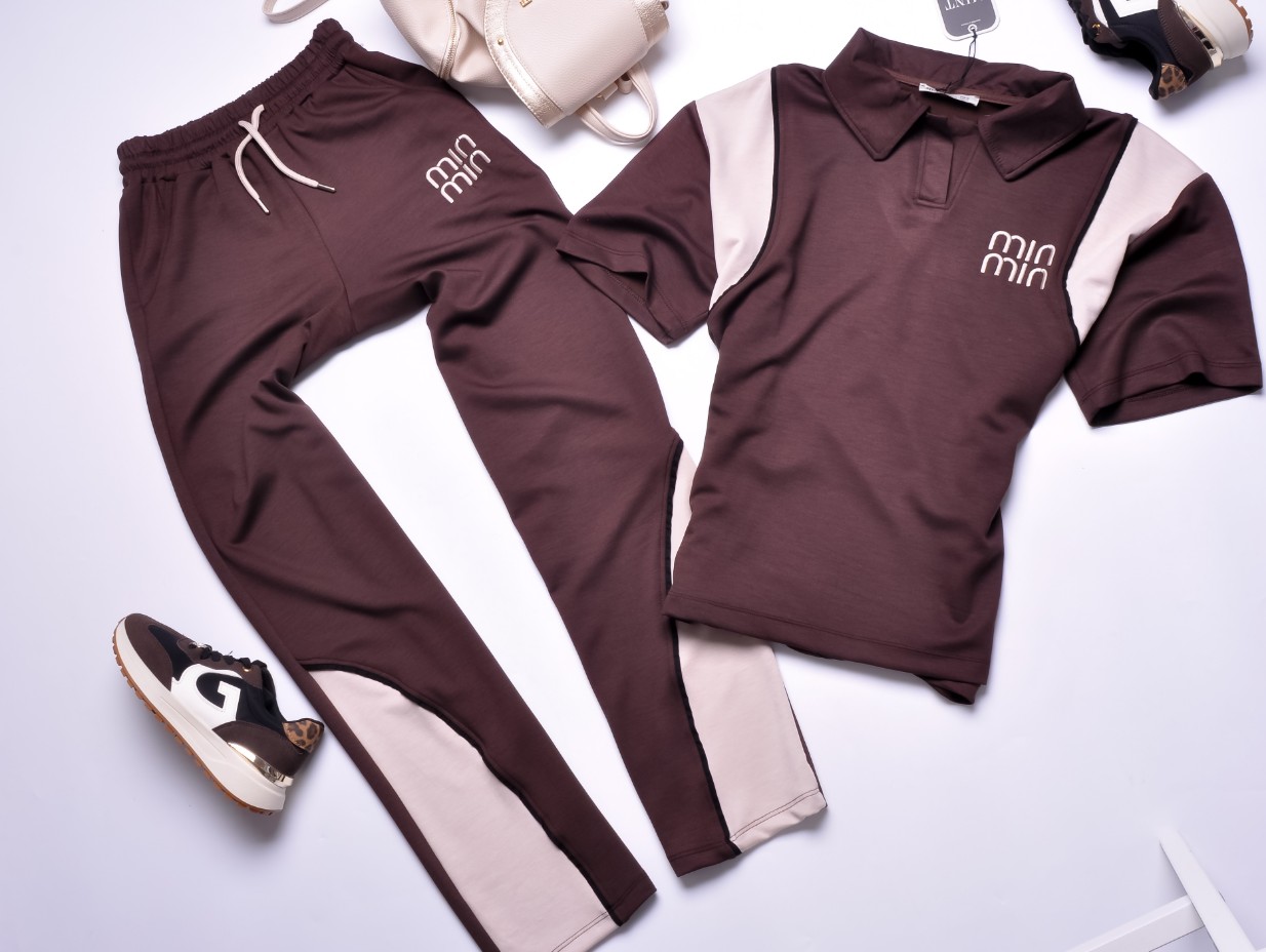 Dwuczęściowy dres składający się z bluzki i spodni w czekoladowym kolorze.